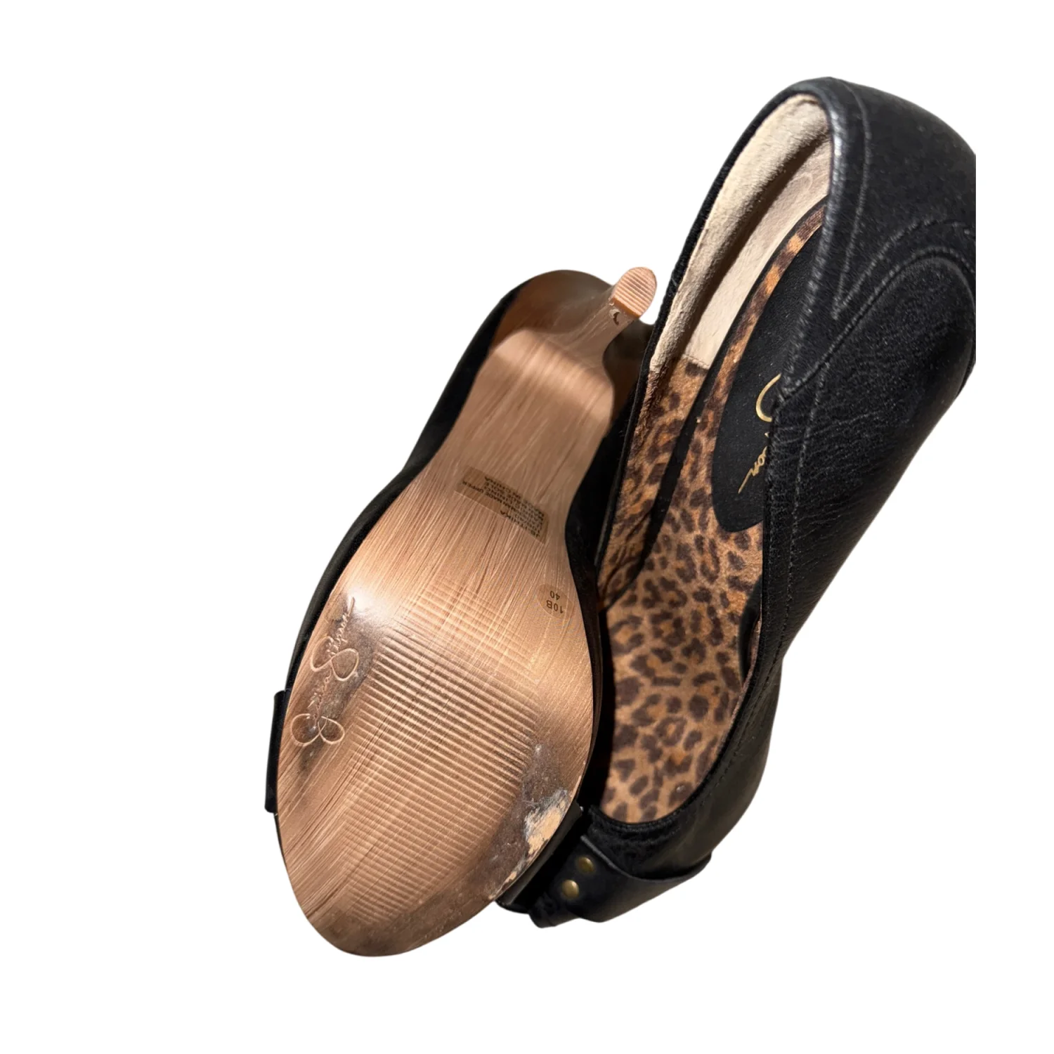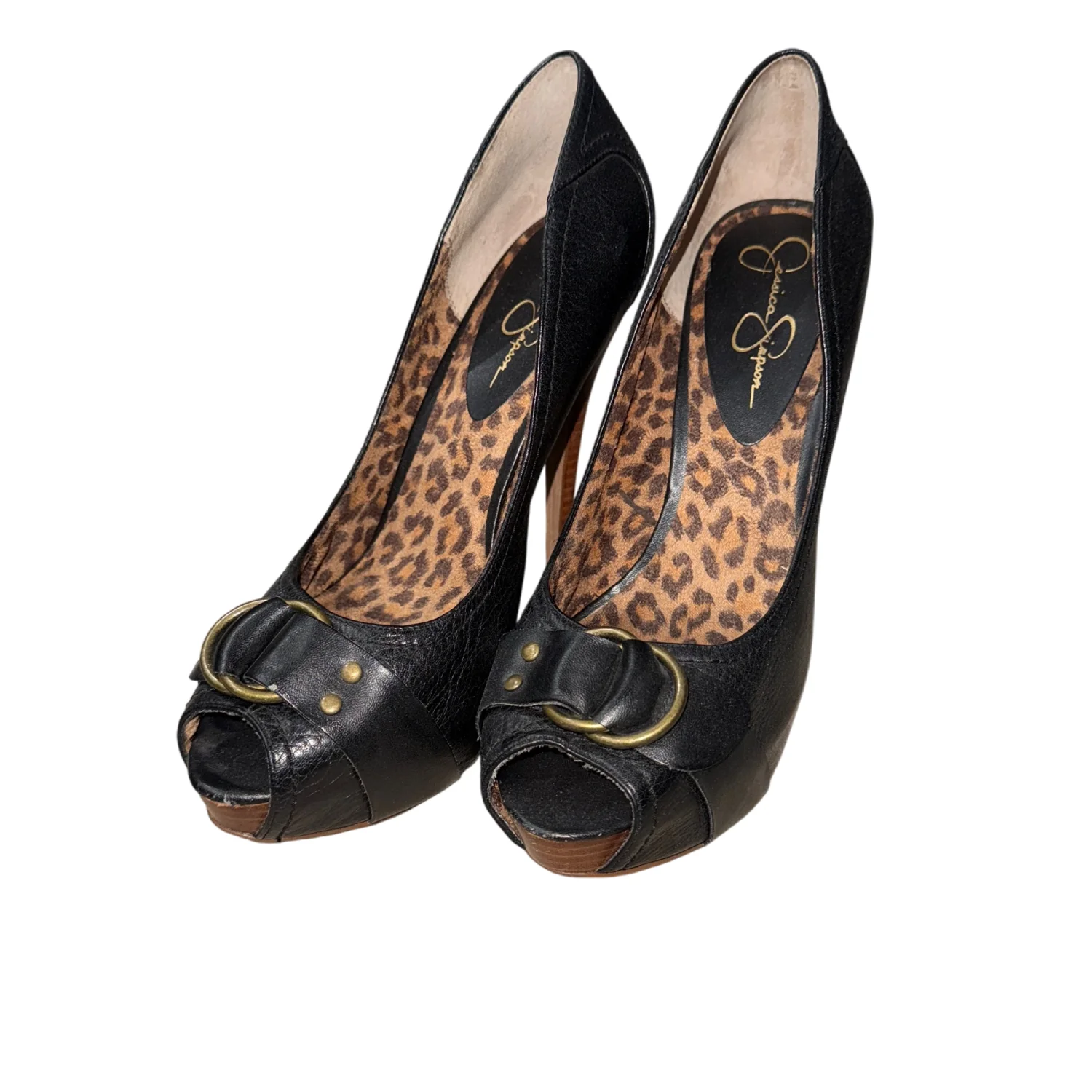 Black peep toe heels featuring a chic gold buckle on the front. The interior is lined with a trendy leopard print, adding a pop of design.