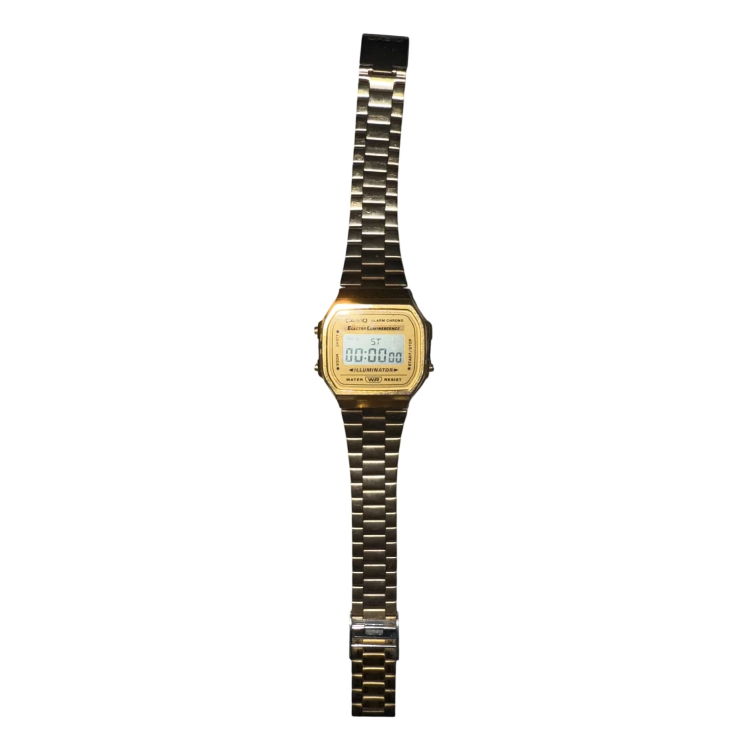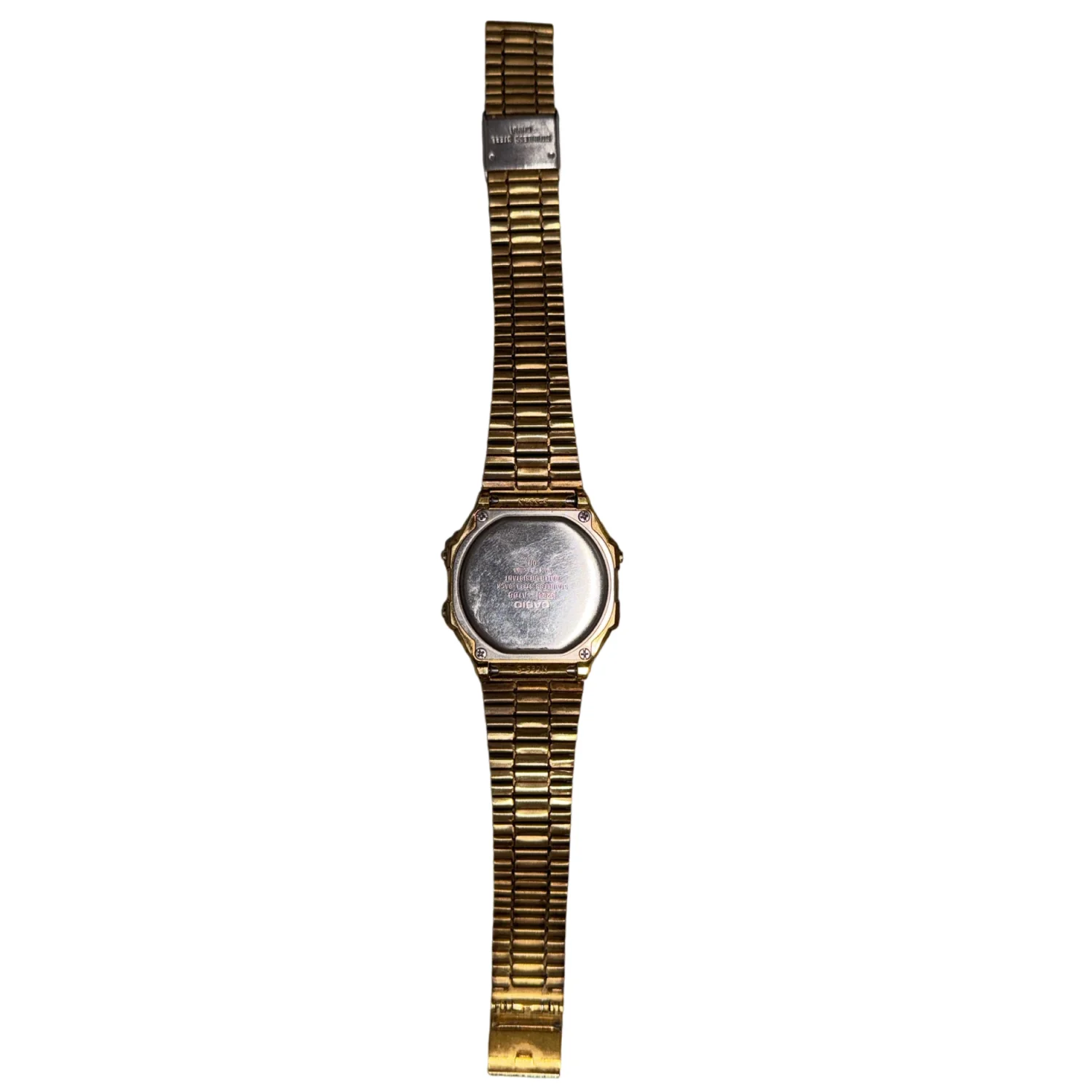 Vintage digital watch features a gold-tone stainless steel band and a classic digital display.