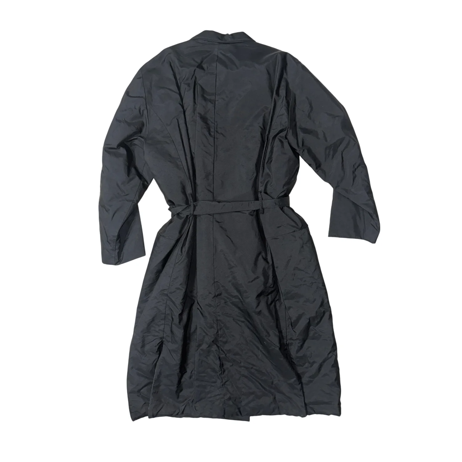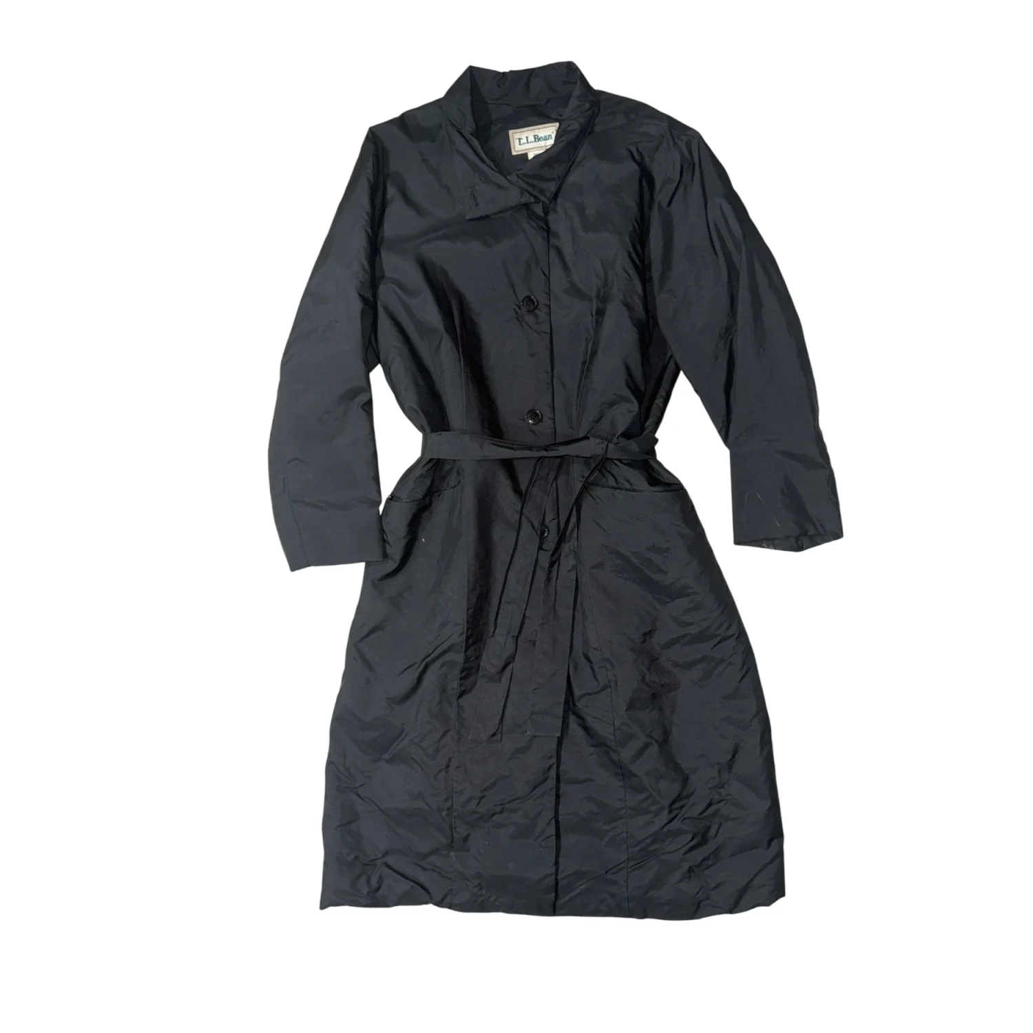 Classic black trench coat by L.L. Bean, featuring a belted waist for a flattering fit. The coat secures with buttons and is crafted from water-resistant material, ideal for transitional weather.