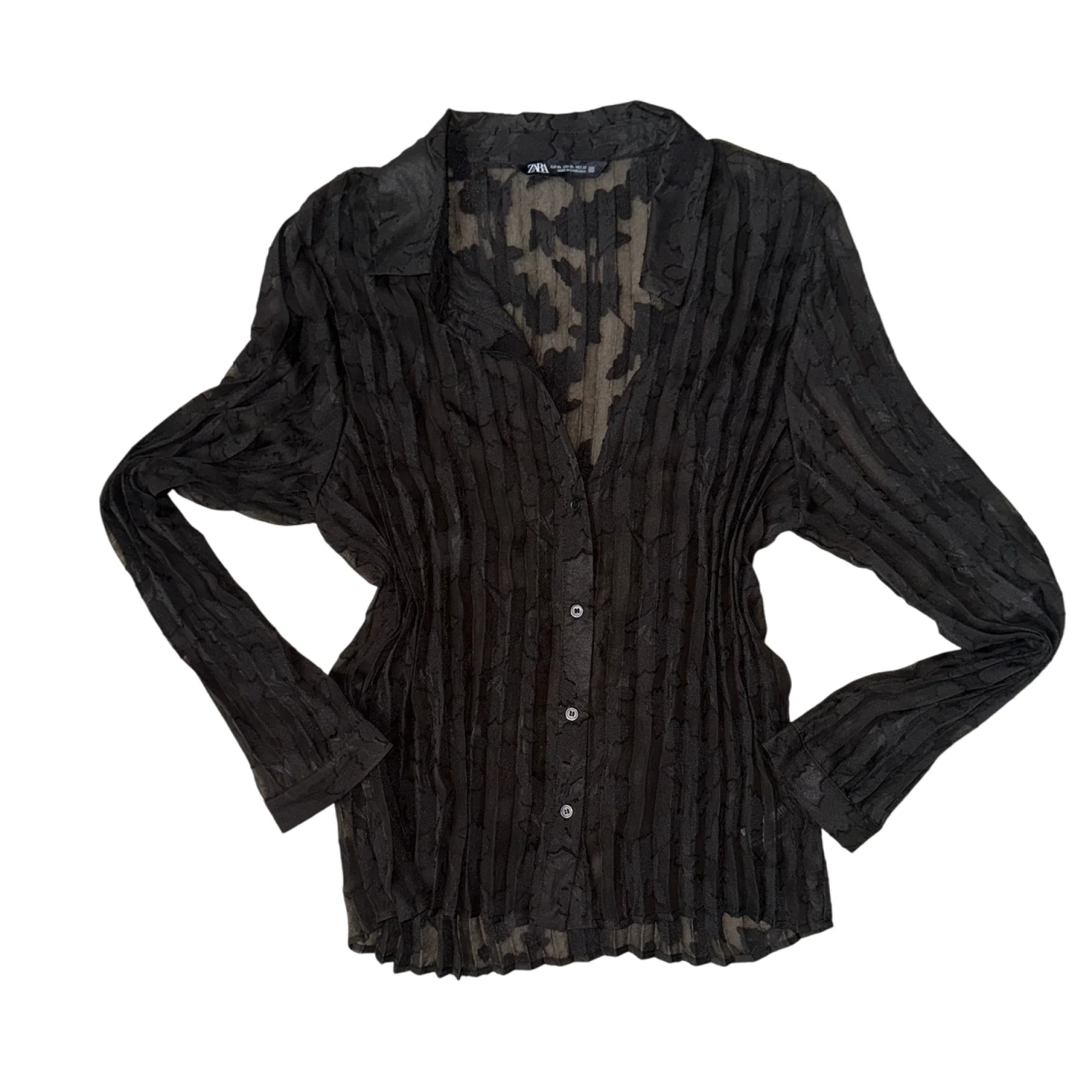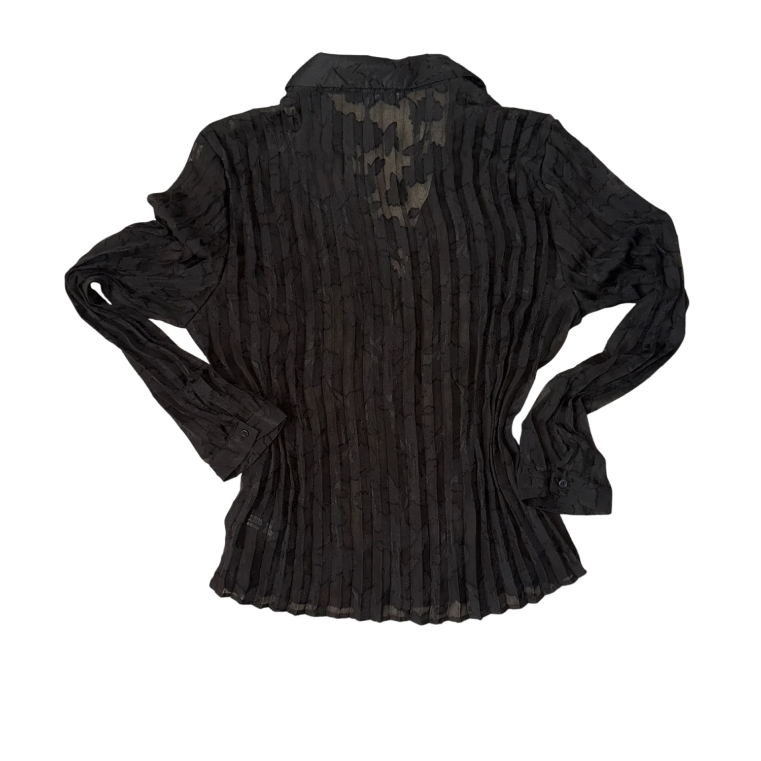 This sheer black blouse features a vertical stripe pattern with long sleeve.