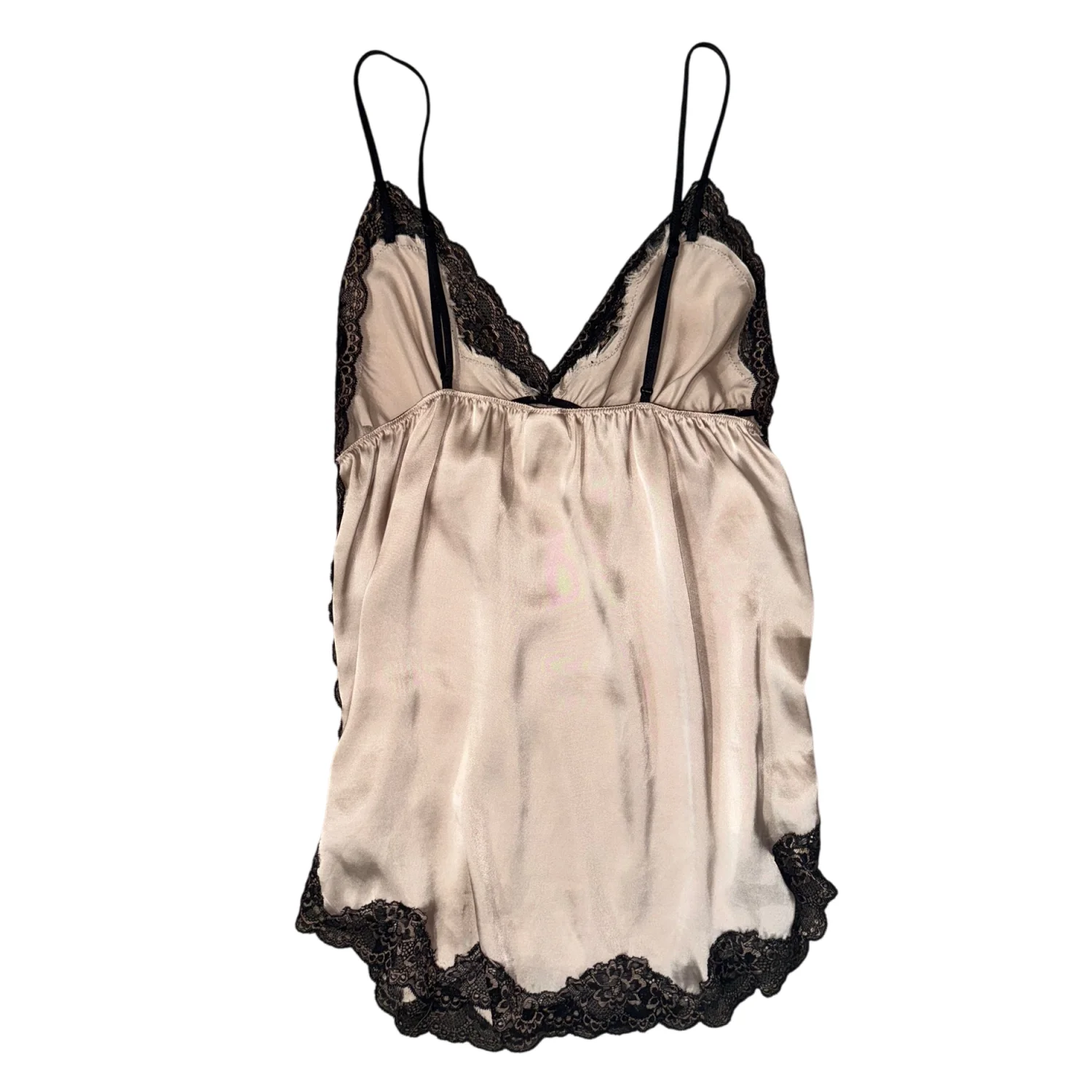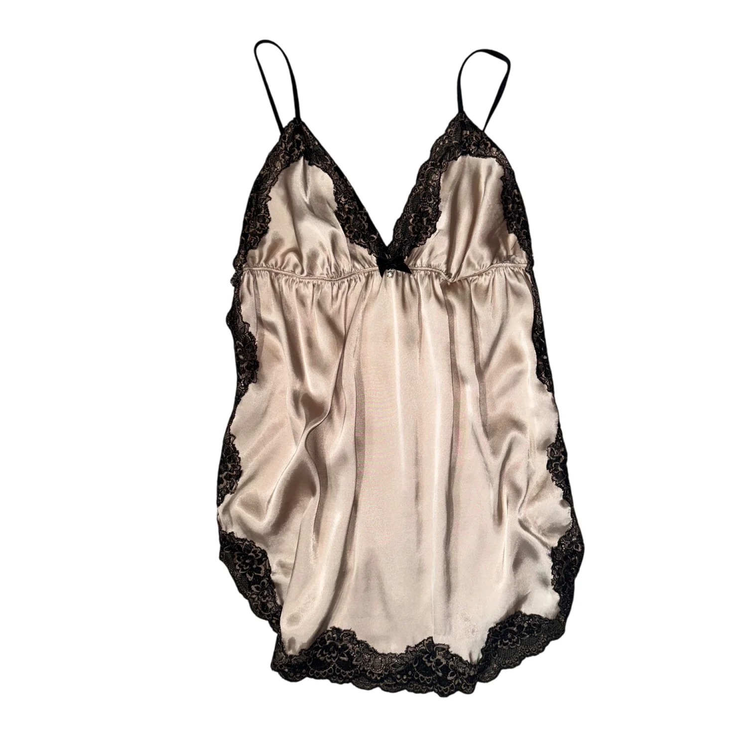 satin slip top featuring a soft beige color with delicate black lace trim.