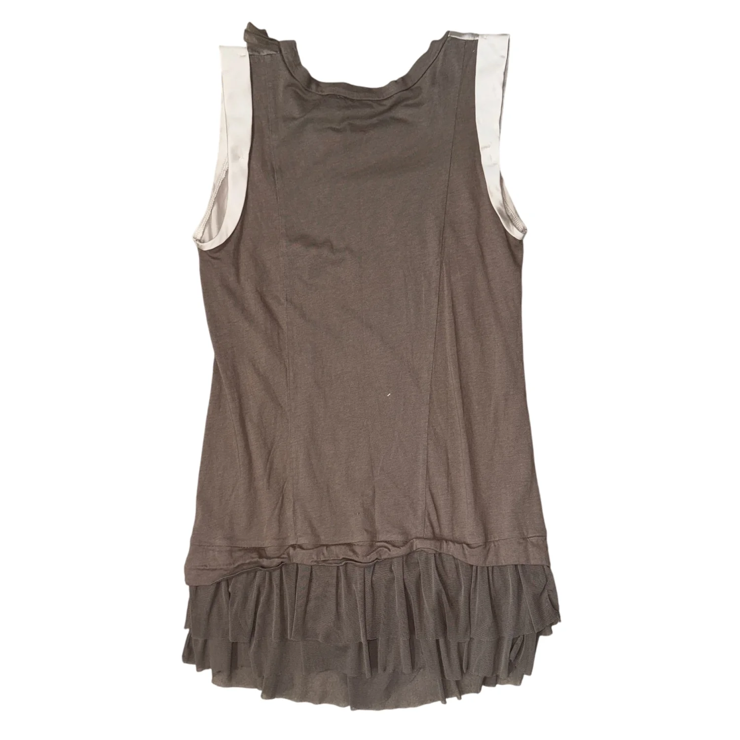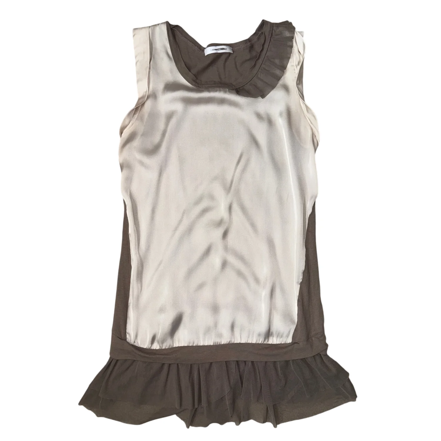 This sleeveless dress features a dual-layer design with a smooth ivory silk front panel and knit back