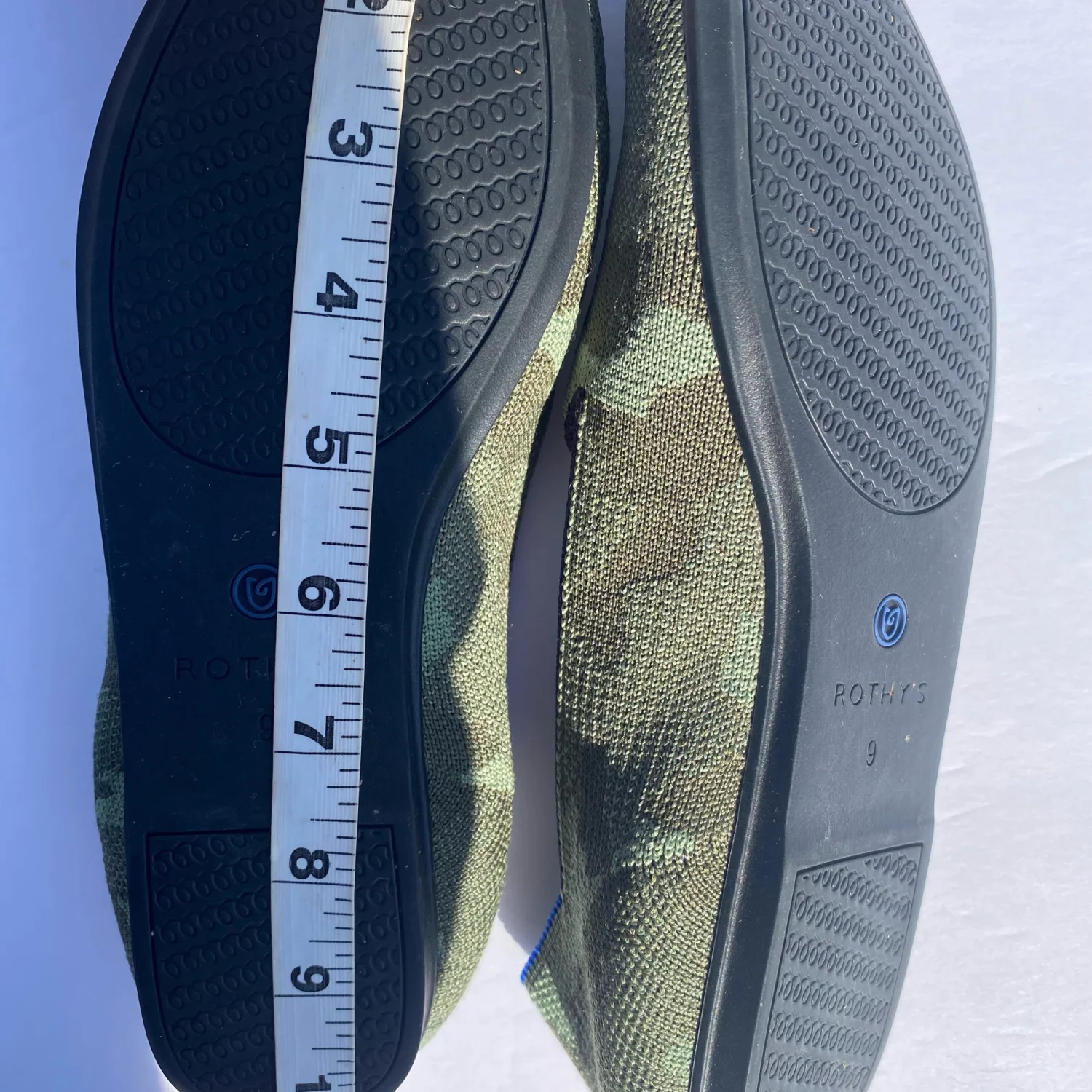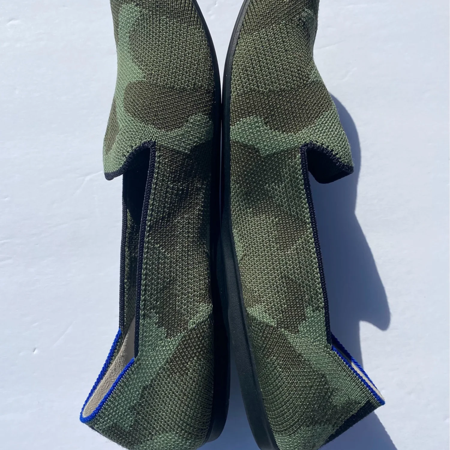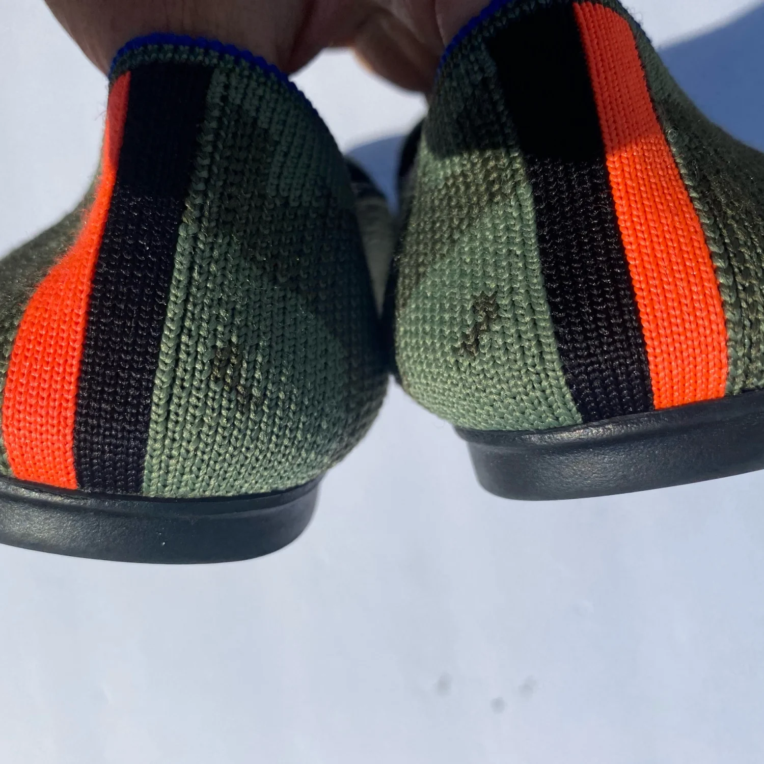 Rothy’s loafers in olive camo women’s size W9 Gently used/light wear insoles Green camo Neon orange and black heel stripes