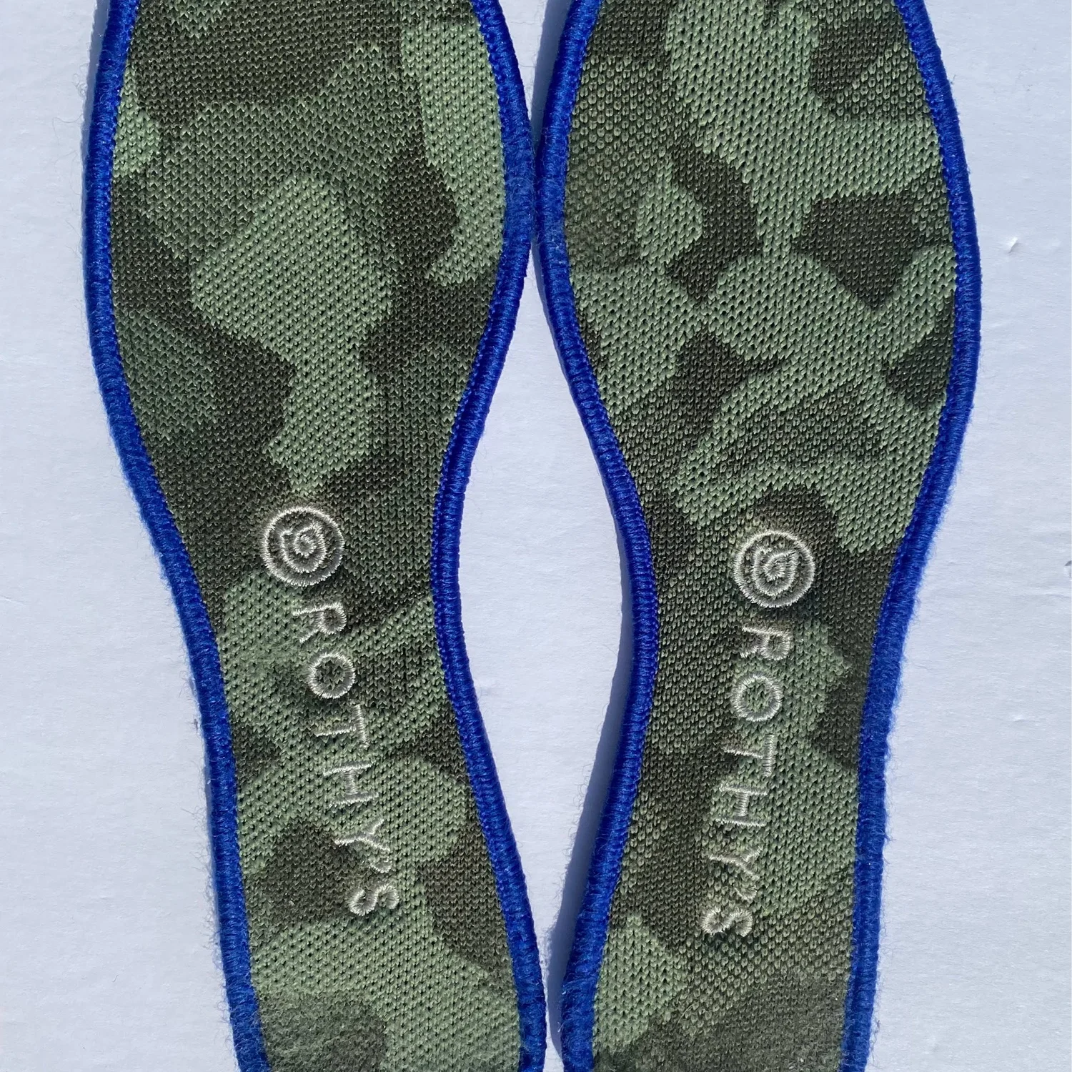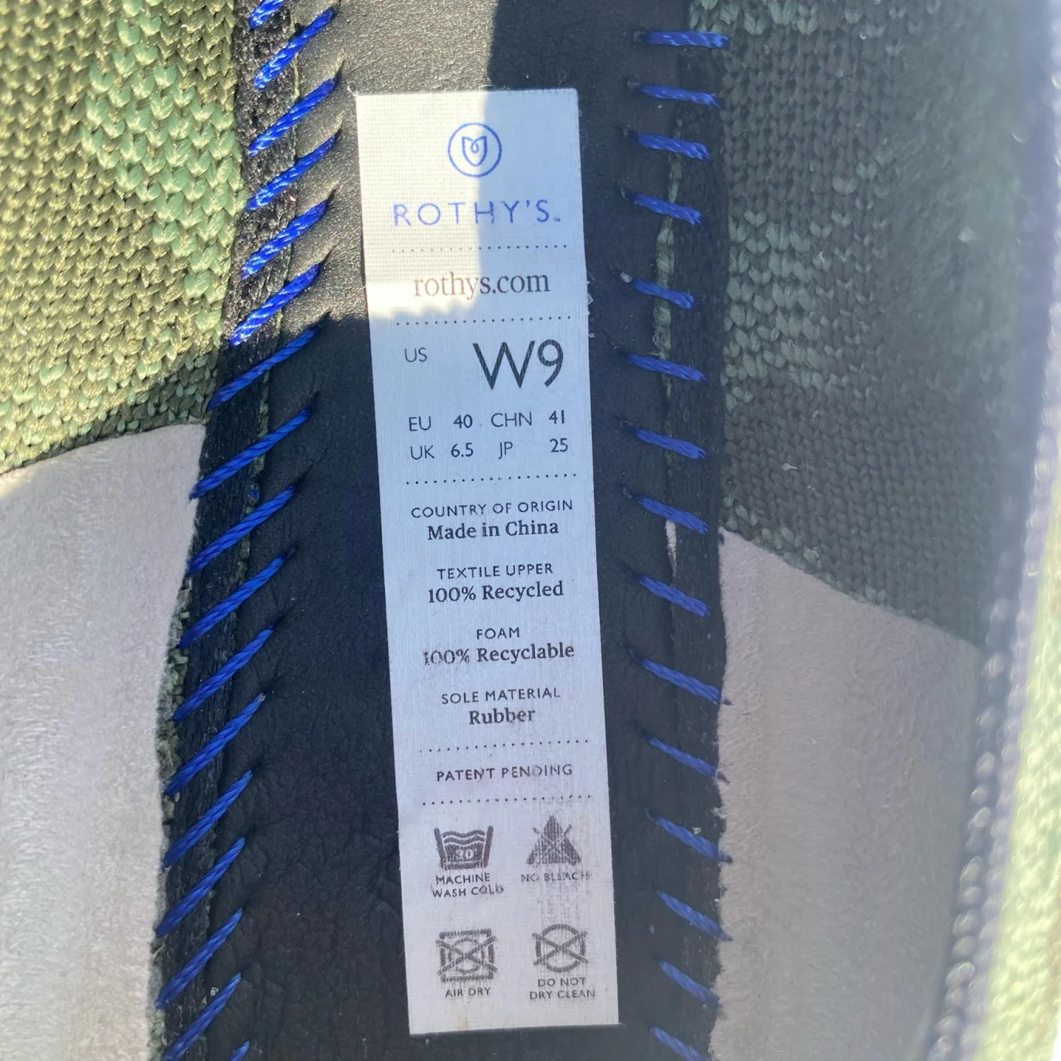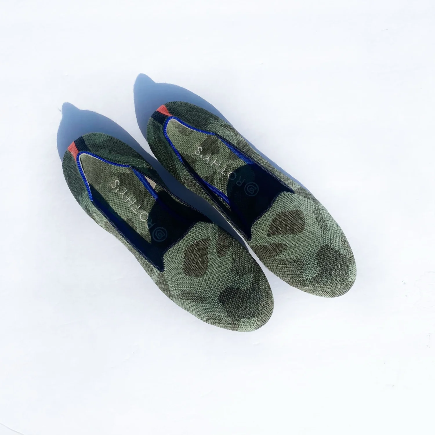 Rothy’s loafers in olive camo women’s size W9 Gently used/light wear insoles Green camo Neon orange and black heel stripes
