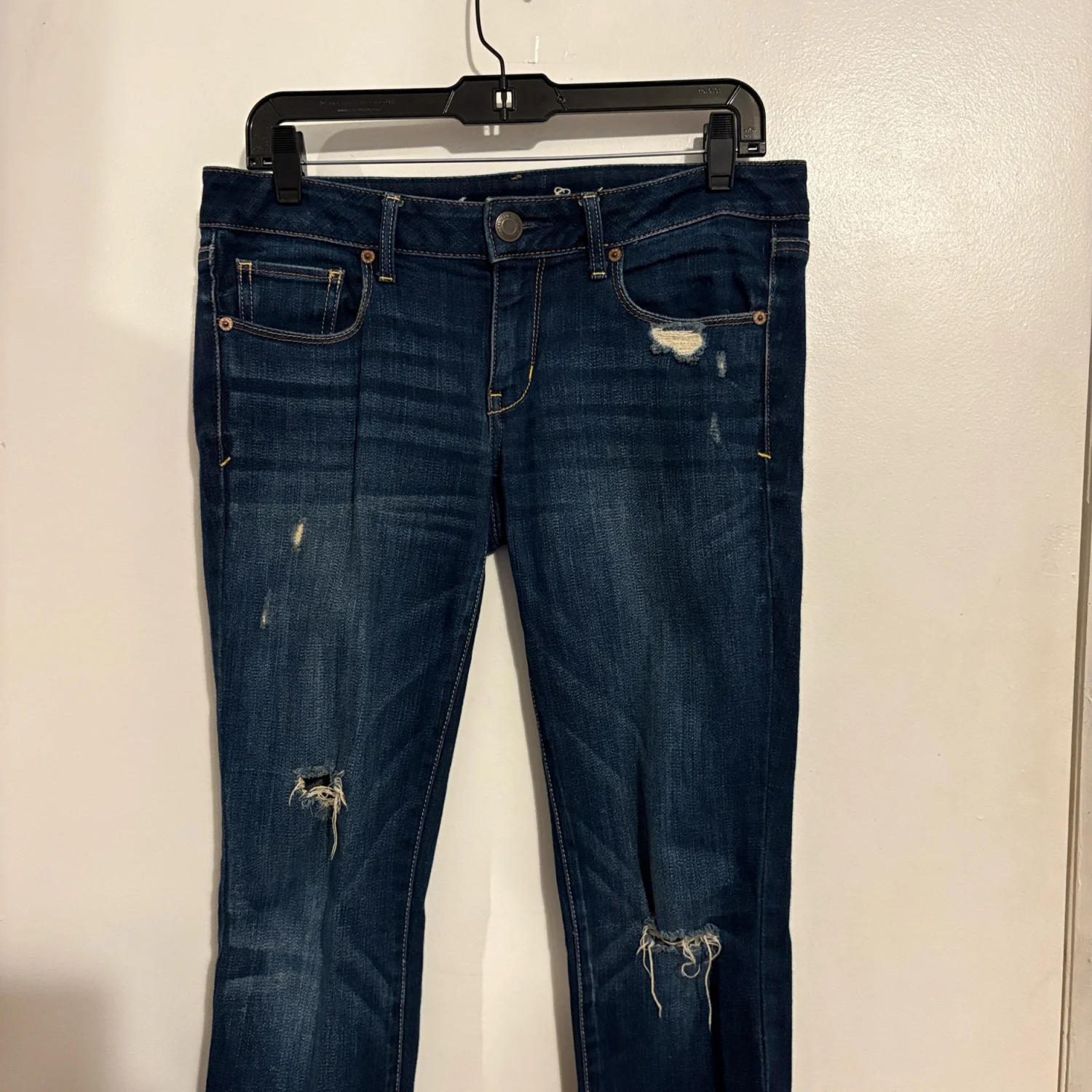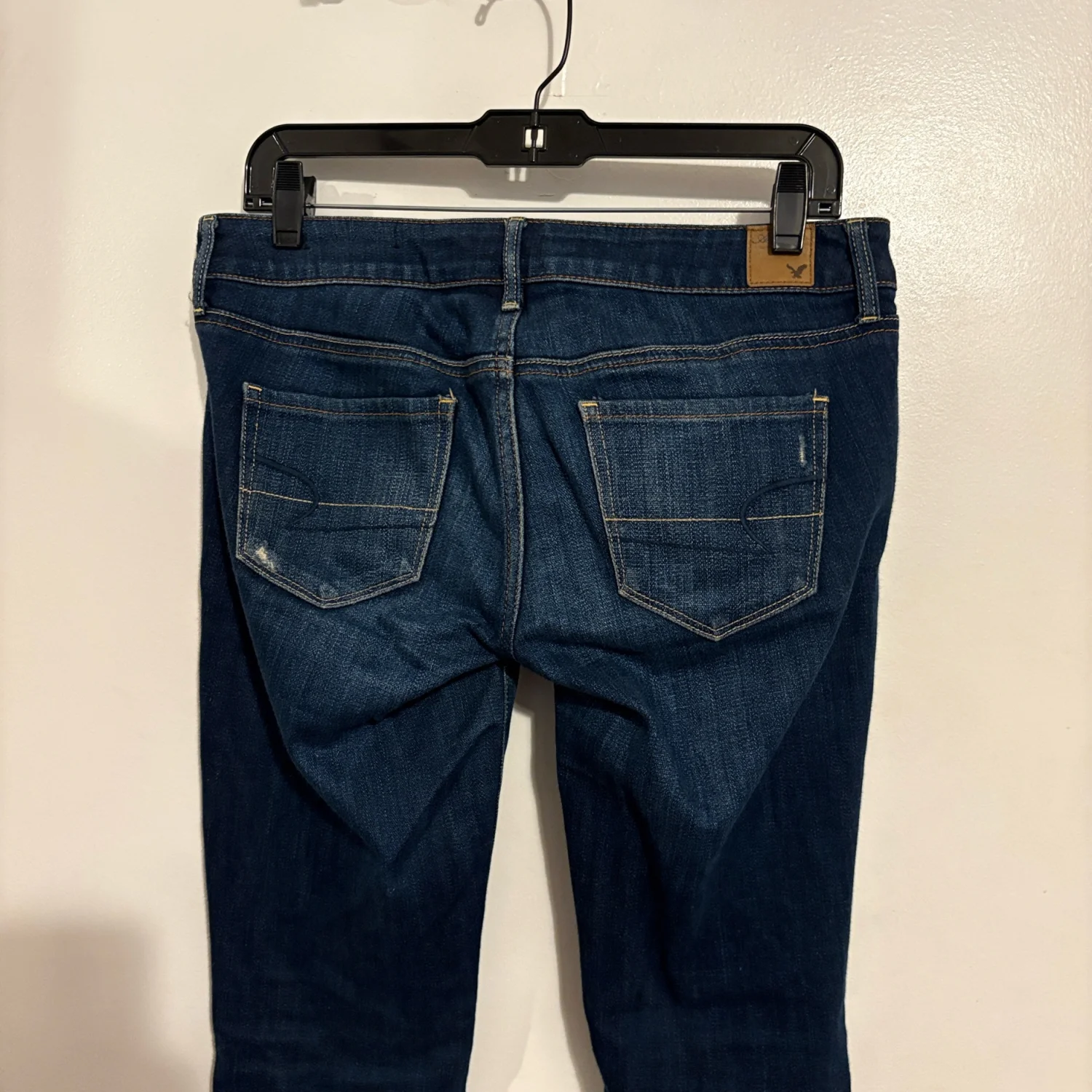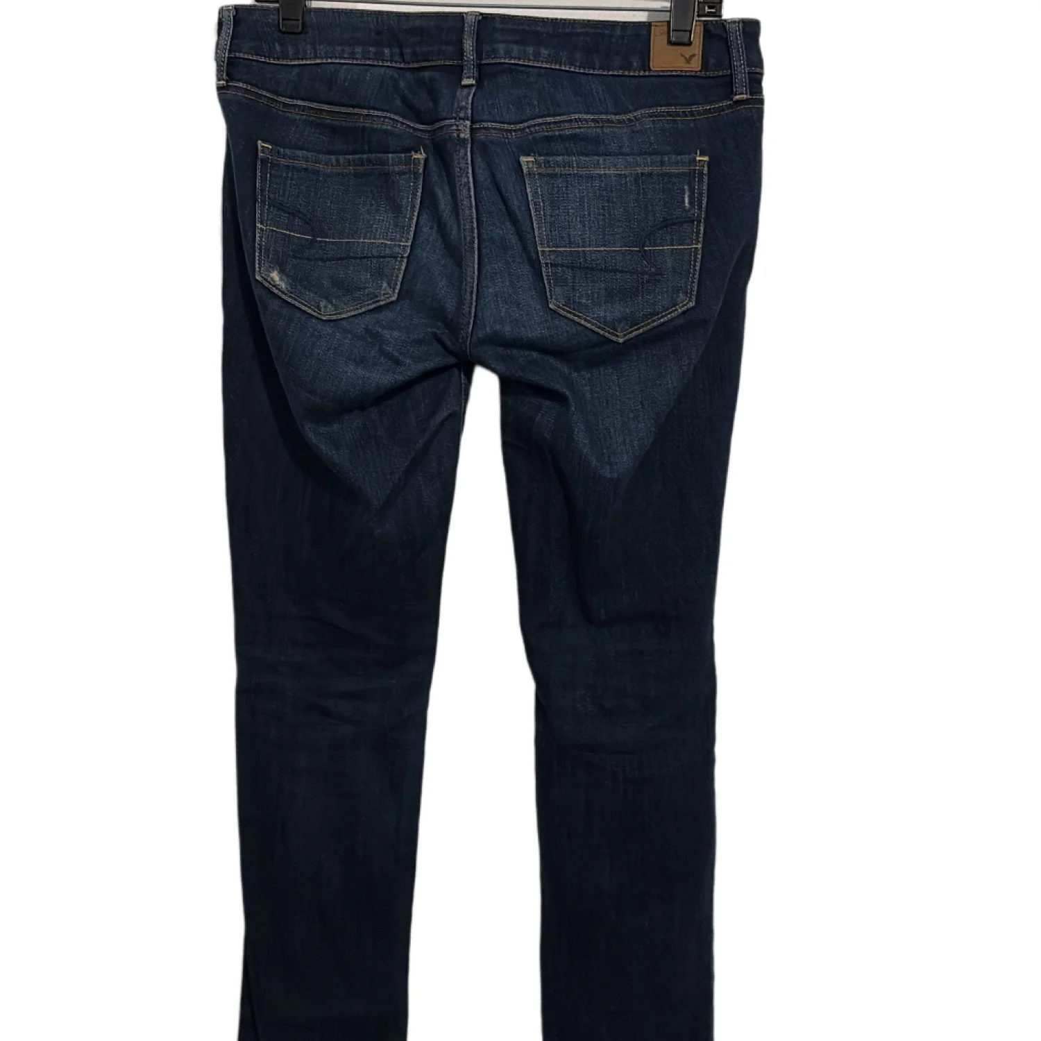 American Eagle Dark Wash Low Rise Distressed Skinny Jeans 6 Cute jeans by American Eagle Outfitters Skinny Jeans Low Rise Distressed by manufacturer Classic five pocket styling Belt Loops Zip Fly Stretch Denim: 99% cotton 1% spandex Preowned excellent condition 28 Inch Waist 31 Inch Inseam 7.5 Inch Front Rise 13 Inch Back Rise Size: 6 Bin: #aeo #skinny #lowrise #darkwash #distressed #28