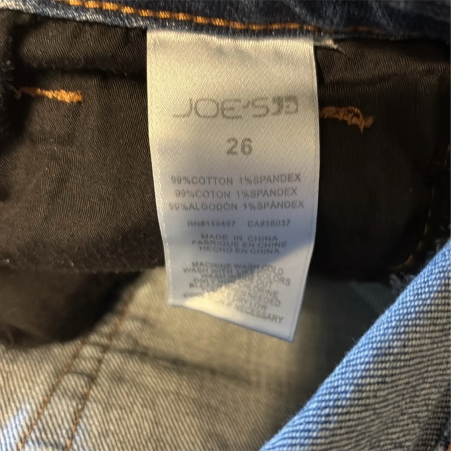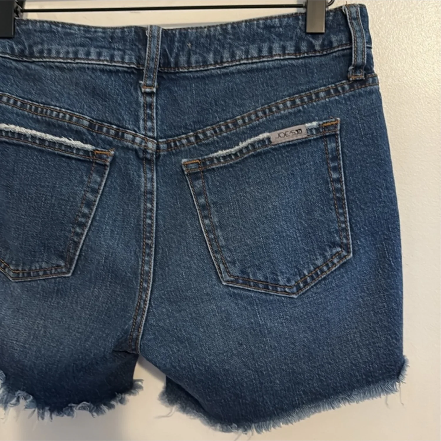 Cute denim shorts by Joe’s Jeans The Ozzie Shorts Raw edge hem Classic five pocket styling Belt loops Zip fly 99% cotton 1% spandex Preowned excellent condition 26 inch waist 5 inch inseam 9 inch front rise 14 inch back rise Size 26 bin k