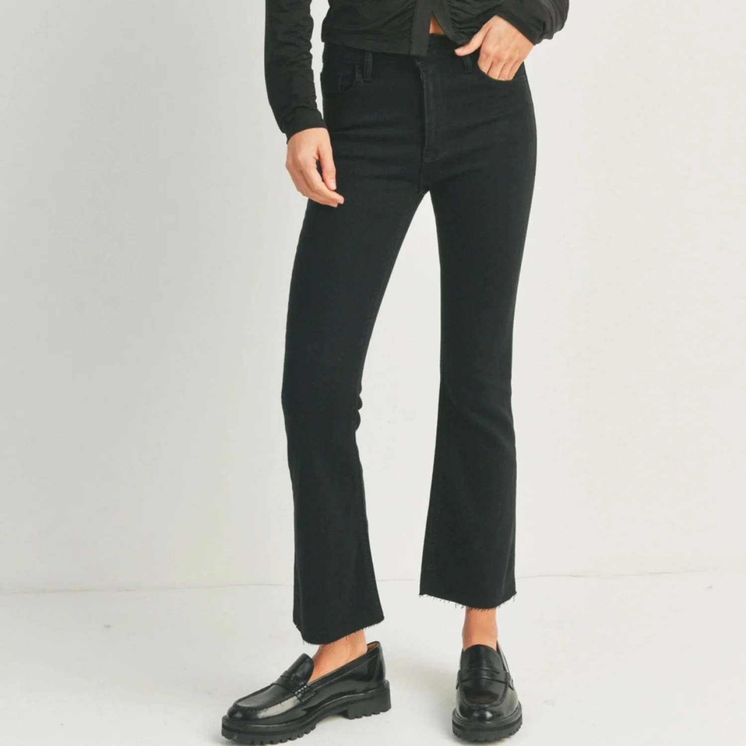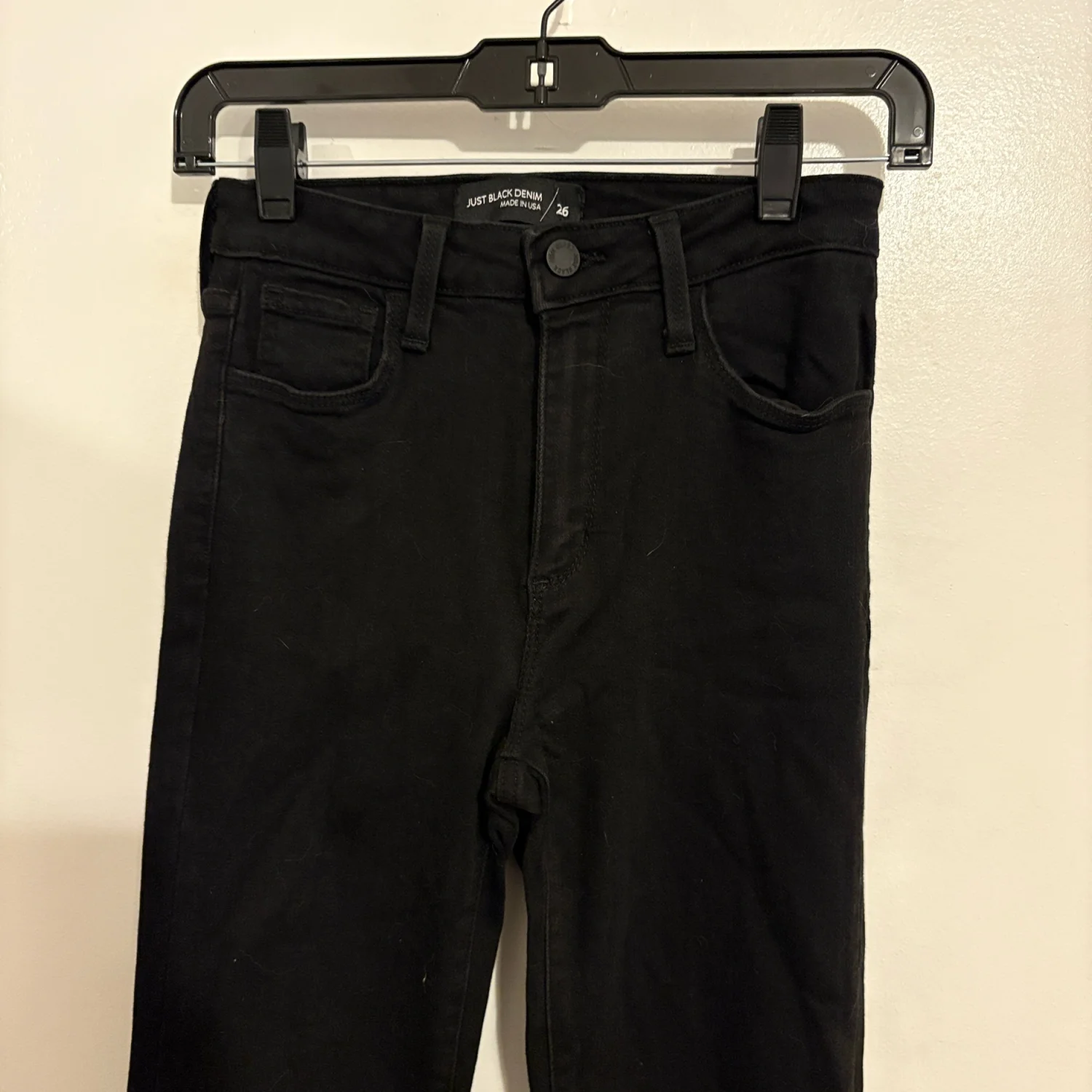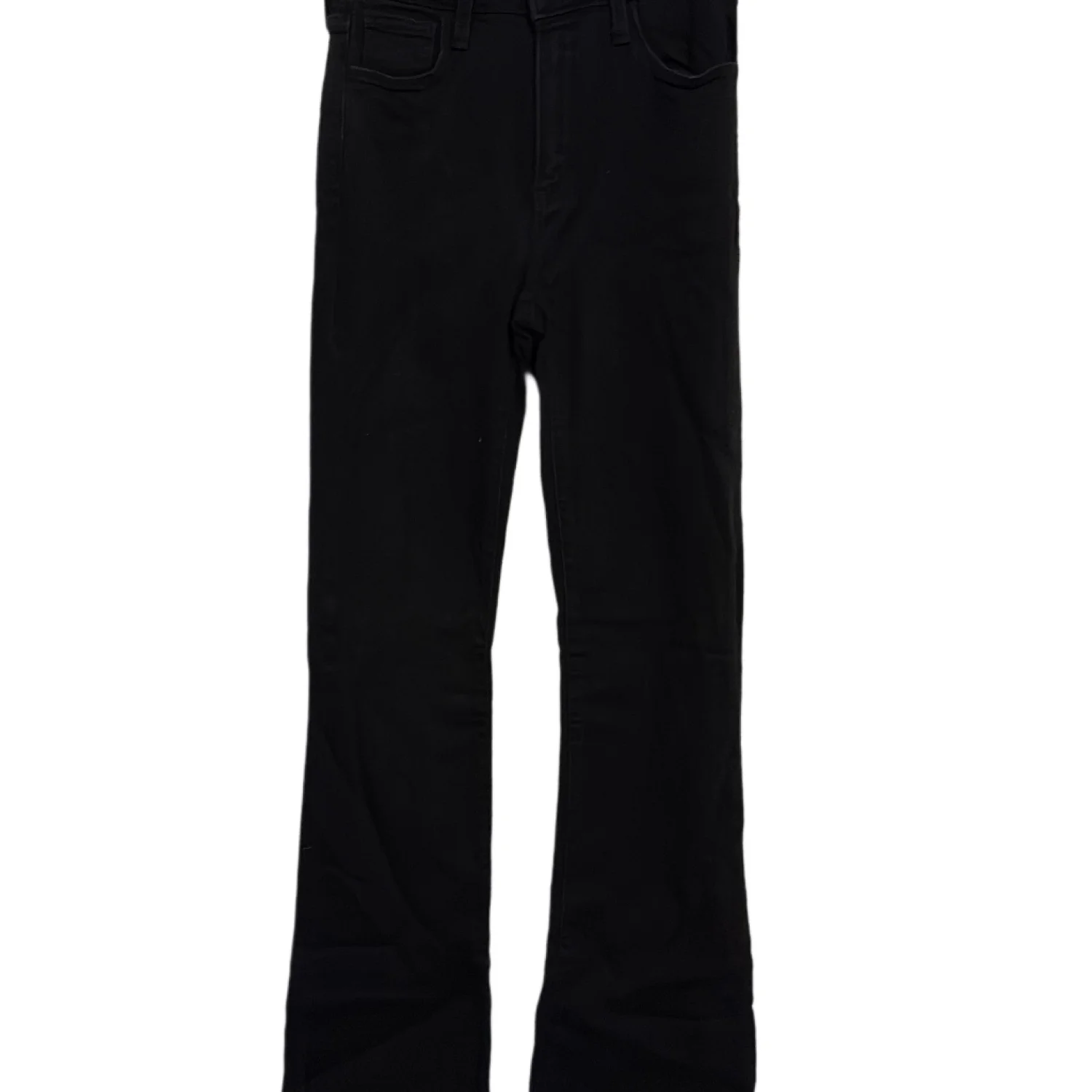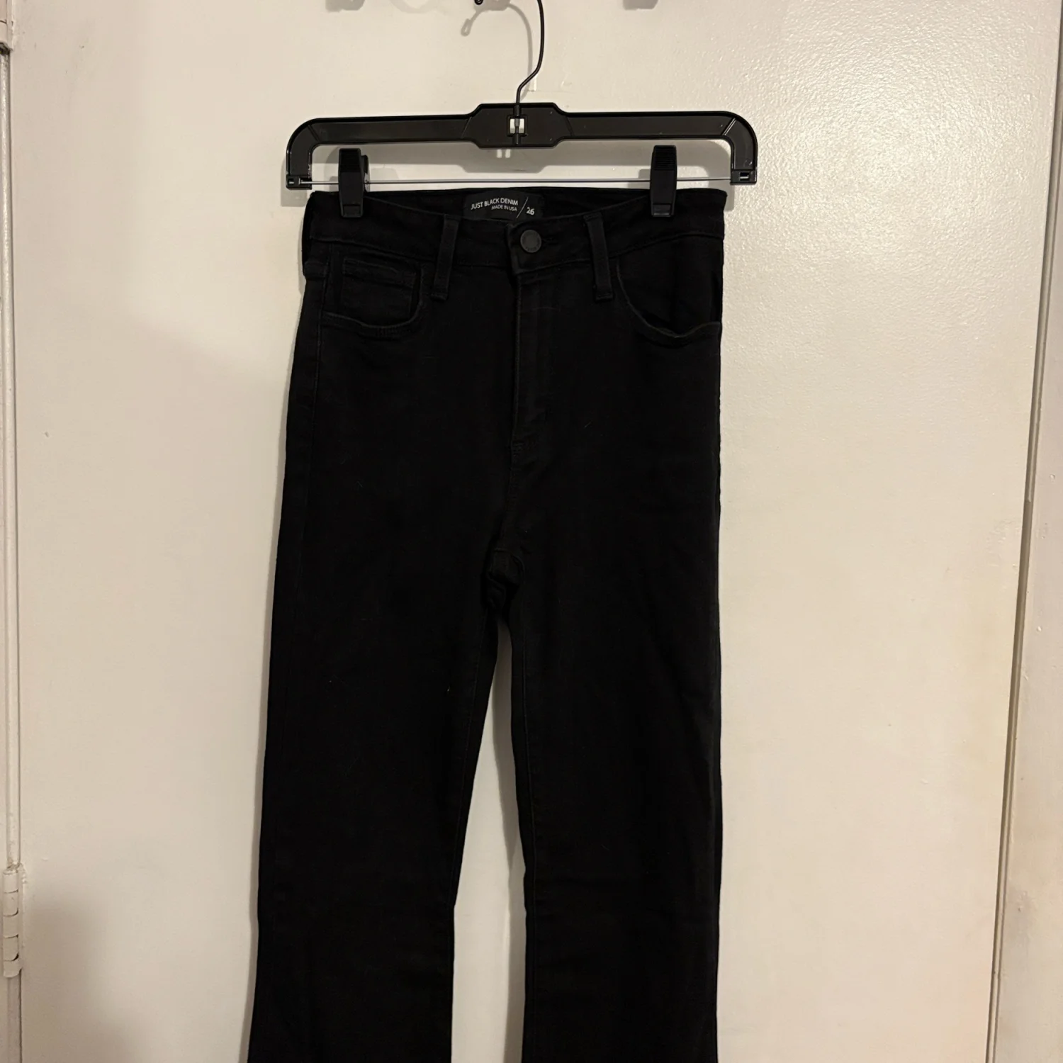 Just Black Black Denim Flare Jeans Cute jeans by Just Black Flare Jeans Black denim Raw edge hem Classic five pocket styling Belt Loops Zip Fly Stretch Denim: 50% rayon 38.9% cotton 9.4% polyester 1.7% spandex Preowned excellent condition 26 Inch Waist 32 Inch Inseam 9.5 Inch Front Rise 14 Inch Back Rise Size: 26 Bin: A #justblack #black #2 #32L #flare #bootcut