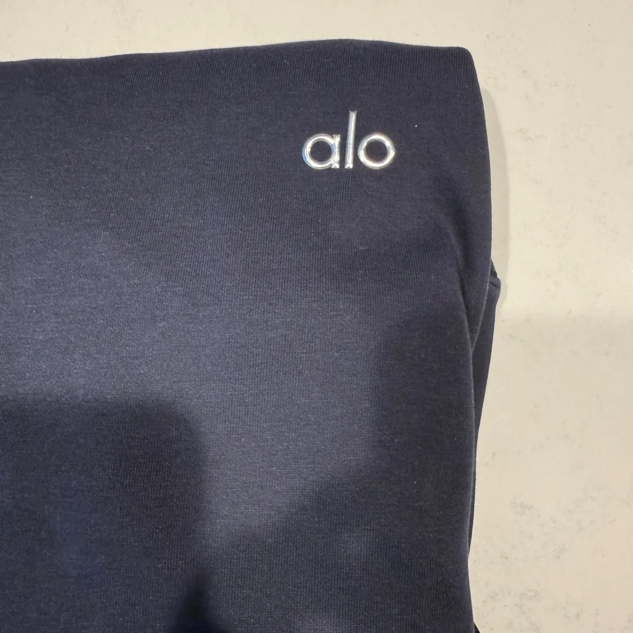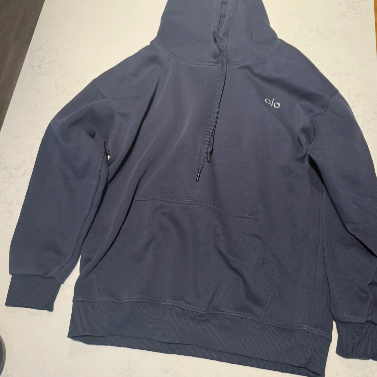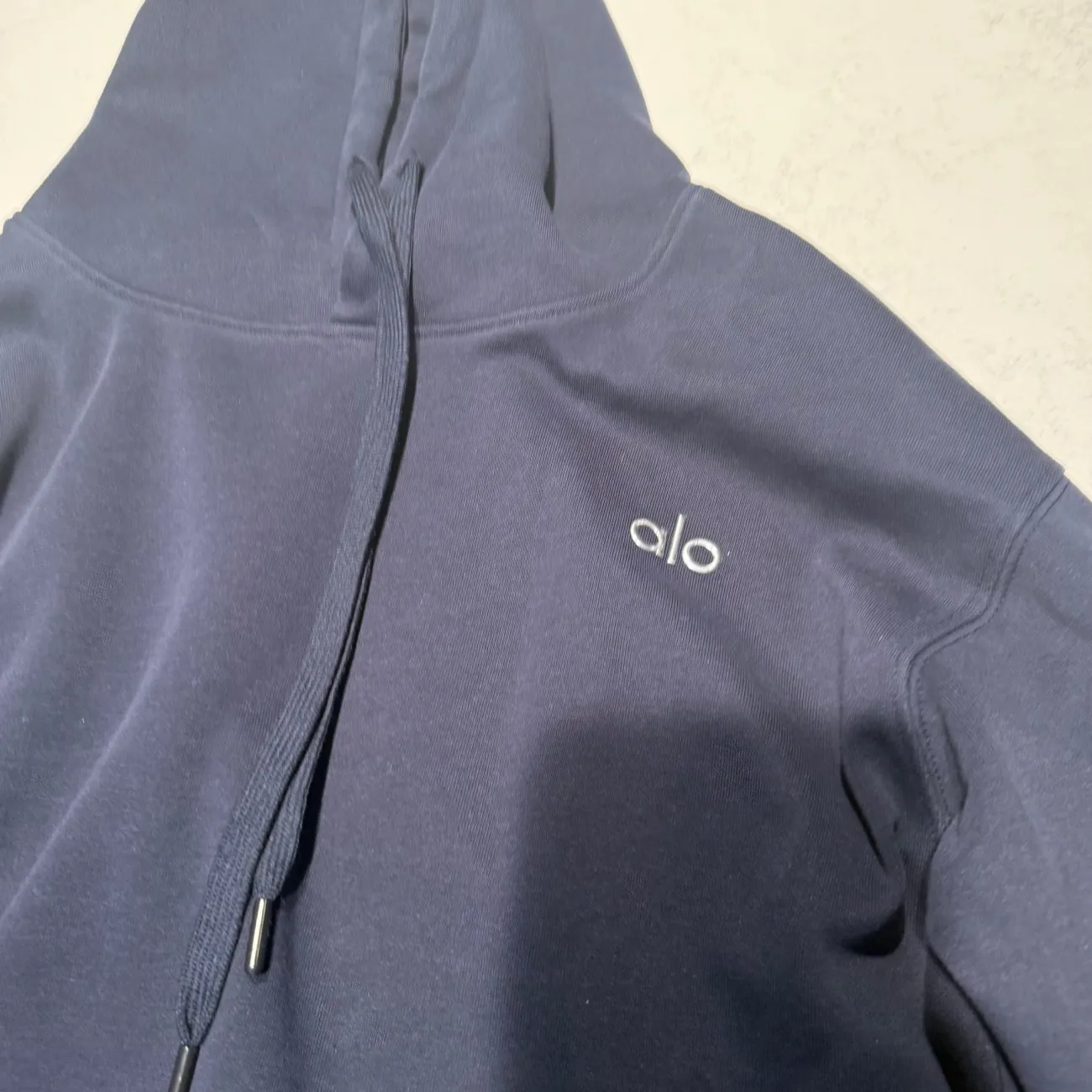 Alo brand navy hoodie, featuring an embroidered logo on the chest. This cozy piece includes a drawstring hood and a front kangaroo pocket, perfect for casual wear. Made from soft material for comfort and warmth. Ideal for lounging or casual outings. #alo #hoodie #casual