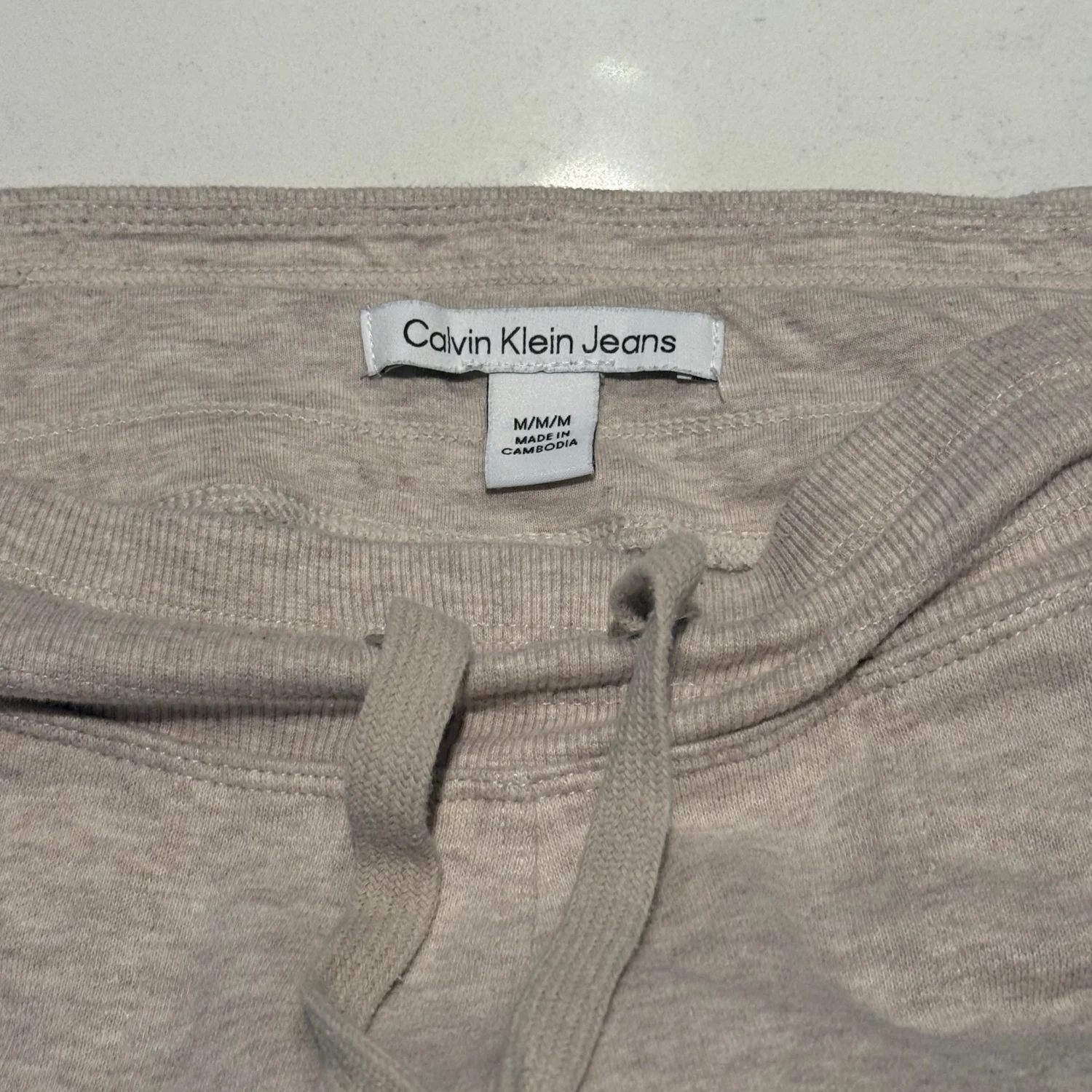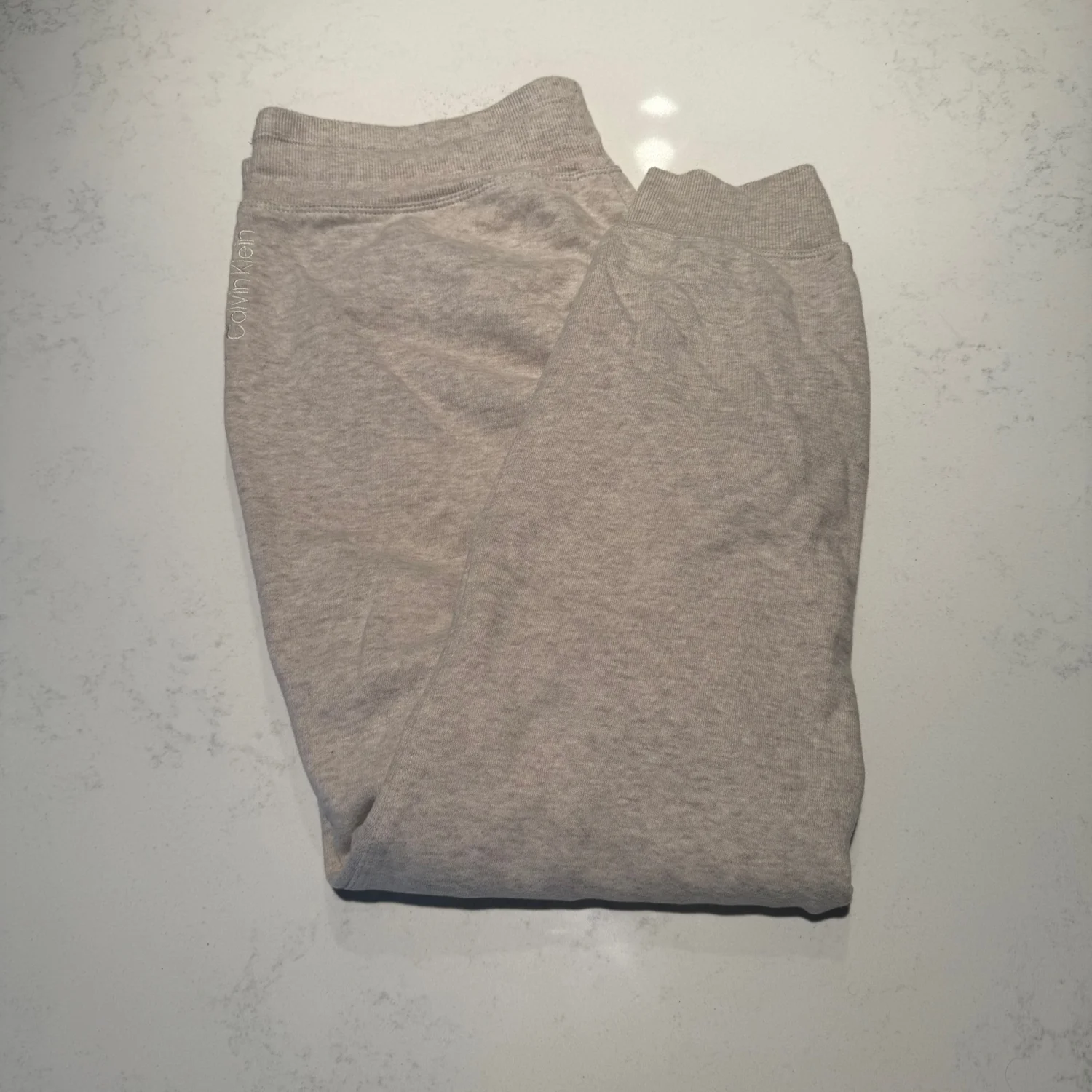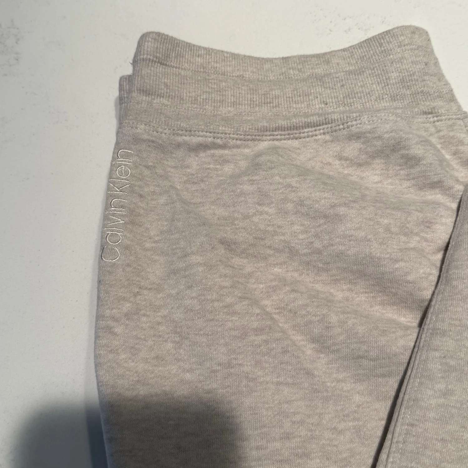 Calvin Klein light grey joggers featuring an elastic waistband with a drawstring for a comfortable fit. Made from a soft and breathable fabric, these joggers are ideal for casual wear. The brand logo is subtly embroidered on the side. Perfect for lounging or casual outings. #CasualWear #Comfort #CalvinKlein