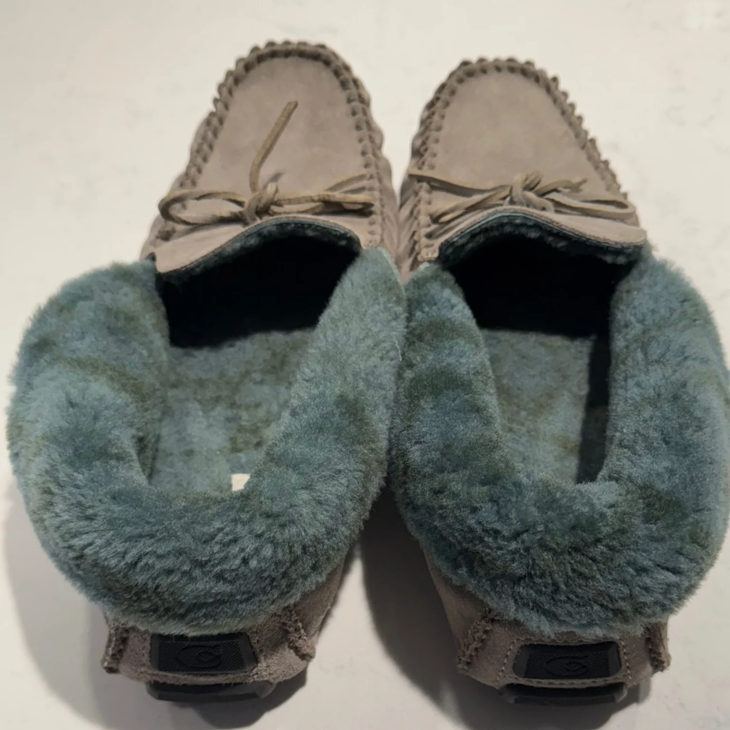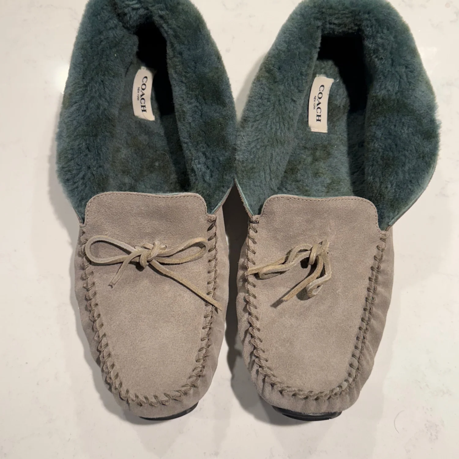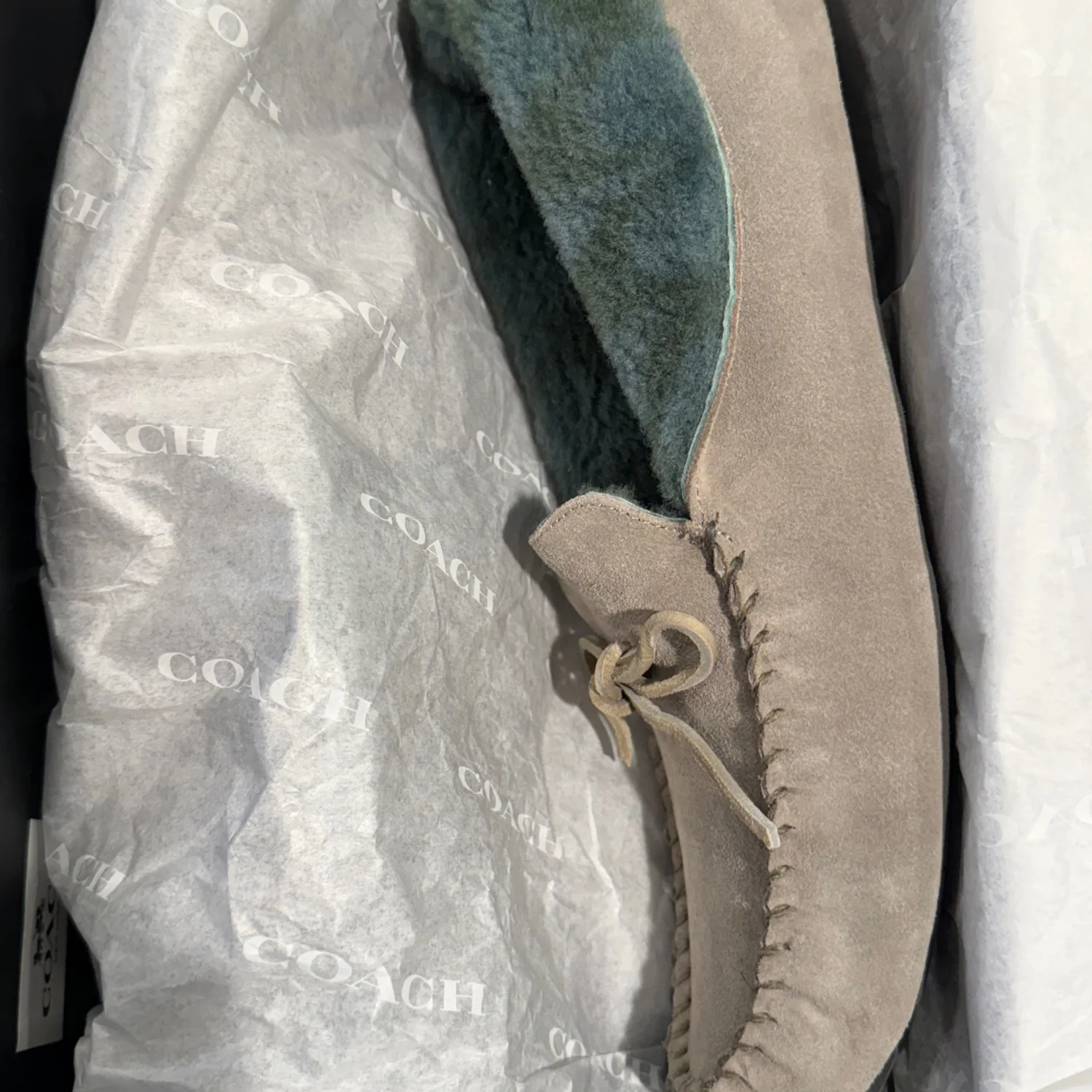 Luxurious Coach moccasin slippers crafted from soft beige suede and lined with plush teal faux fur for ultimate comfort. These slippers feature a bow detail and sturdy stitching, reflecting Coach's signature quality. Ideal for cozy indoor wear. Includes original packaging. #Coach #Luxury #Slippers