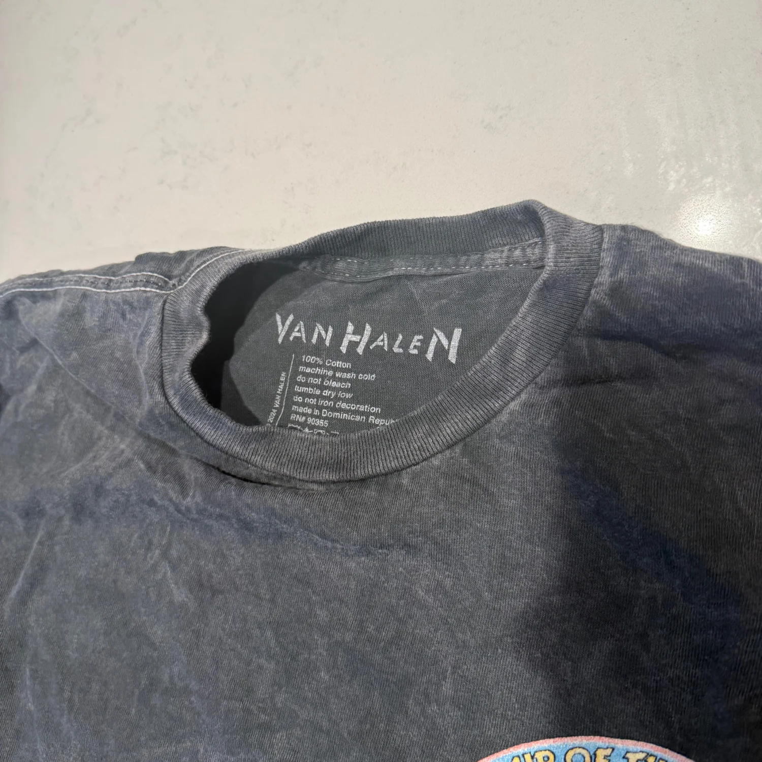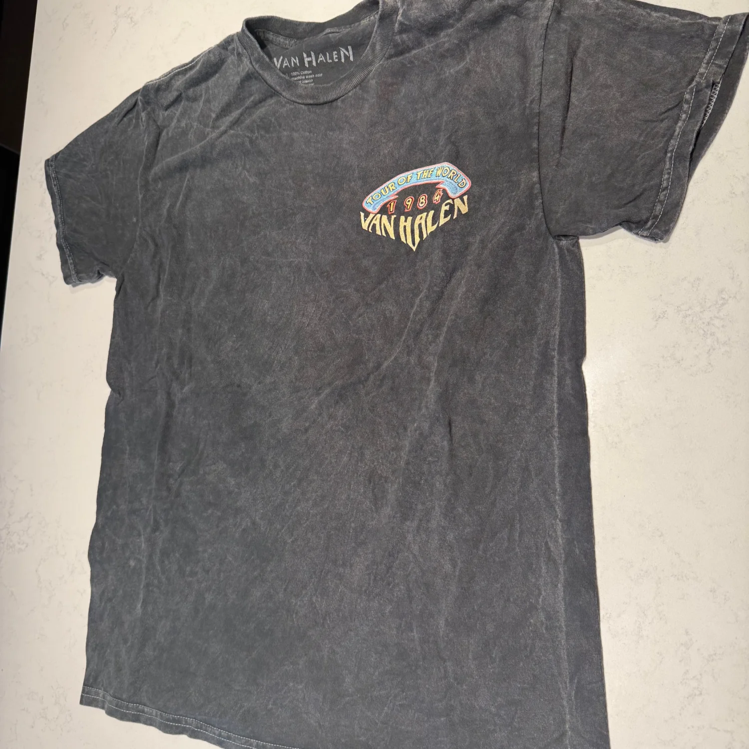 Vintage-style black t-shirt featuring Van Halen's 1984 Tour logo on the front. Made from a soft, worn-in cotton blend, giving it a retro look. Perfect for fans of classic rock and band memorabilia. Care instructions include machine wash cold, tumble dry low. #vintage #bandtee #rocknroll