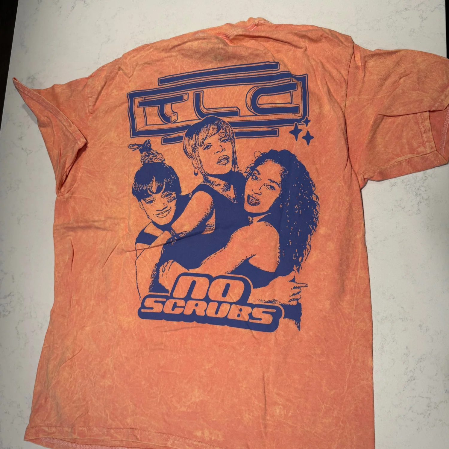 Channel the 90s with this vintage TLC 'No Scrubs' graphic tee. Featuring a bold print of the iconic R&B group on an orange tie-dye background, it offers a nostalgic nod to the era. Made of soft cotton, it's perfect for casual wear. Ideal for music lovers and retro fashion enthusiasts. #vintage #90s #music #TLC