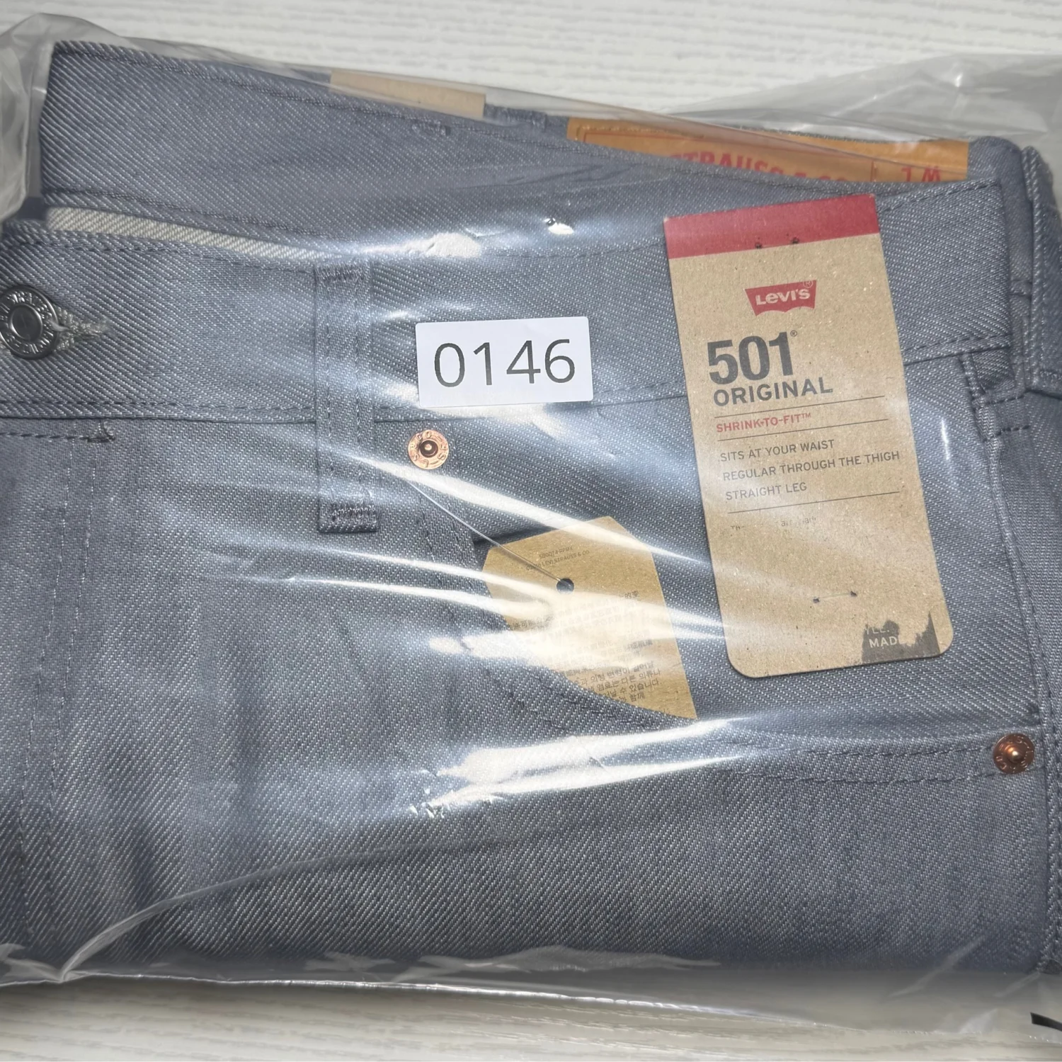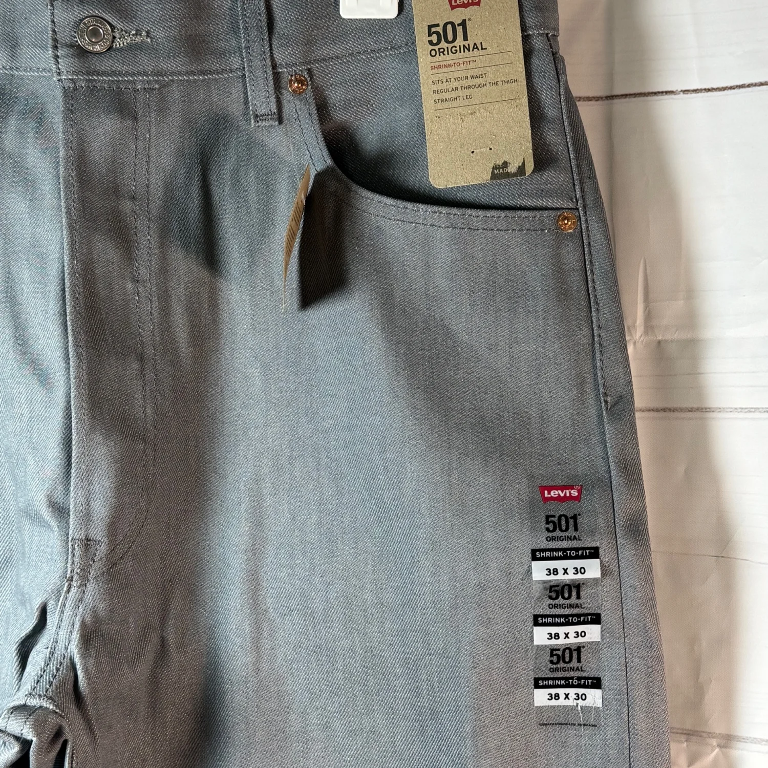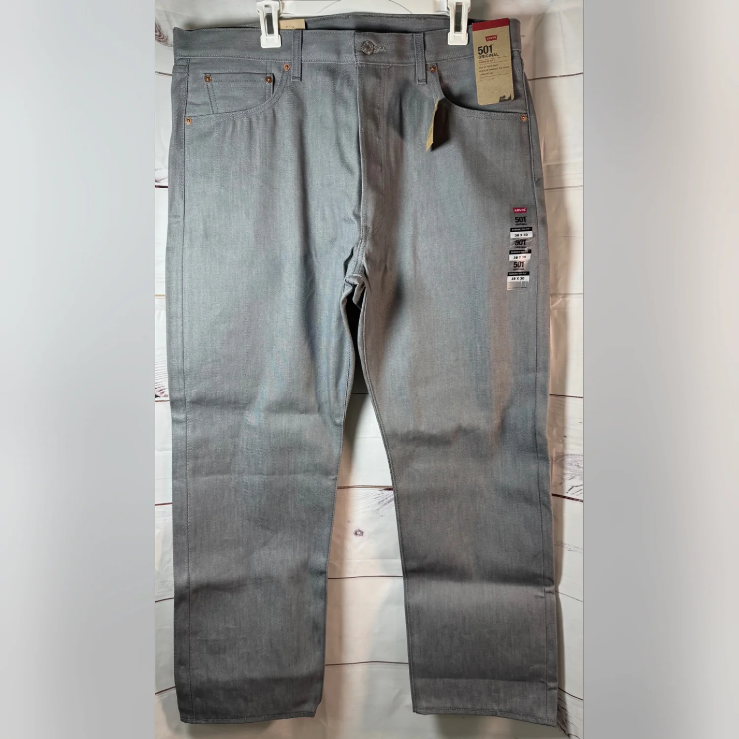 NEW WITH TAGS. Classic Levi's 501 Original jeans in a sleek grey color. Made from durable denim, these jeans feature a straight leg and are designed for comfort and style. The shrink-to-fit material allows for a custom fit over time. Perfect for a casual, timeless look. #Levis #501 #Original #Denim #Casual #ShrinkToFit #GreyJeans
