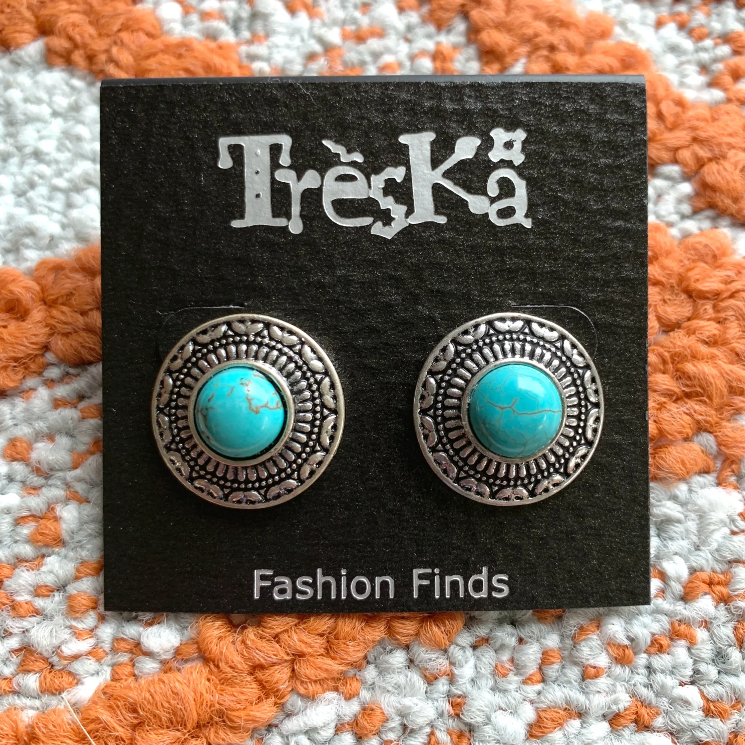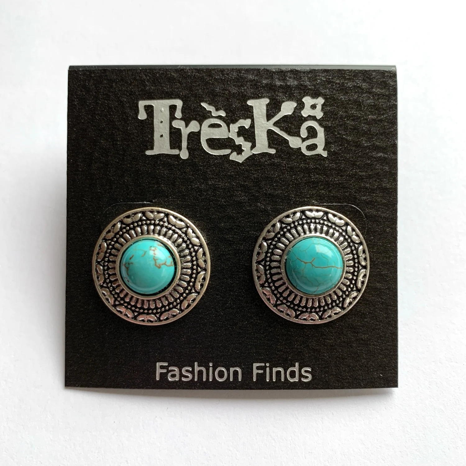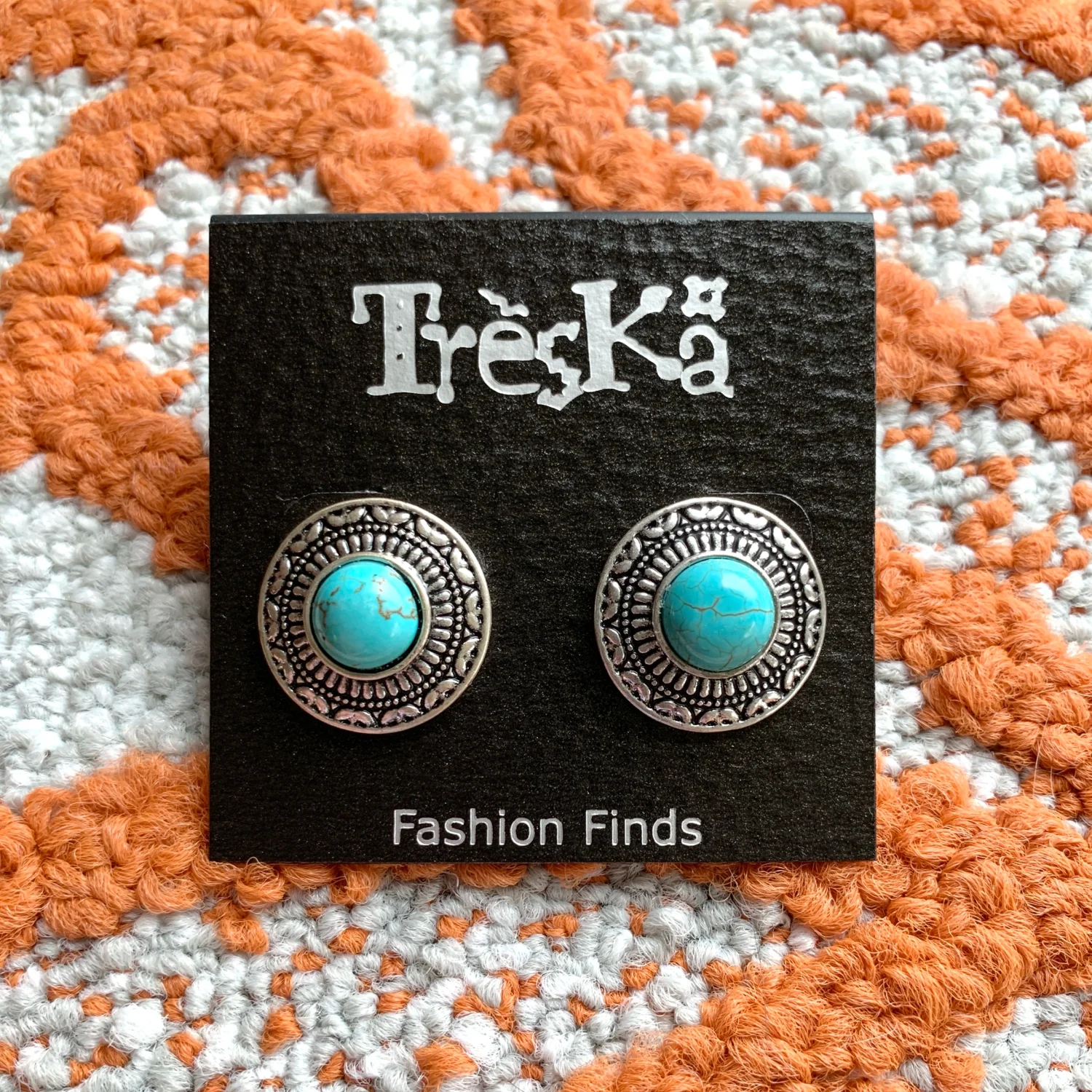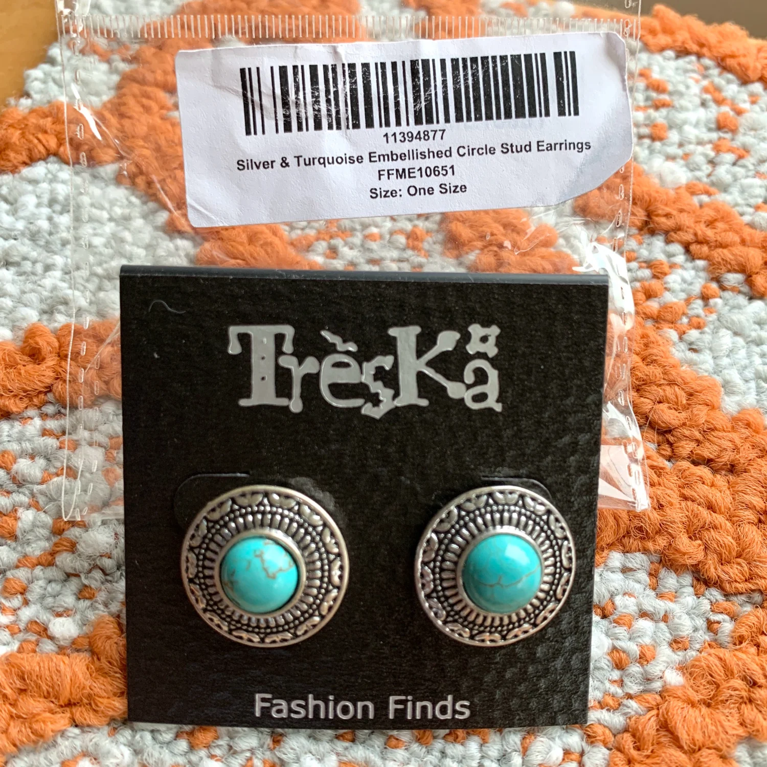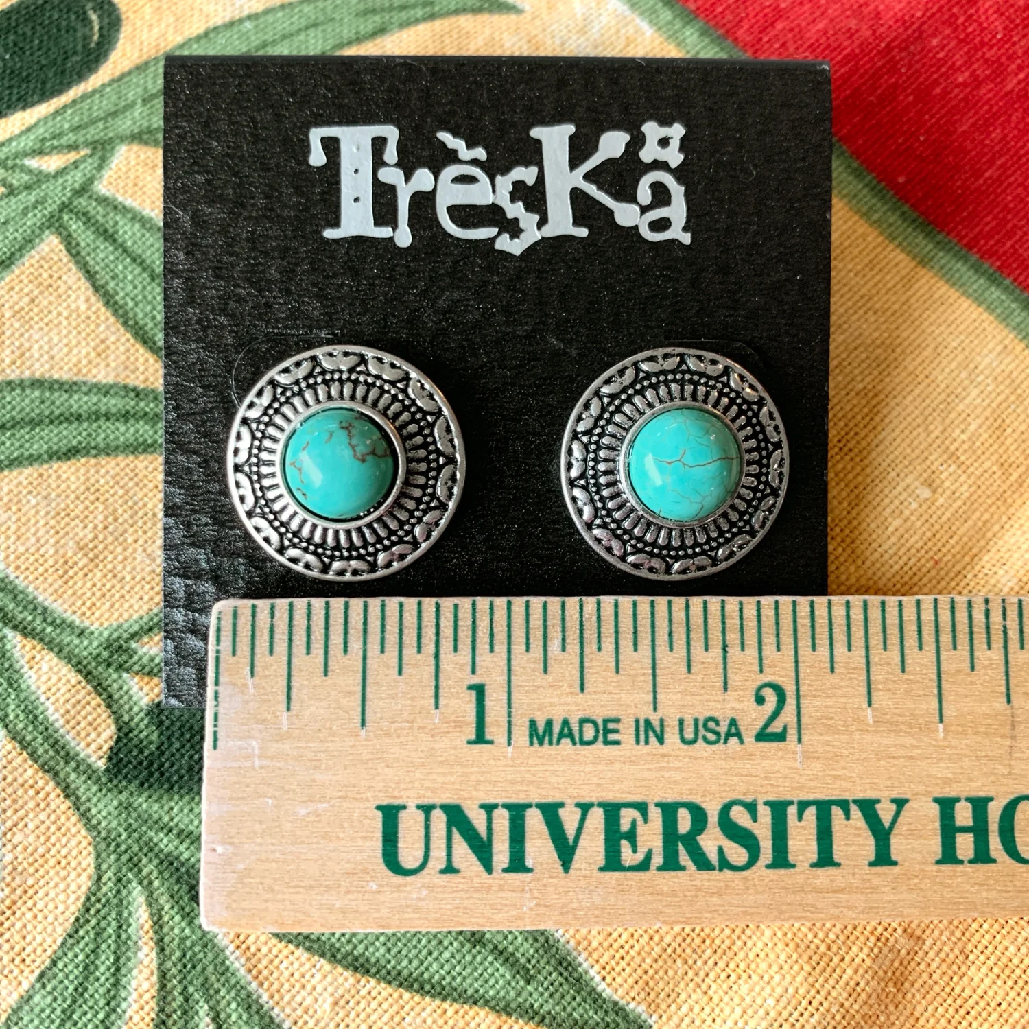 Treska etched silver tone and faux turqouise circle stud post earrings. New in bag. Bought online, so no price tag. Earrings have secure lock backs. Lightweight. See photo for measurement. New condition. NOTE: the description sticker on the bag has peeled off on bottom right corner. Please note any item ordered online may have imperfections. I do my best to list any flaws in the description; I am happy to answer any questions.