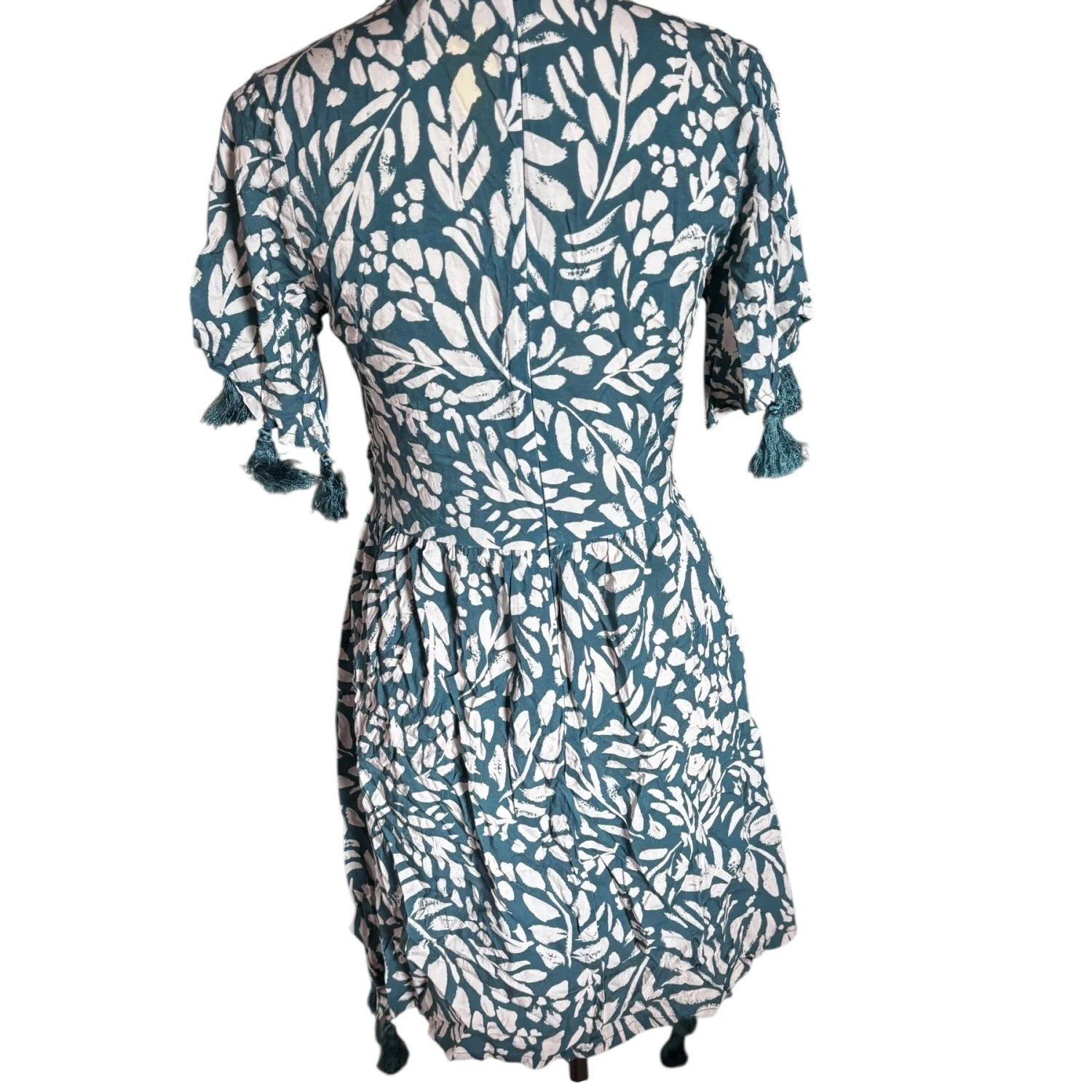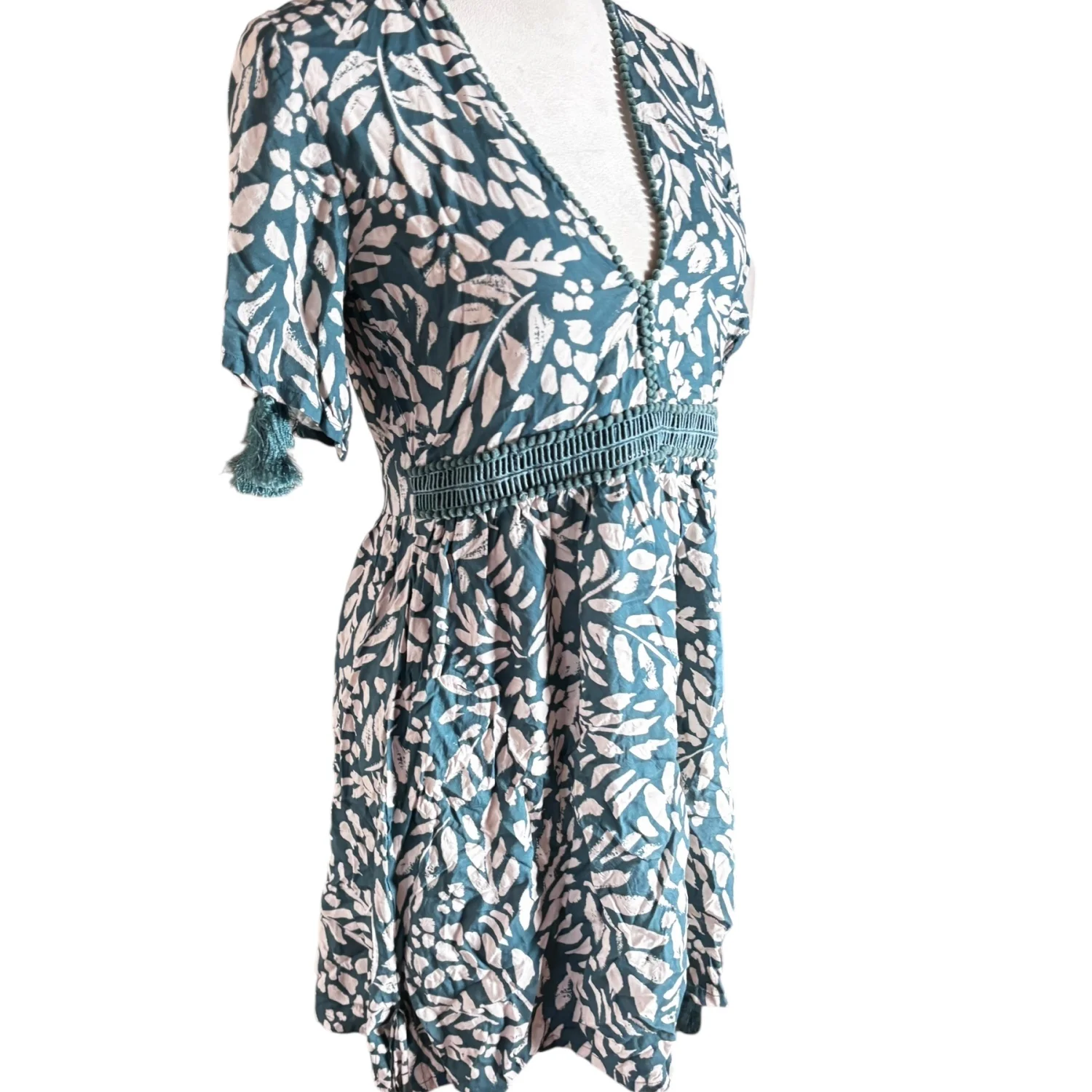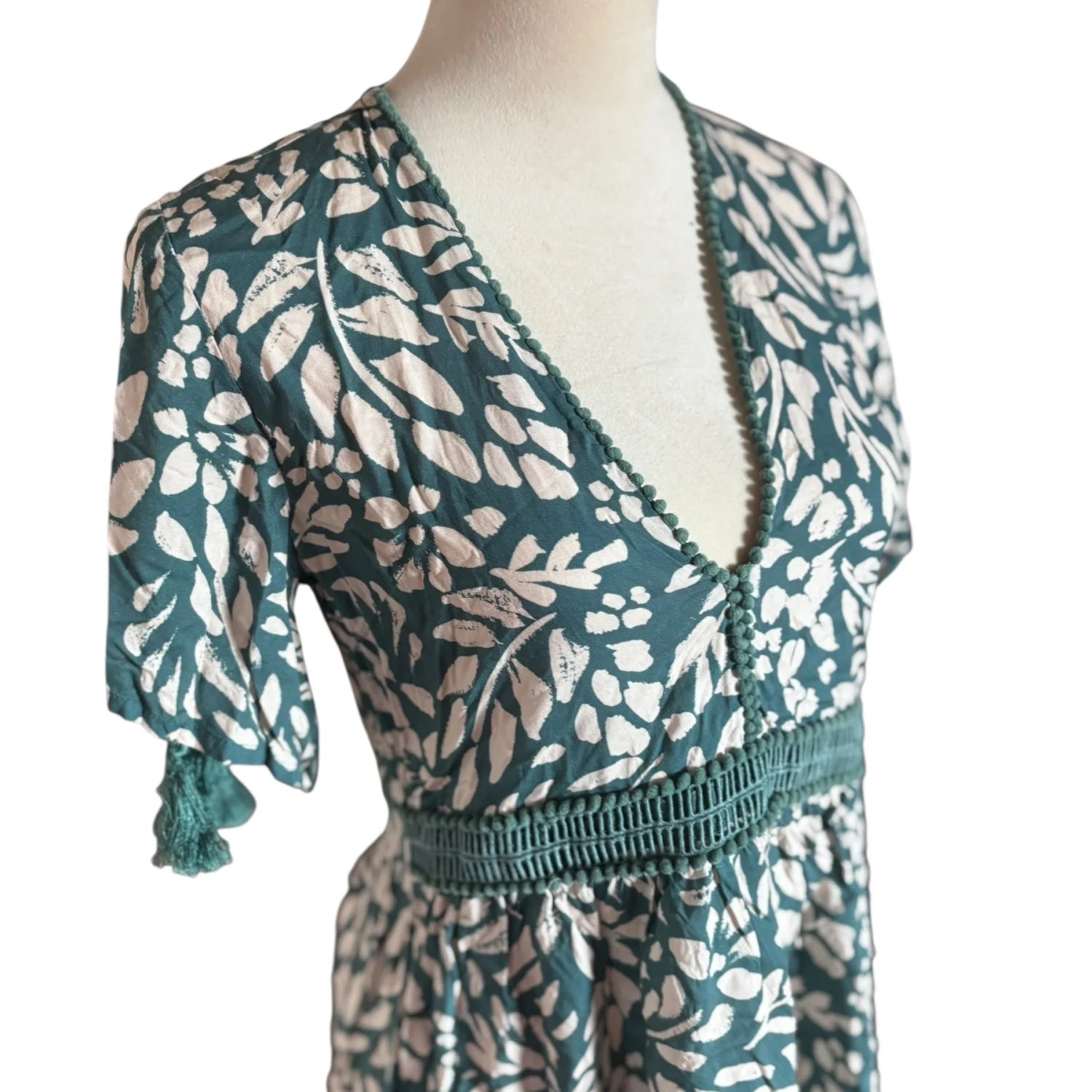 Summer ready, vacation ready, beautiful boho flows dress, with details of Tassels, ruching, smocking, and a deep v-neck all add to the beachy, boho aesthetic. EUC, no visible flaws, midi style!