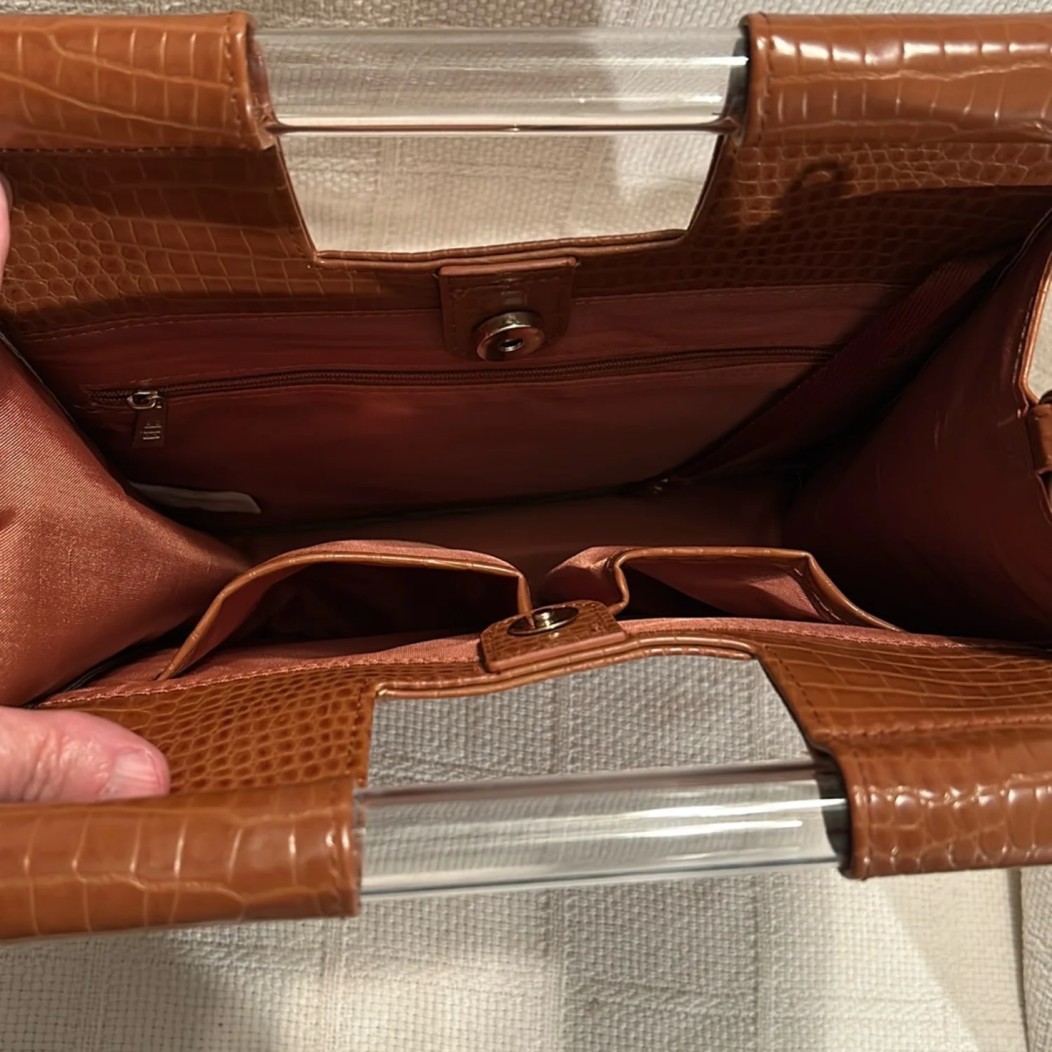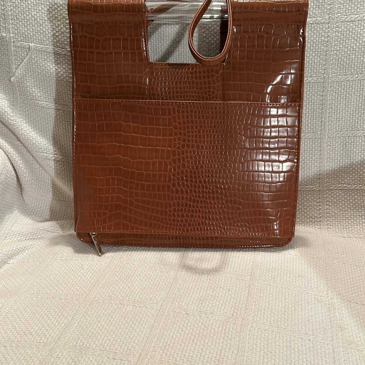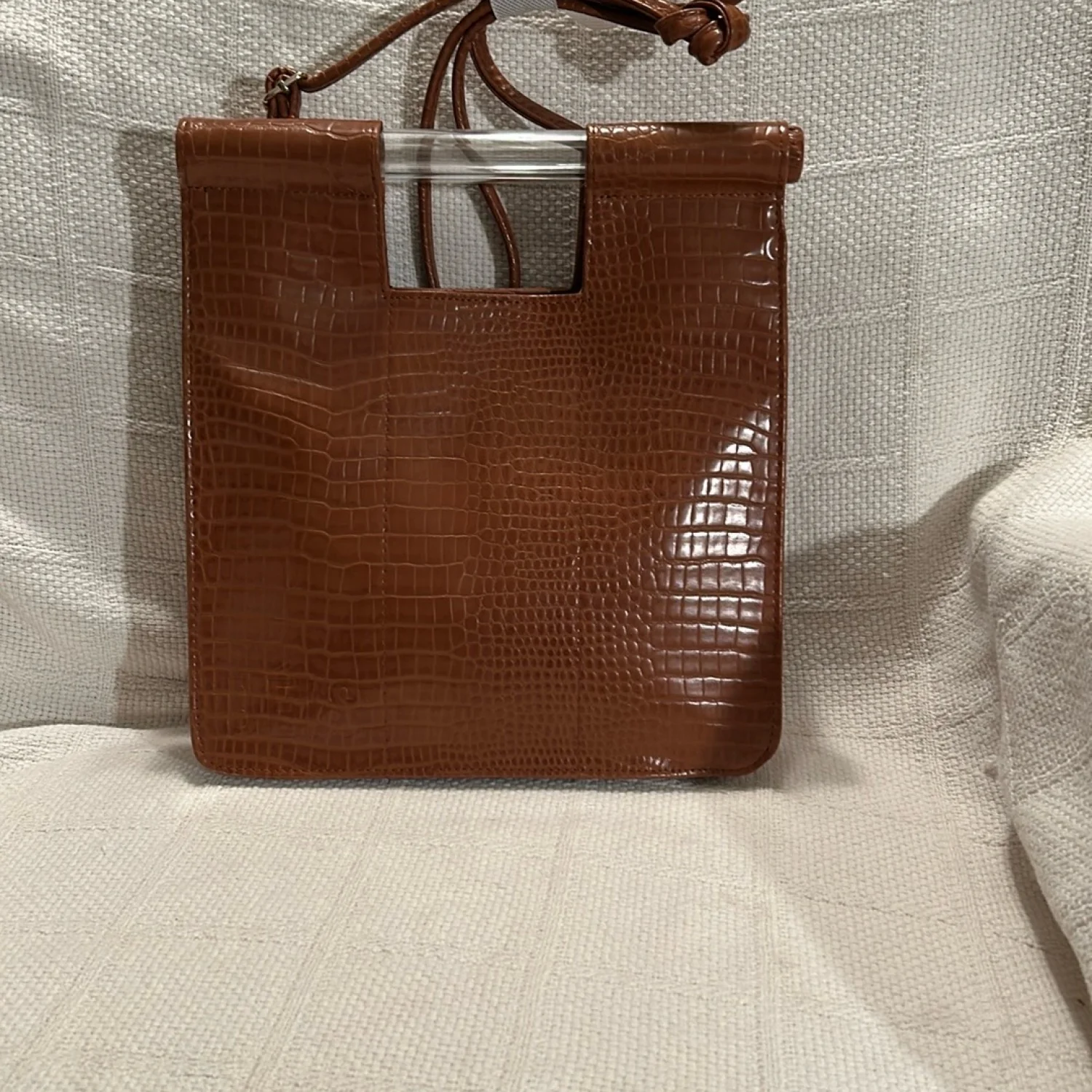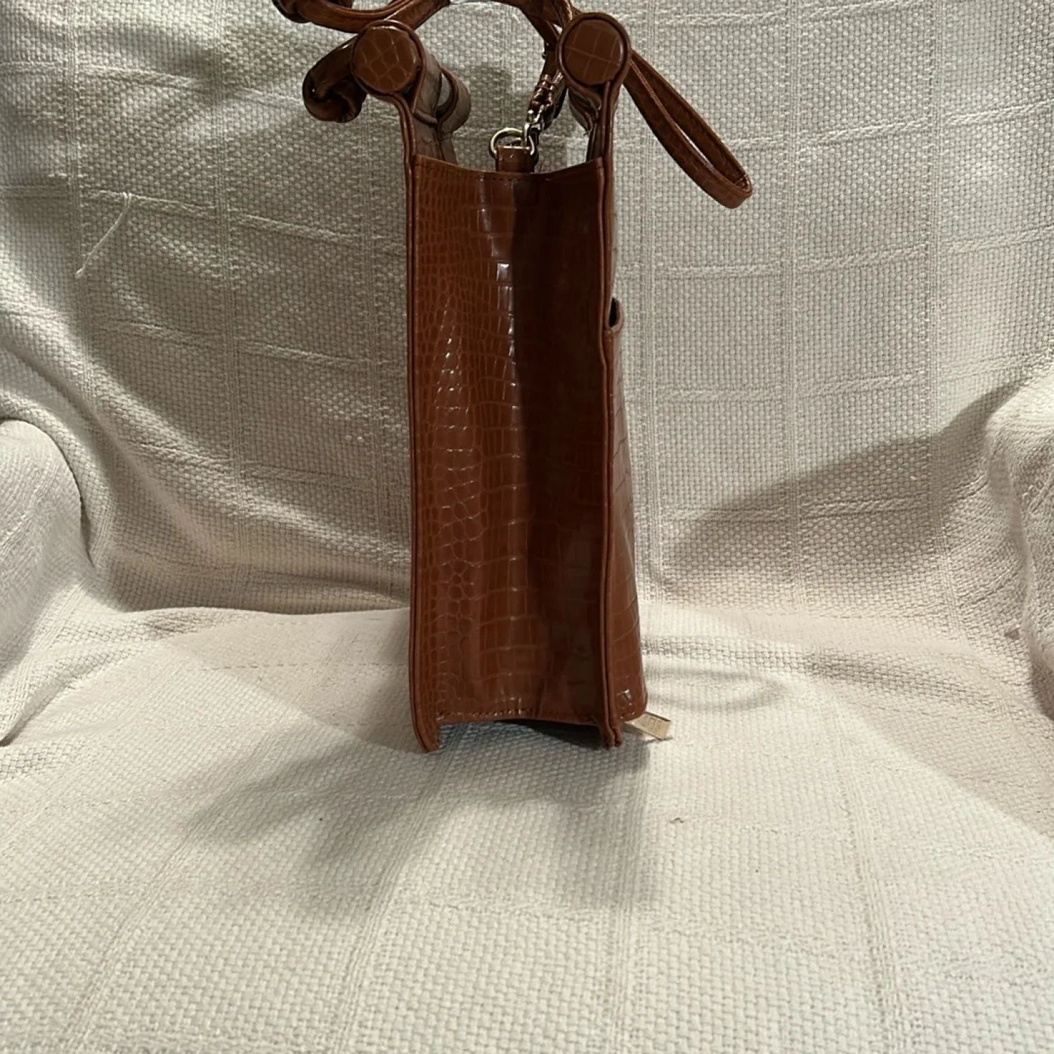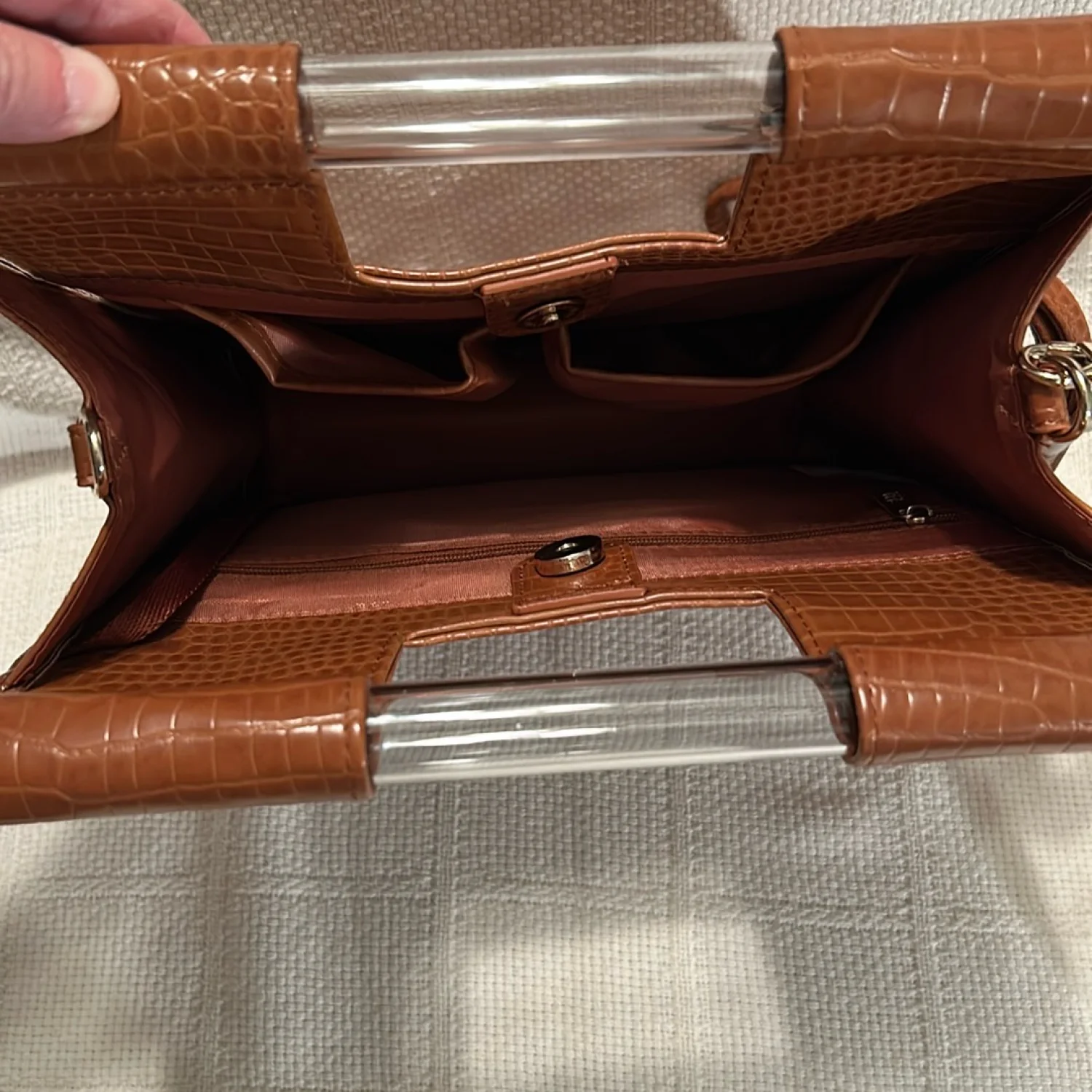 Stylish croc-embossed design. Removable crossbody straps. Plastic handles. Top snap closure. Attached strap on inside to secure keys. Zippered compartment on back wall of purse. Two pockets on front wall of purse. NWOT and from a smoke free home.