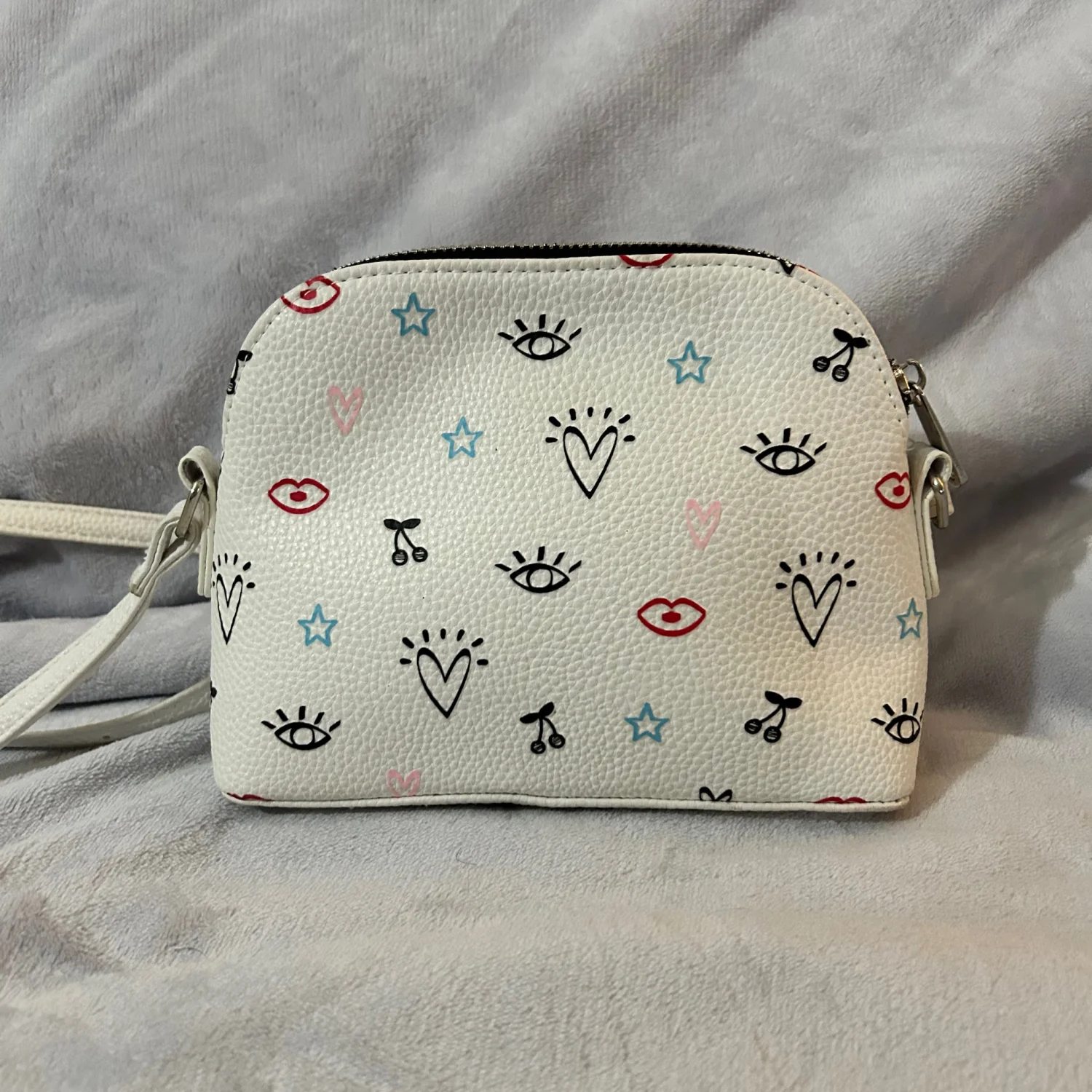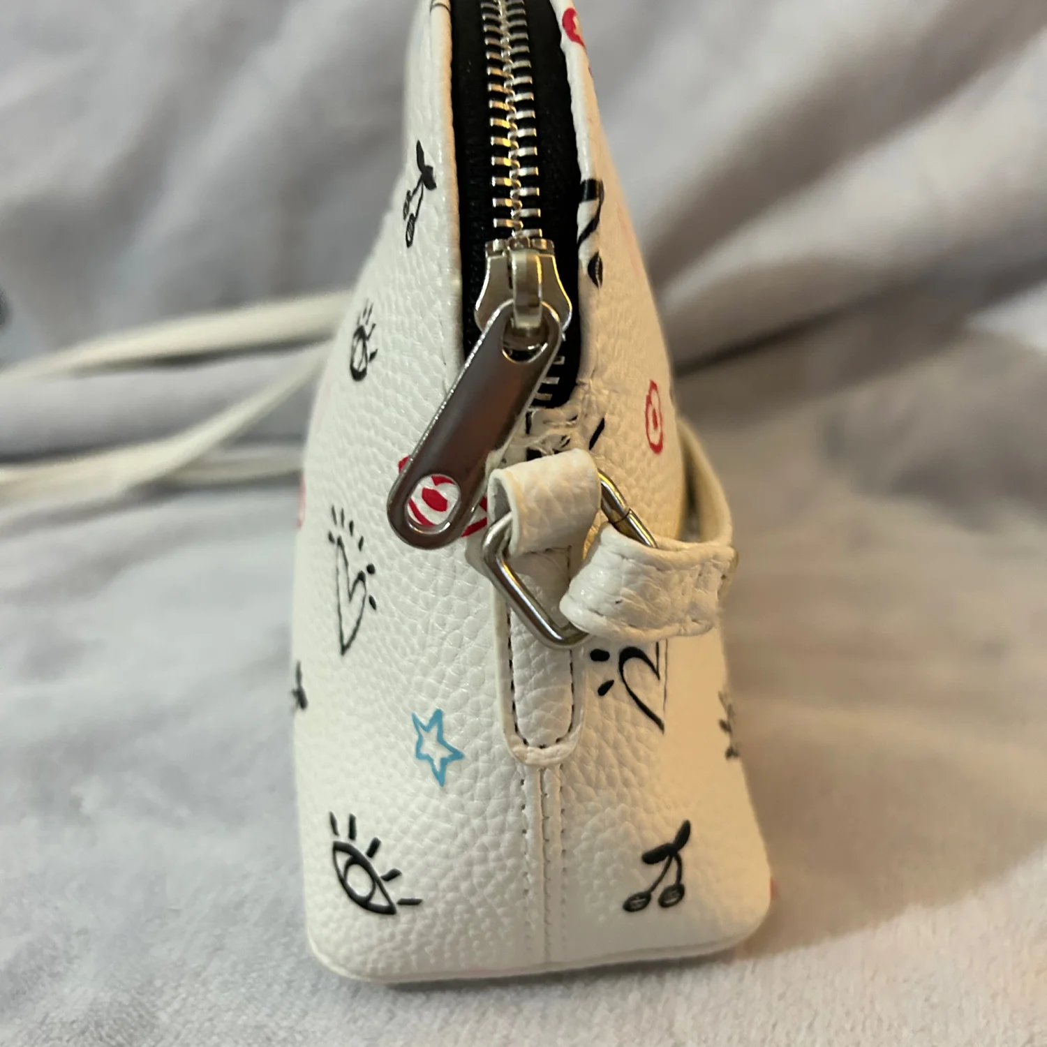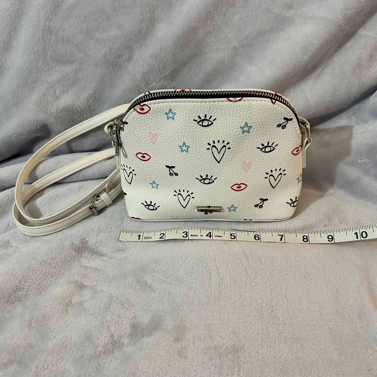 Cute white purse with a colorful fun design. Adjustable strap.