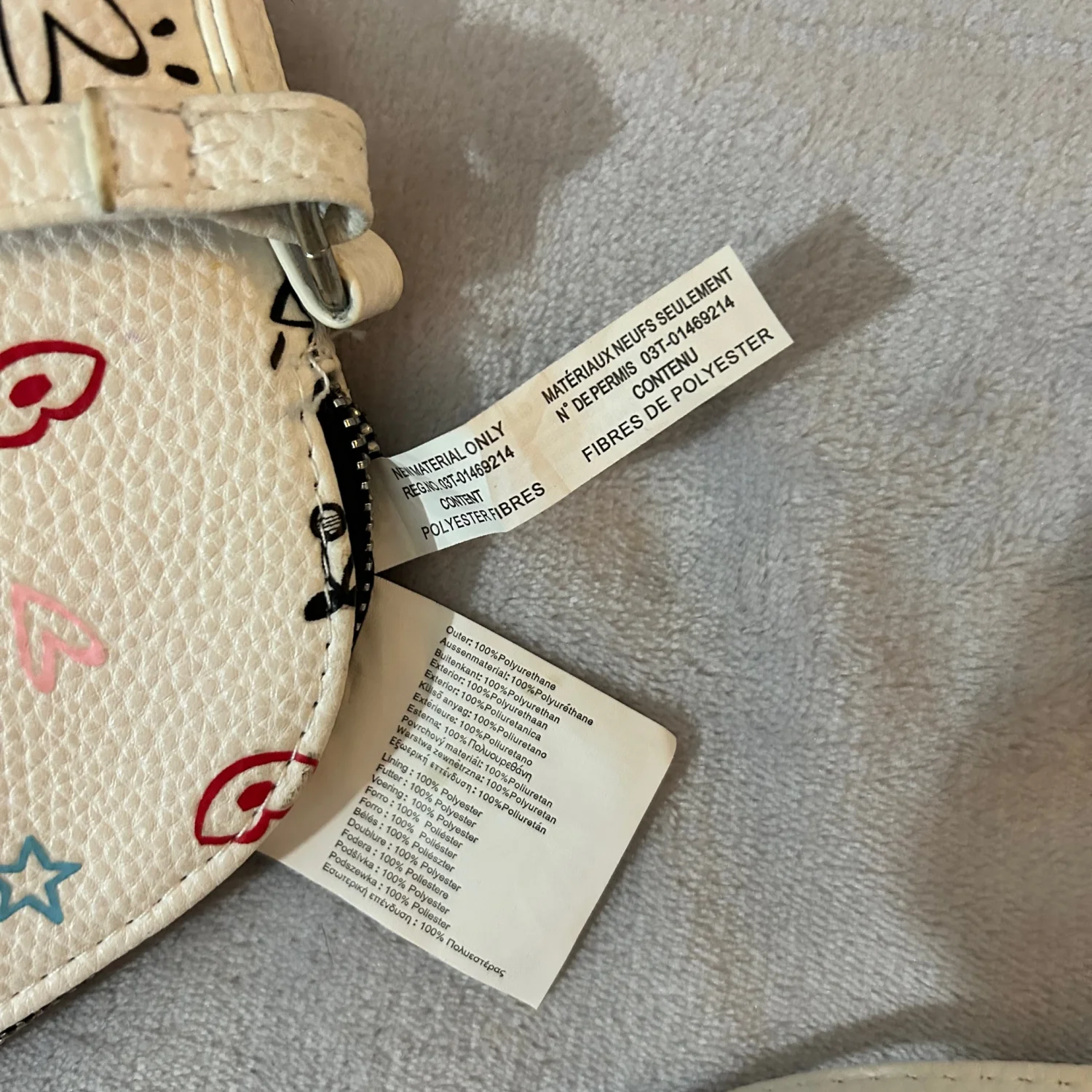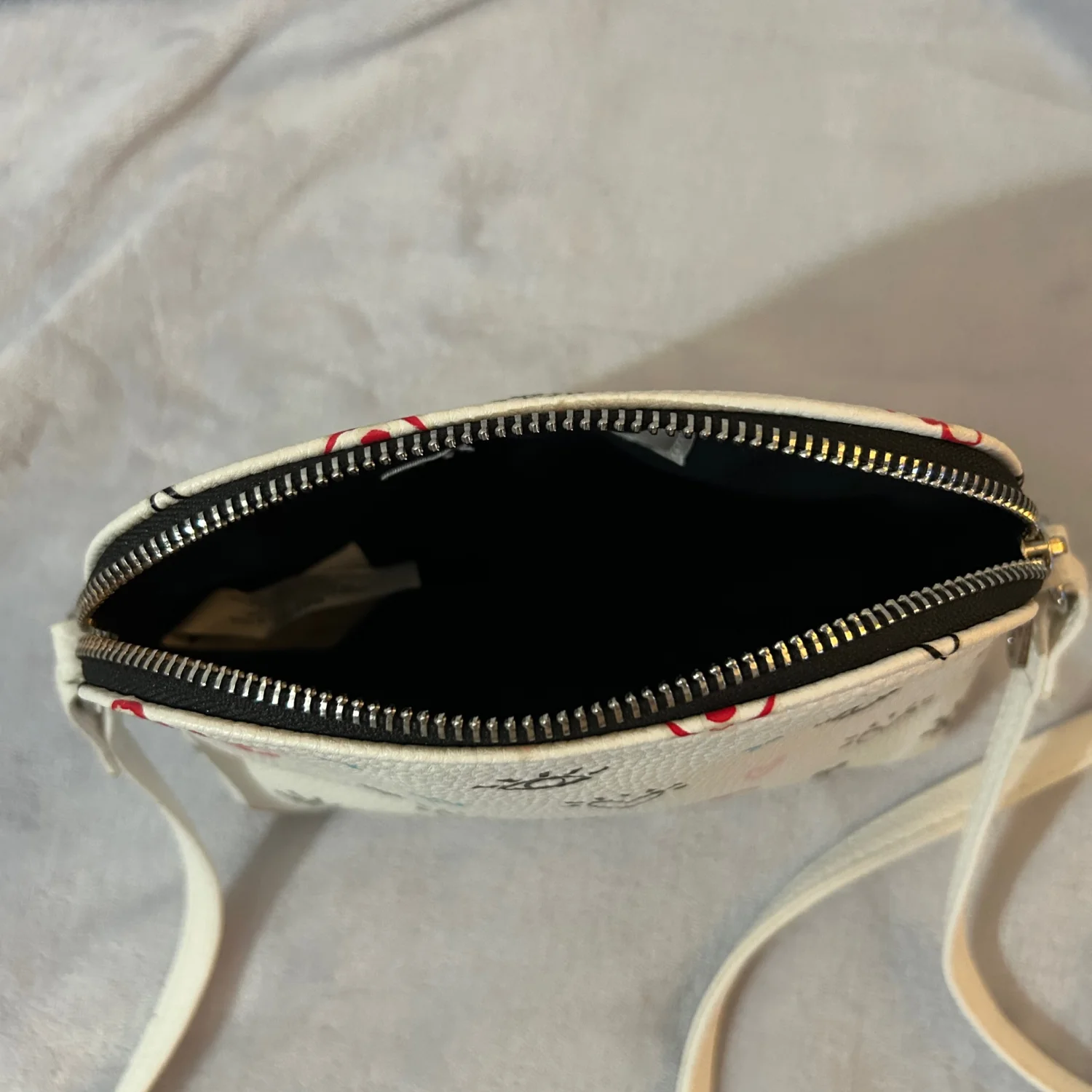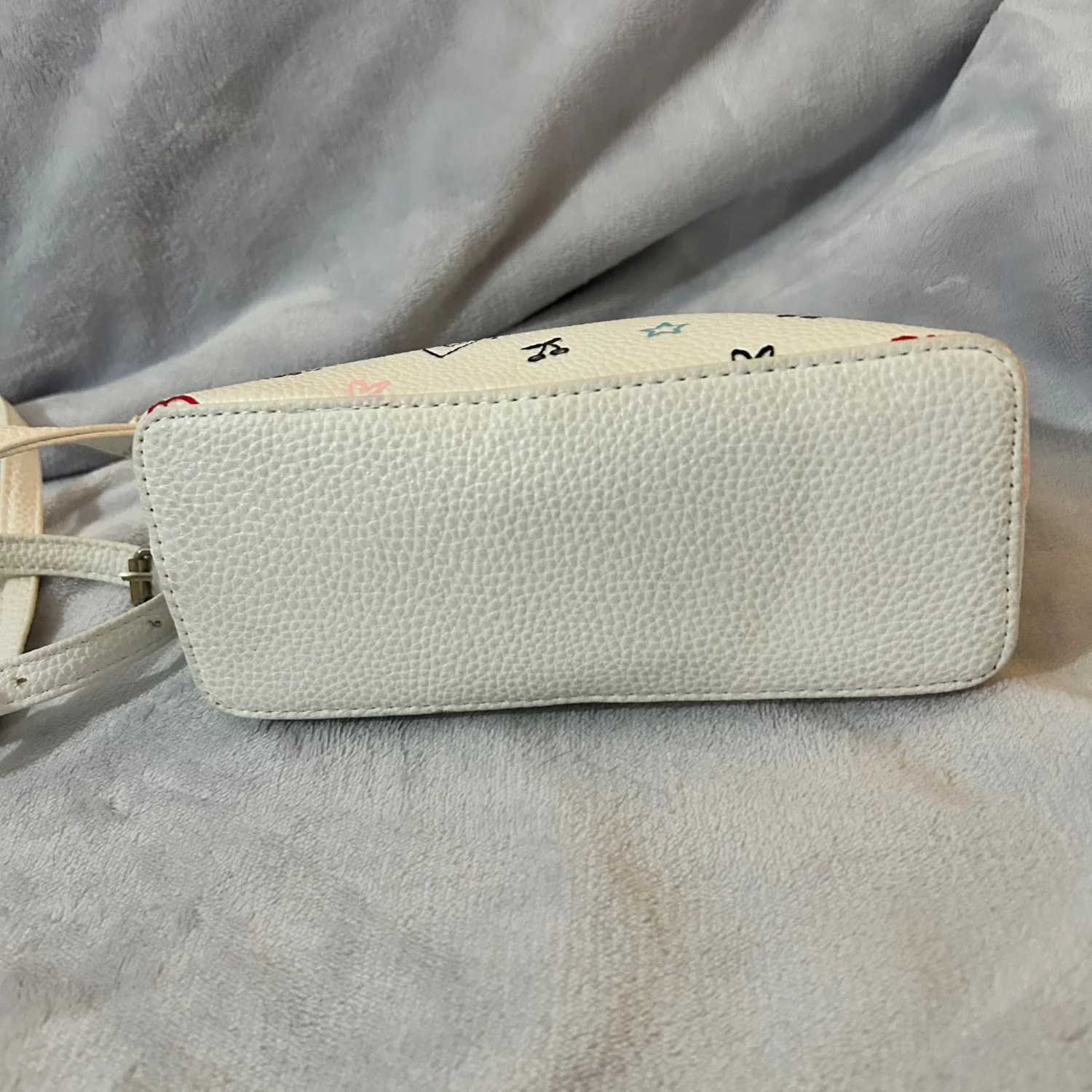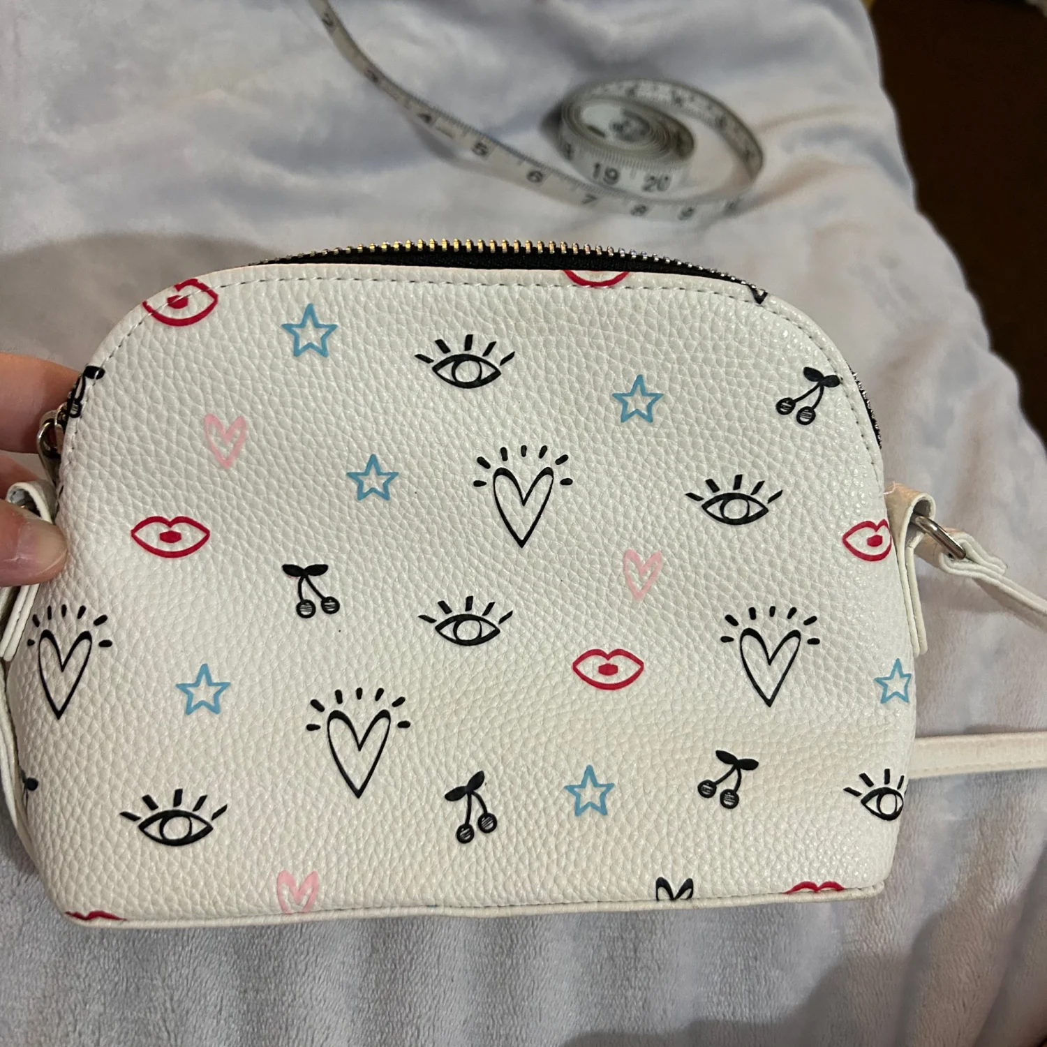 Cute white purse with a colorful fun design. Adjustable strap.