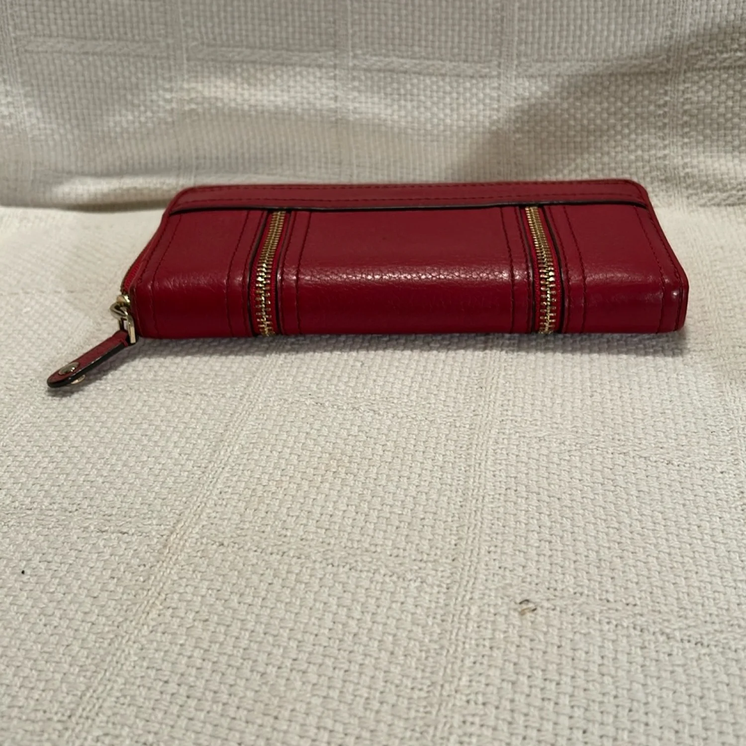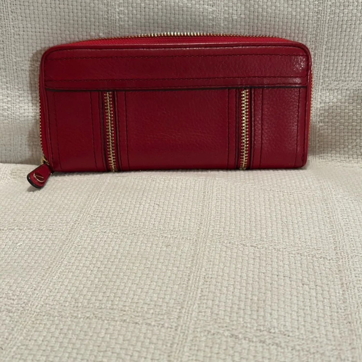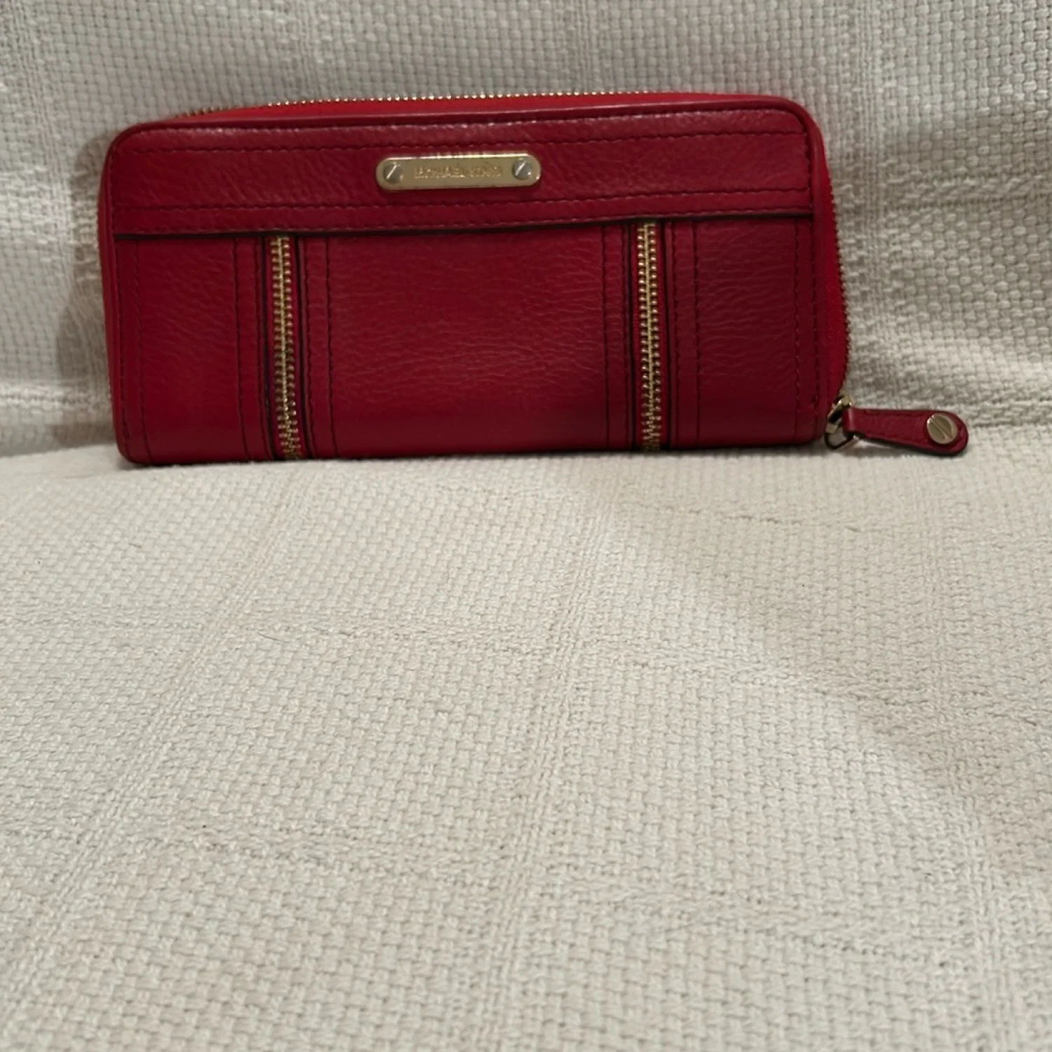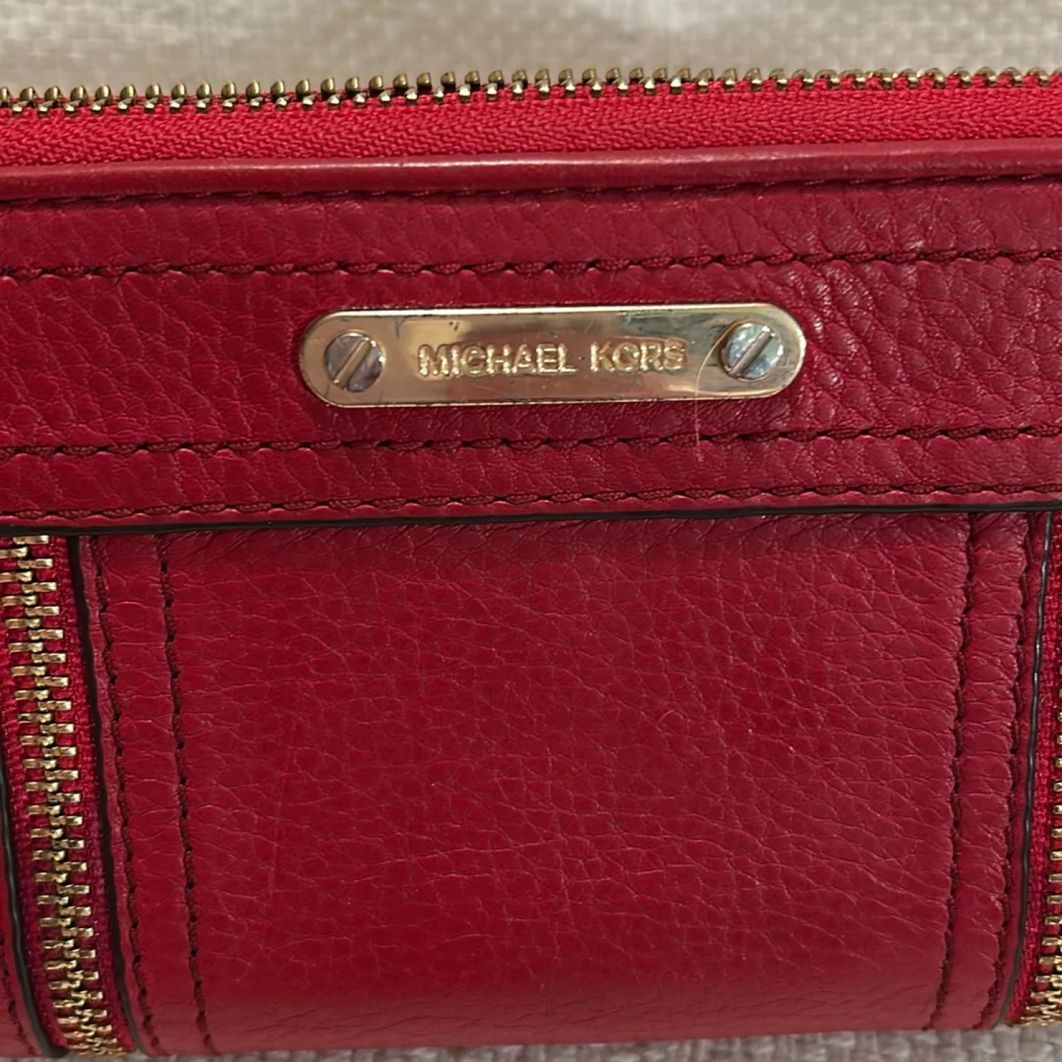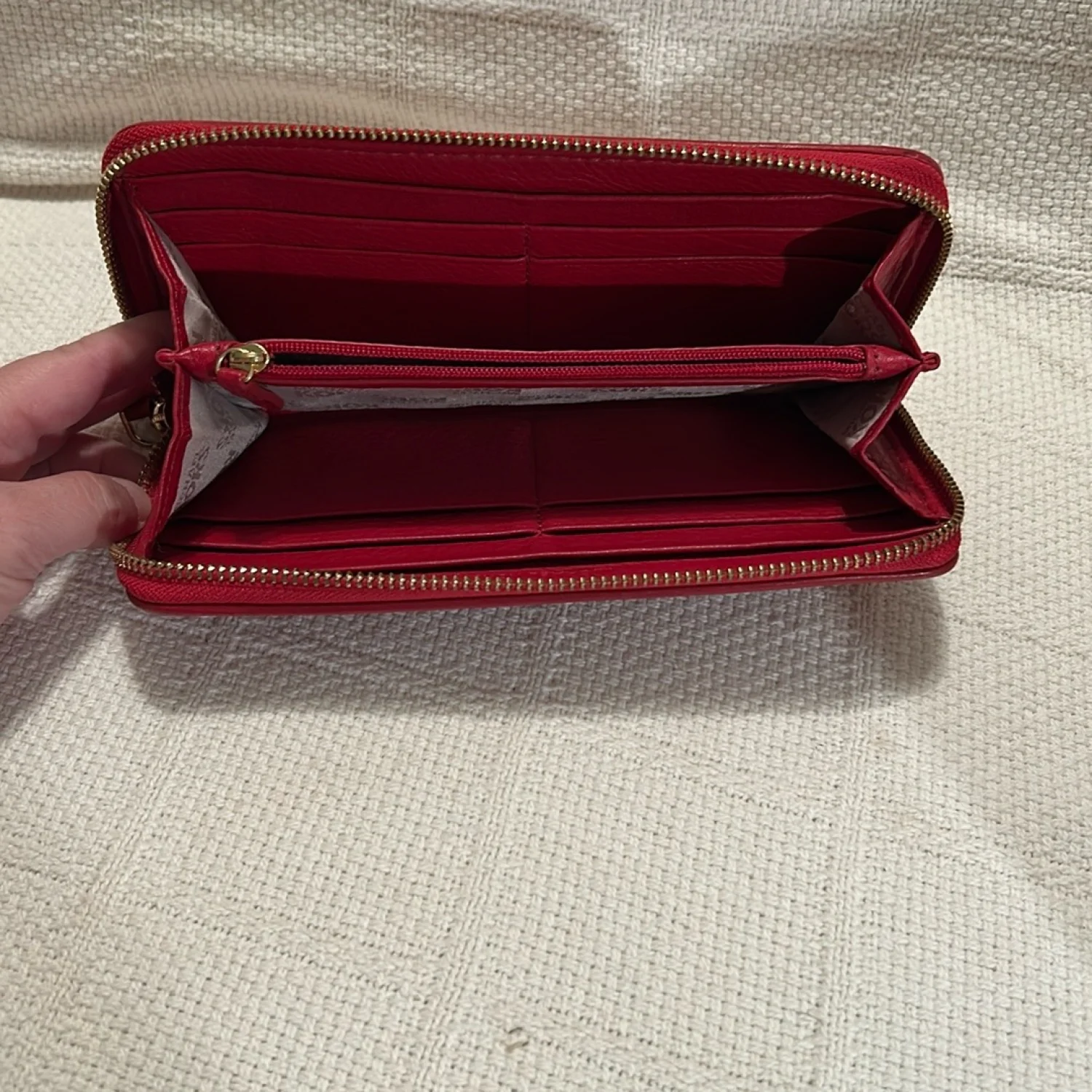 Red MK wallets with gold accents. Inside the main zippered compartment is another zippered compartment perfect for holding coins or other small items. Card/cash slots on both sides of interior zippered compartment.