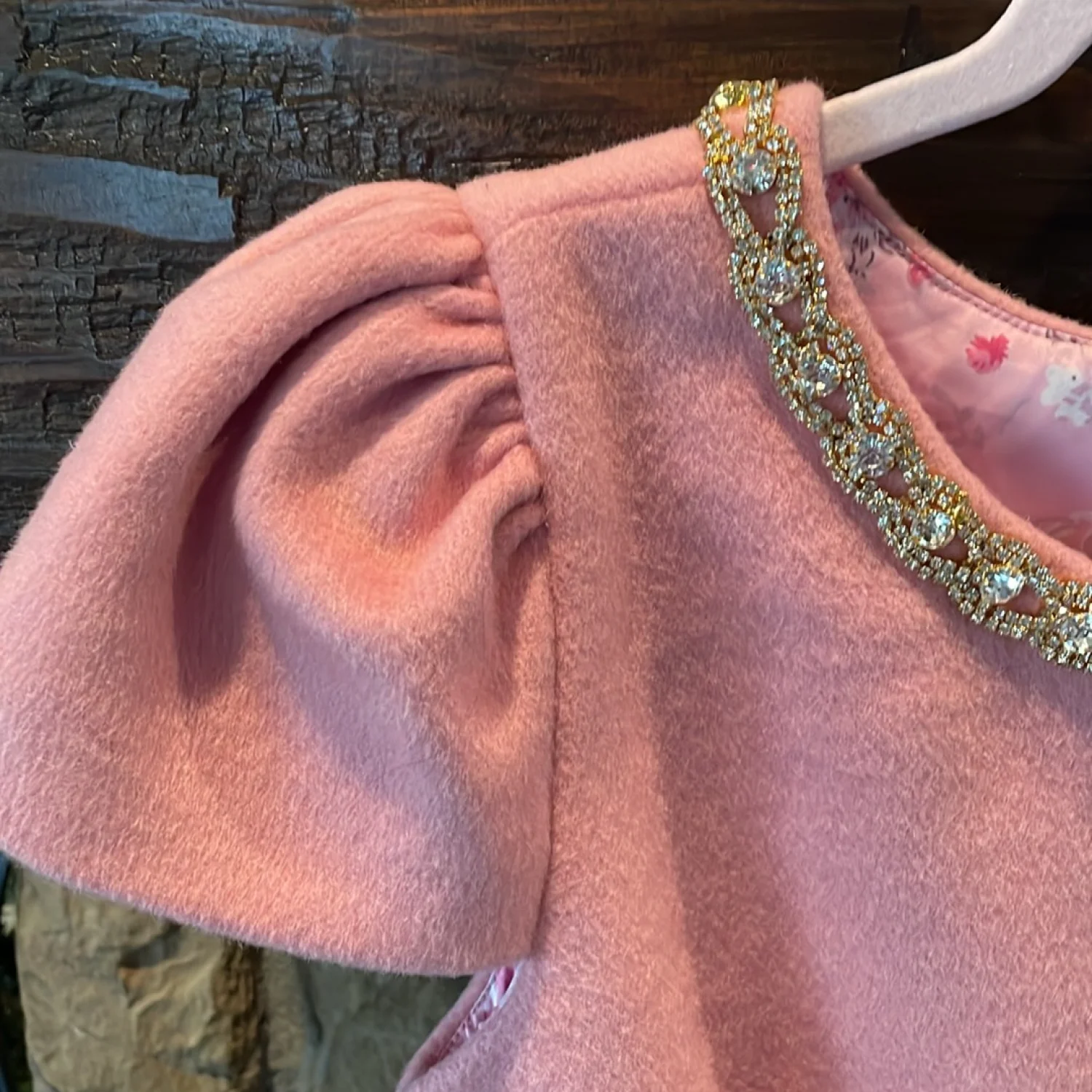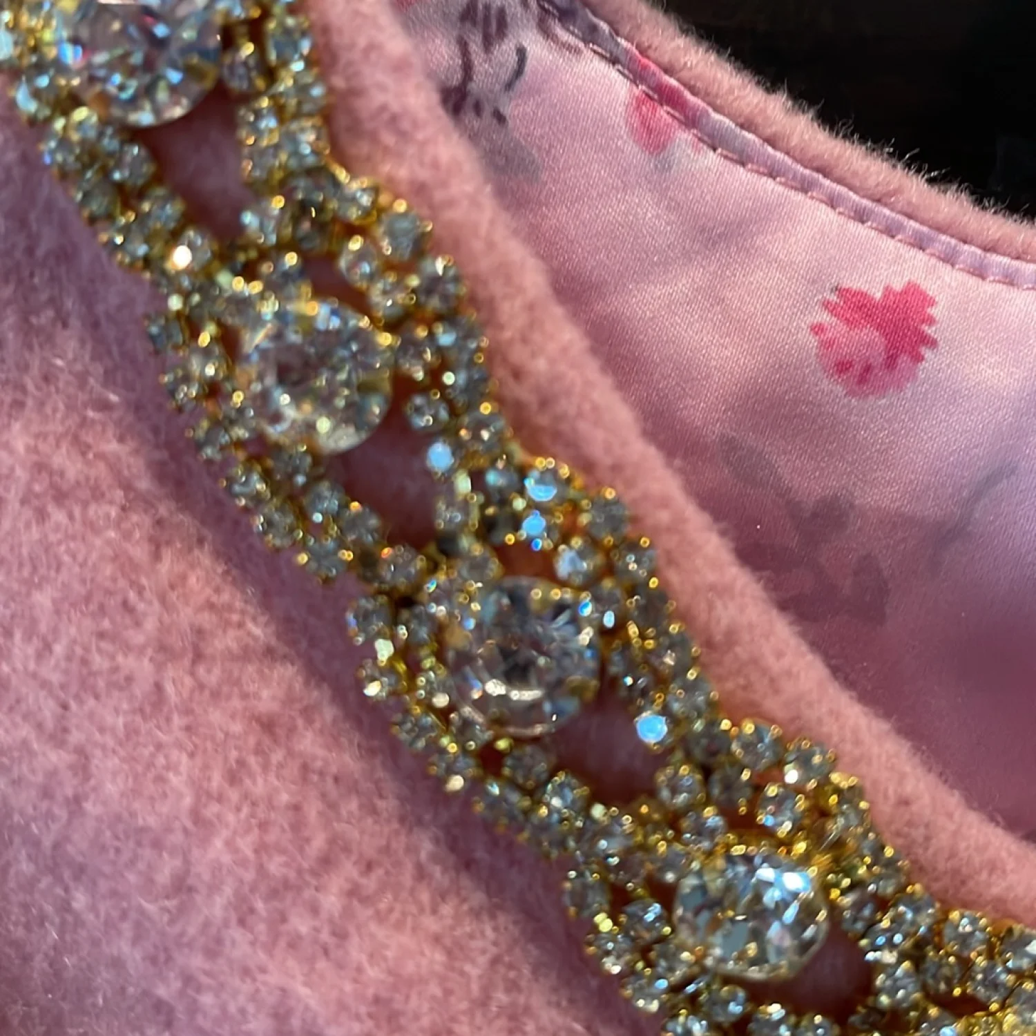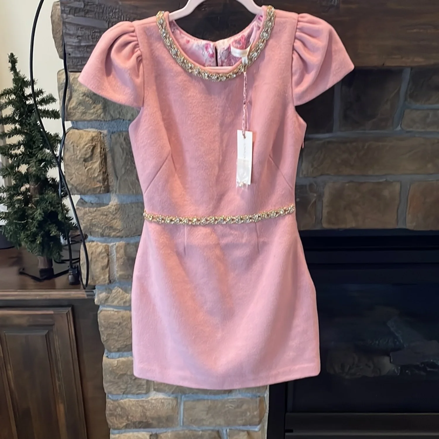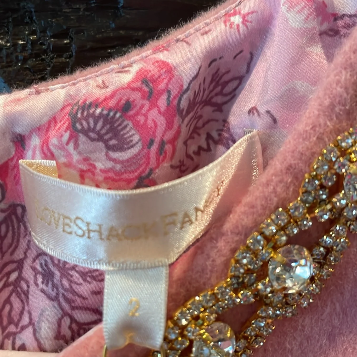 Twinkle in LoveShackFancy’s Toinette minidress. This wool-blend piece reimagines the classic shift silhouette with a romantic vision, appearing with sparkling embellishments to the neck and waistline, and delicate pleated short sleeves. Gorgeous crystals on the neck and waistline. Side zipper. Fully lined in a gorgeous feminine floral pattern. Pit to pit 16”, waist 13.5”, length 31”. Like new condition! MSRP $495