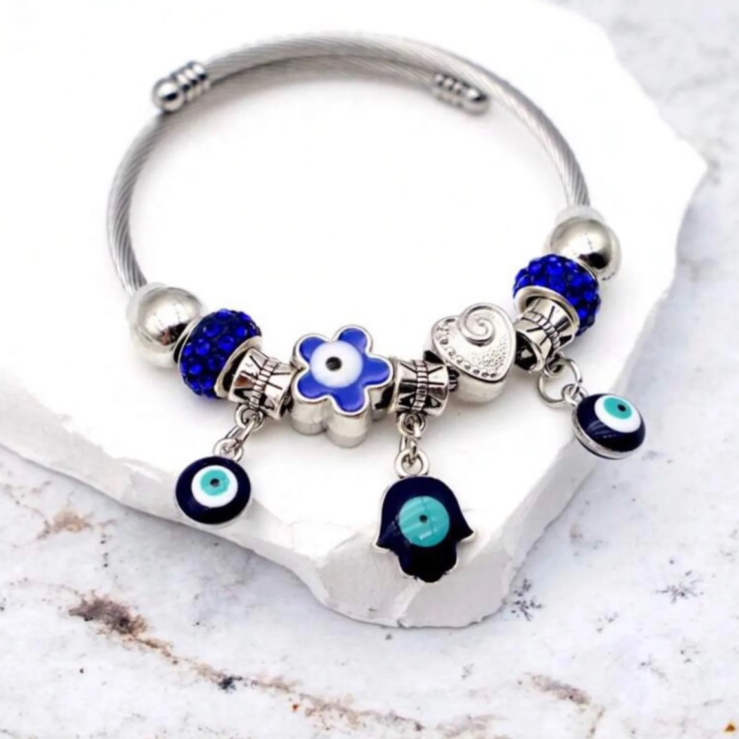 Evil Eye Pandora Style Charm Silver Crystal Bead Bangle Bracelet
