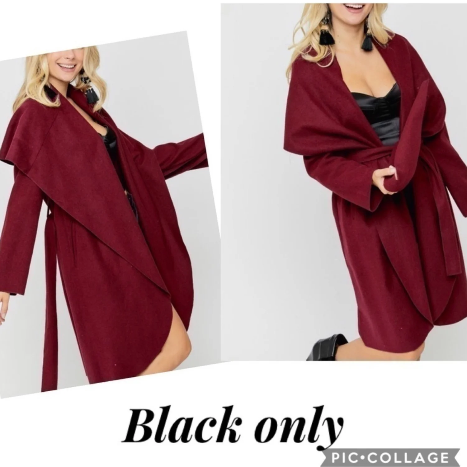 Black Wrap Jacket. Jacket has belt & full collar. Stops @/below knees. 100% poly. Sizes - Small, Medium & Large. Please state size when purchasing