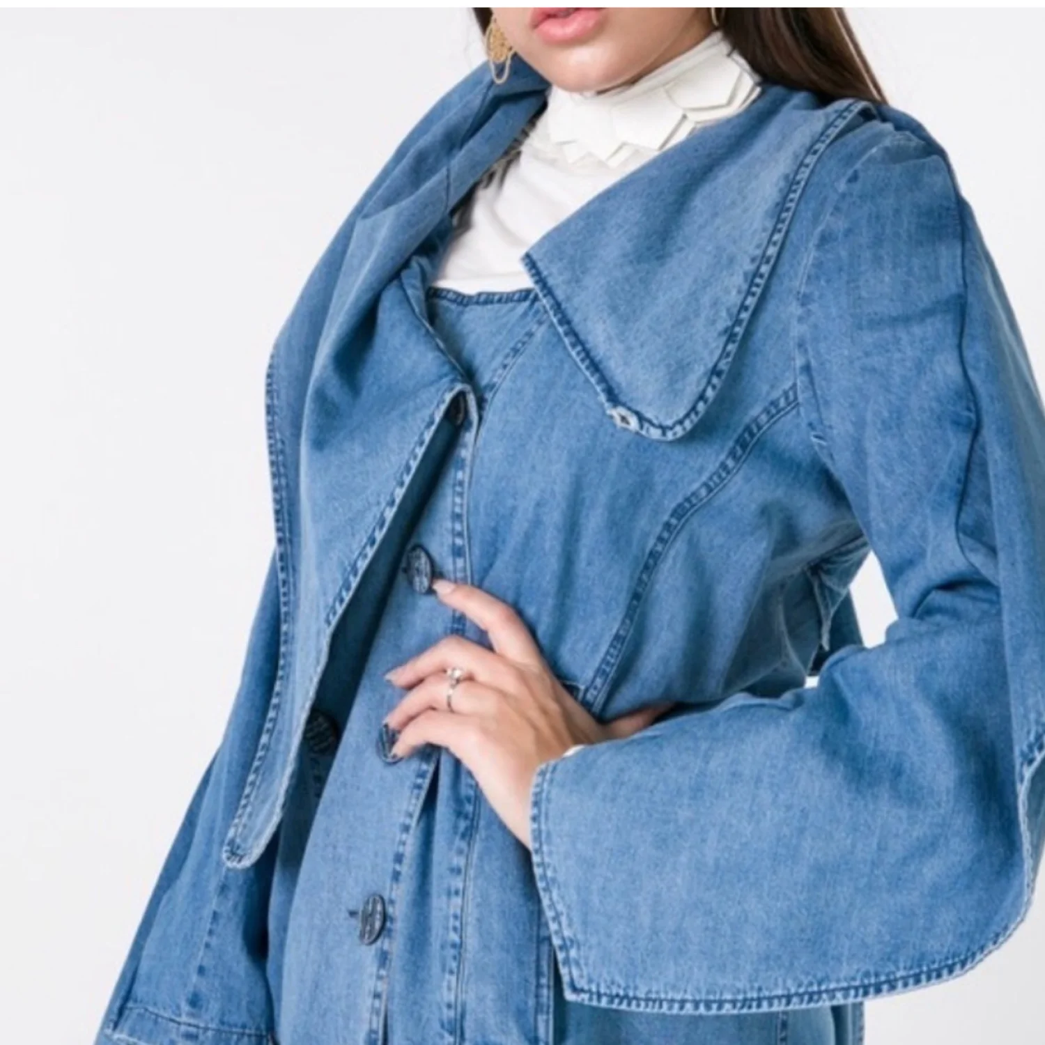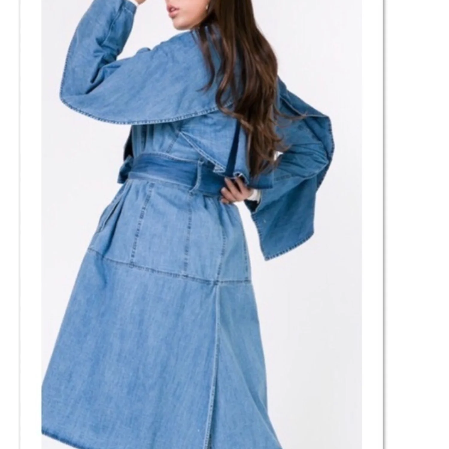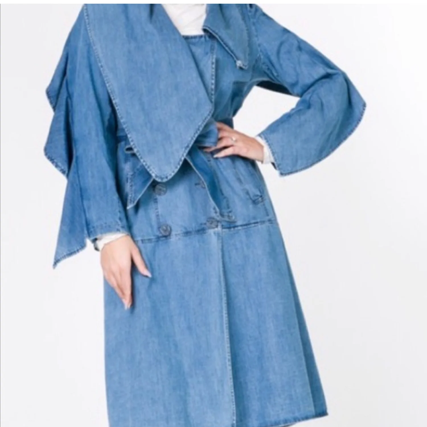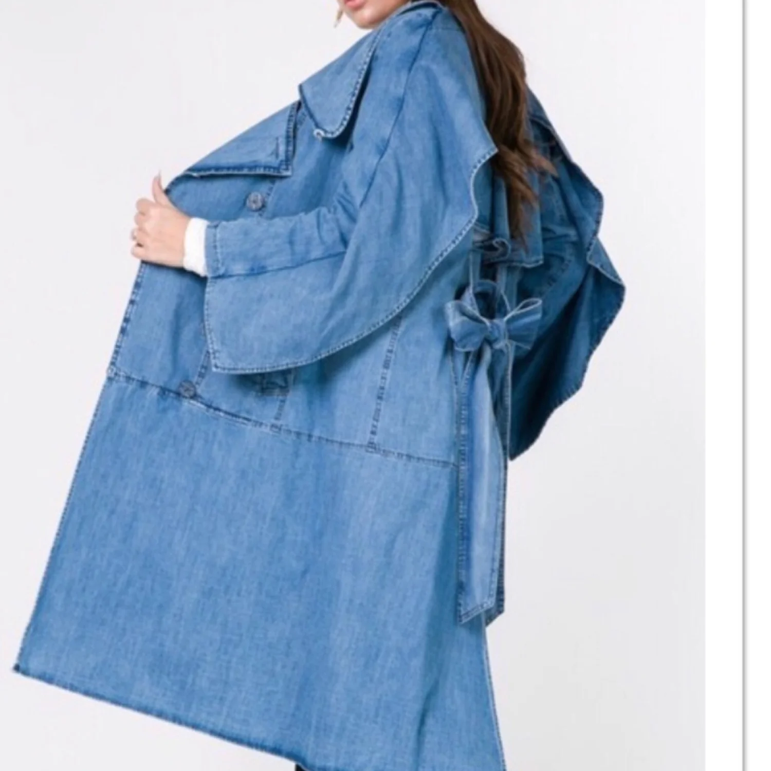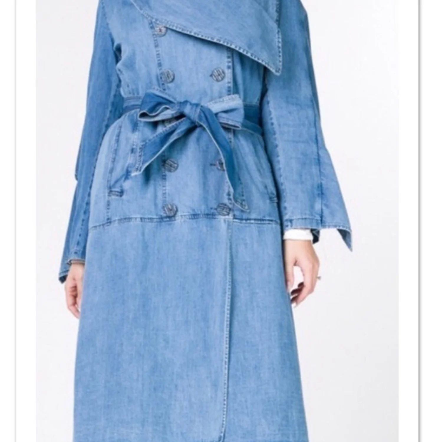 Denim Midi Trench. Coat has tie belt & double buttons. Wide versatile color. Side pockets. 100% cotton