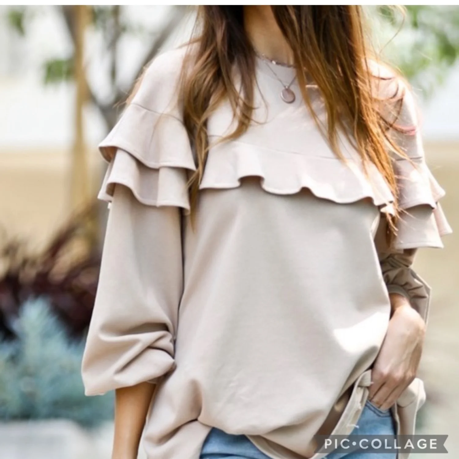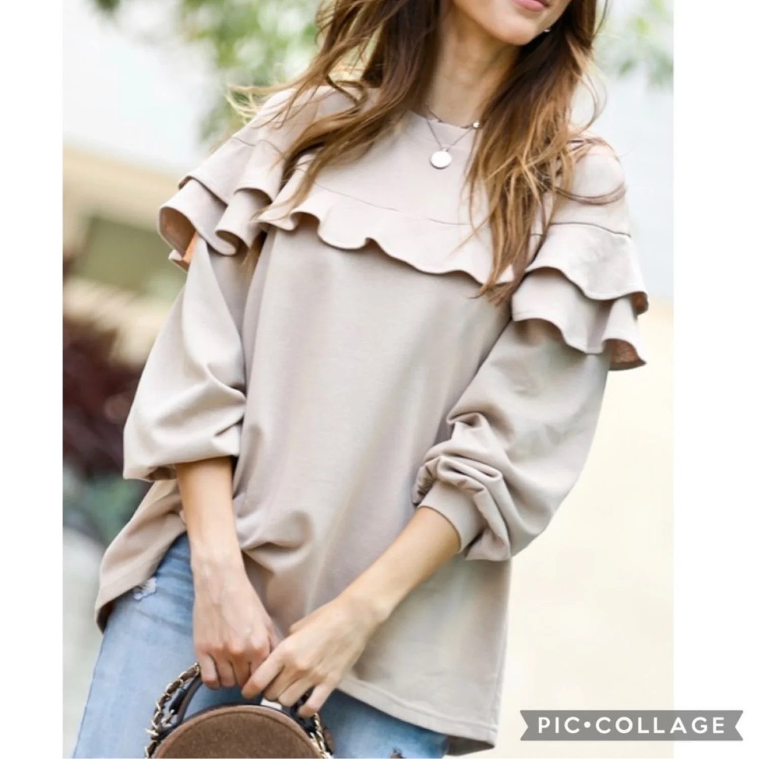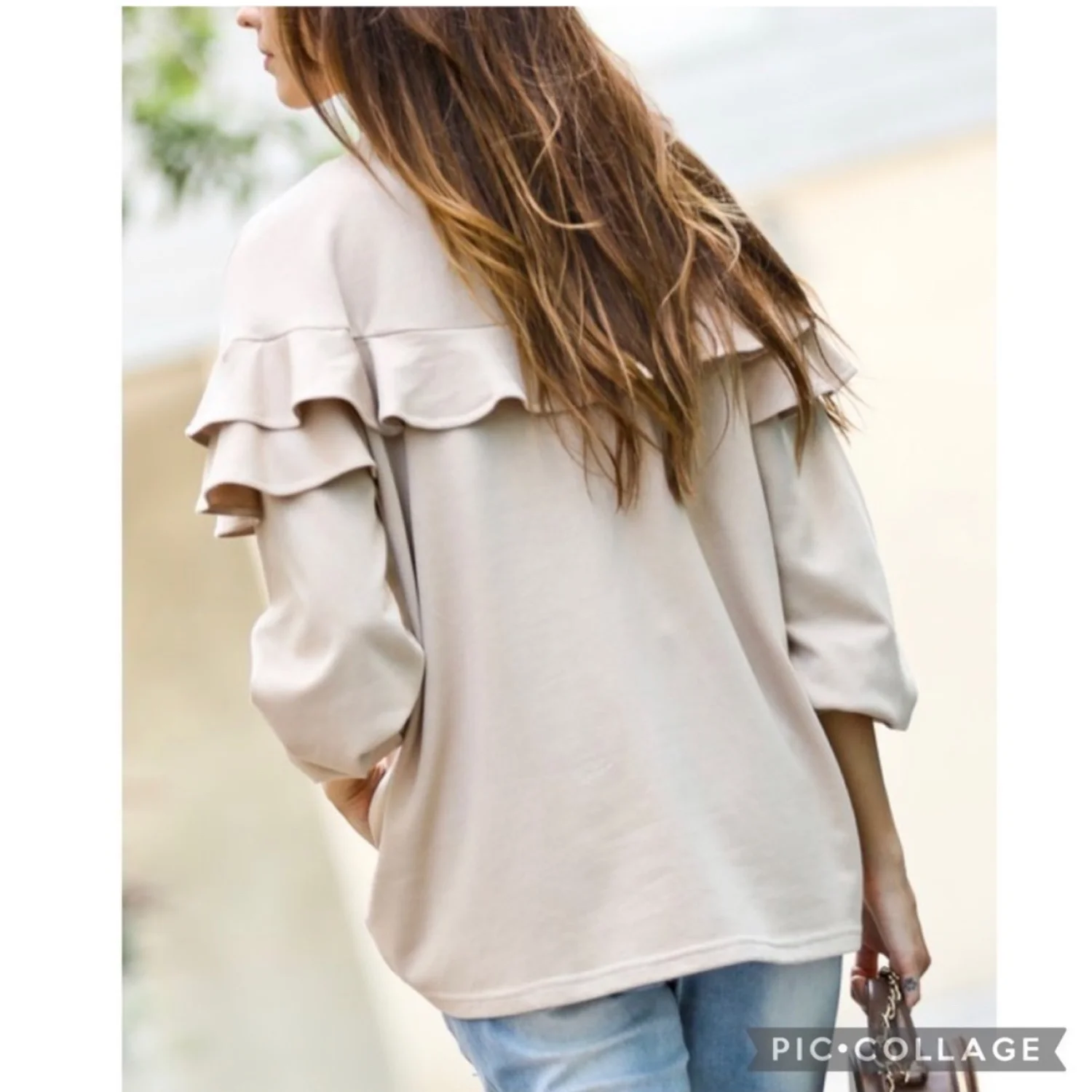 Cute tan long sleeve top. Top has Ruffle @ the top front & back. Loose fit. Runs big. 55% poly 45% cotton.