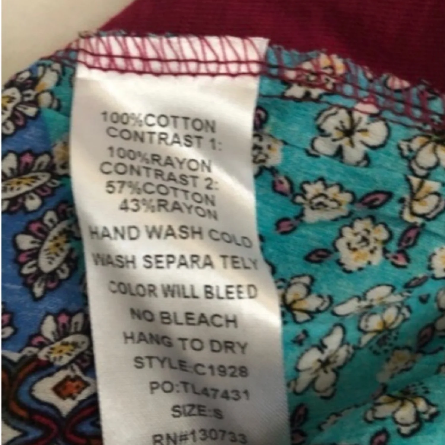 Cute wine dress w/boho print in back. Stops @ knees. Side pockets. True to size.