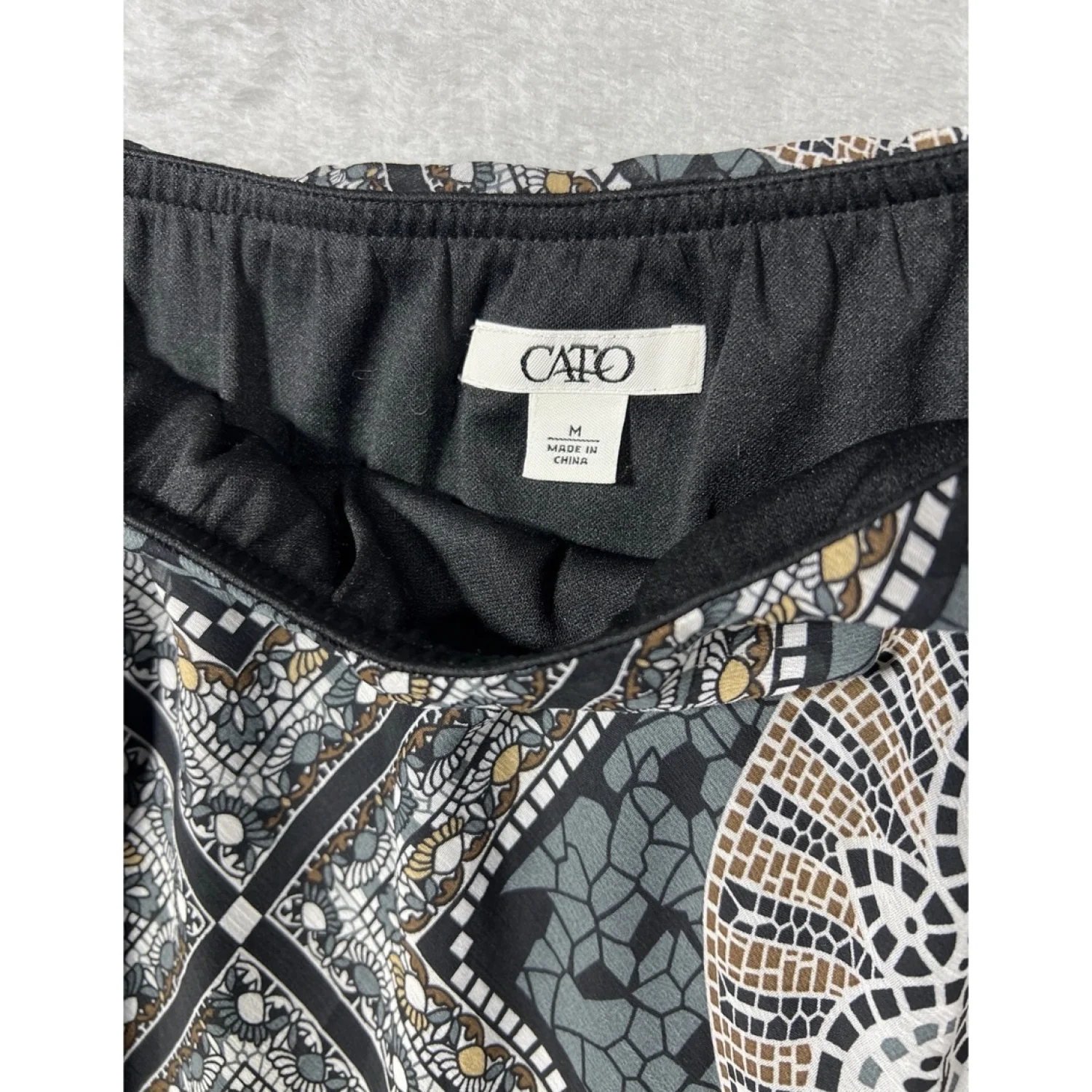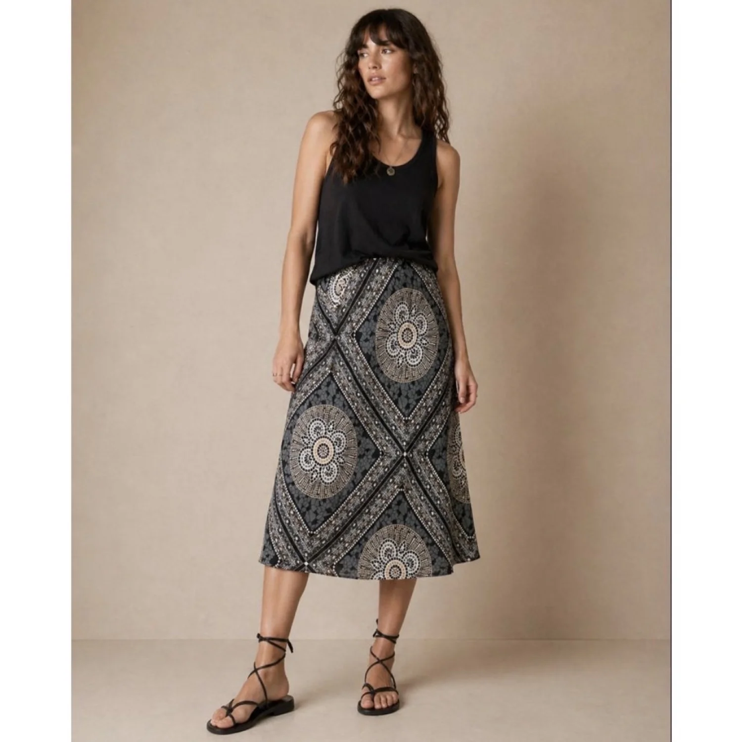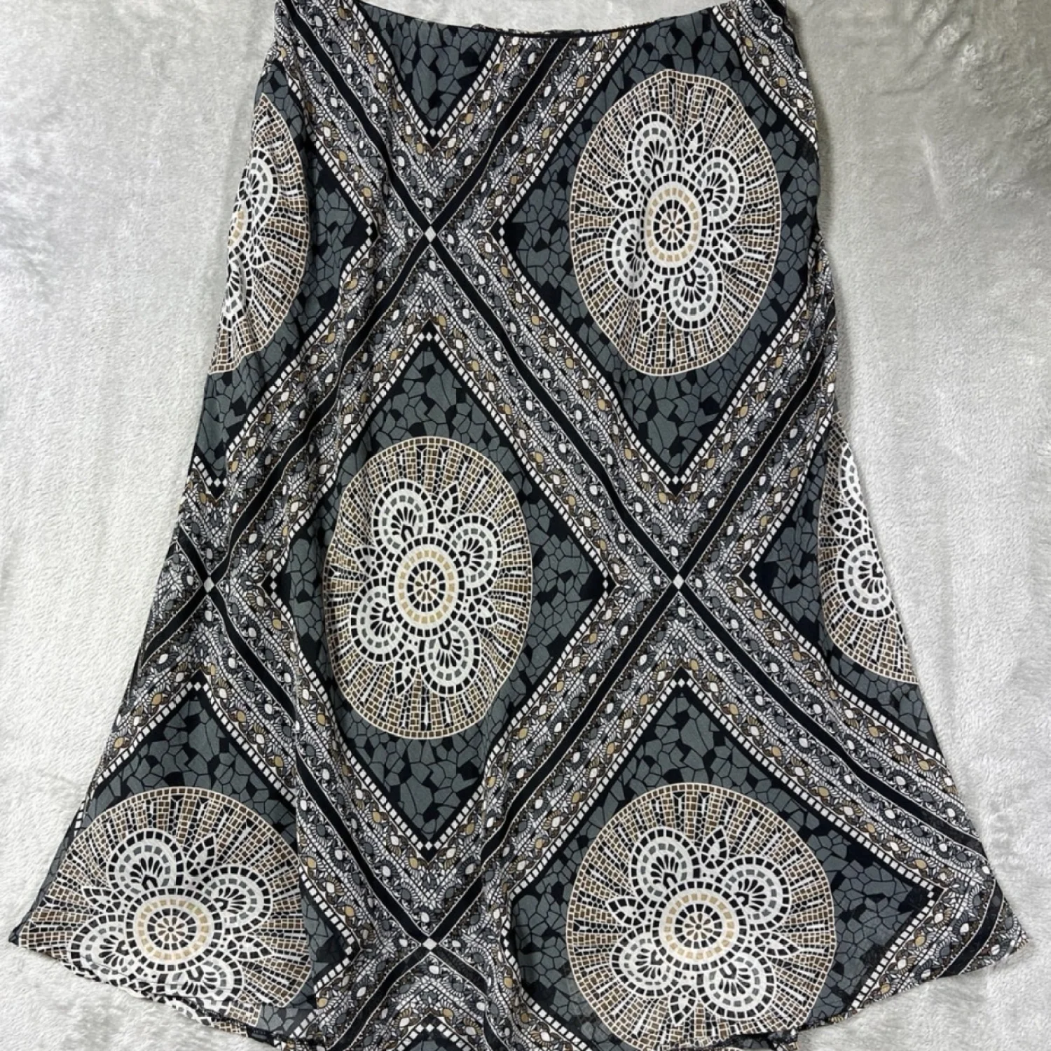 Size: Medium Measurements (flat): Waist: 14.5, Length: 28 Condition: Good pre-owned condition Color: Black, gray, tan Style: A-line, midi, flowy Closure: Pull-on A versatile piece that pairs well with simple tops for an effortless, laid-back look. boho midi skirt patterned skirt medallion print skirt geometric print skirt a line skirt flowy skirt casual everyday skirt lightweight skirt summer skirt neutral tones skirt earthy tones outfit relaxed style bohemia