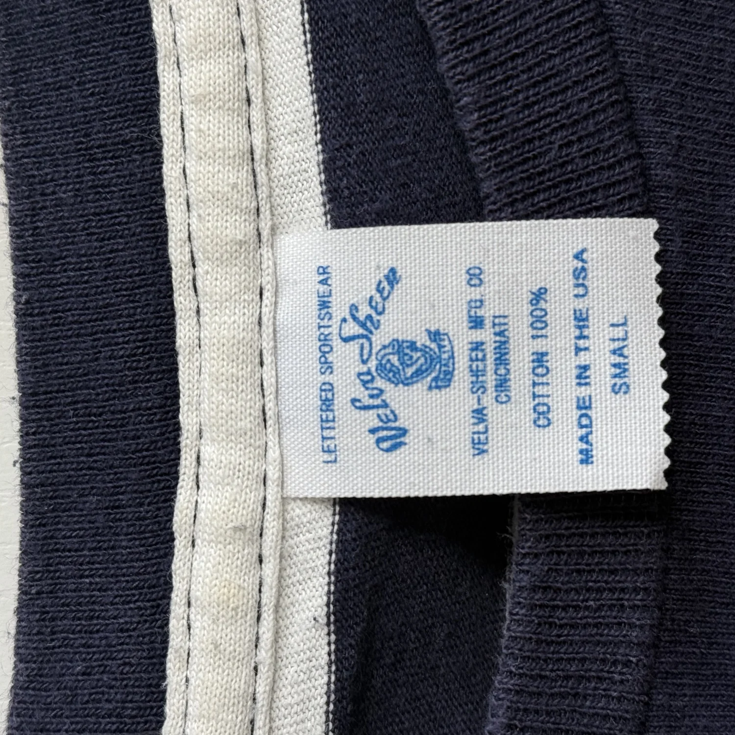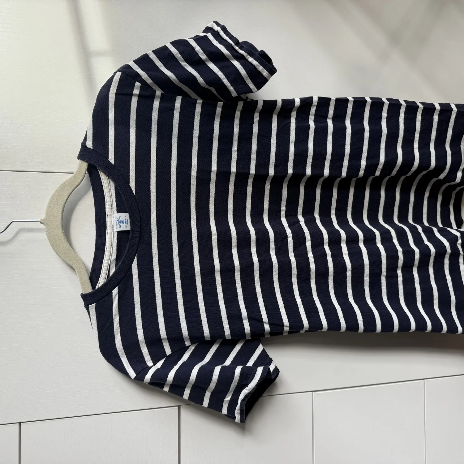 A navy blue and white striped t-shirt made of 100% cotton. The shirt is in excellent condition and made in the US. Slimmer fit than usual.