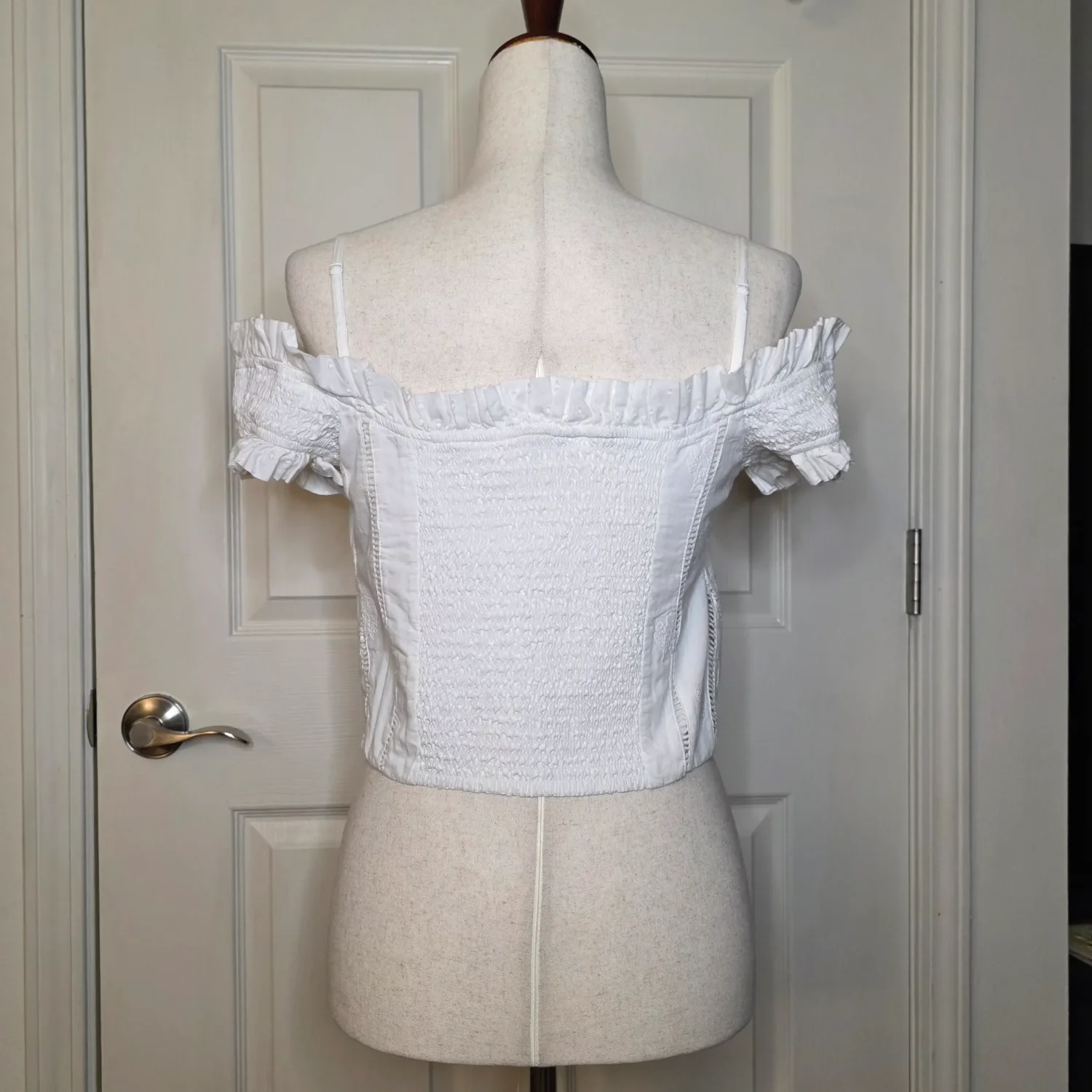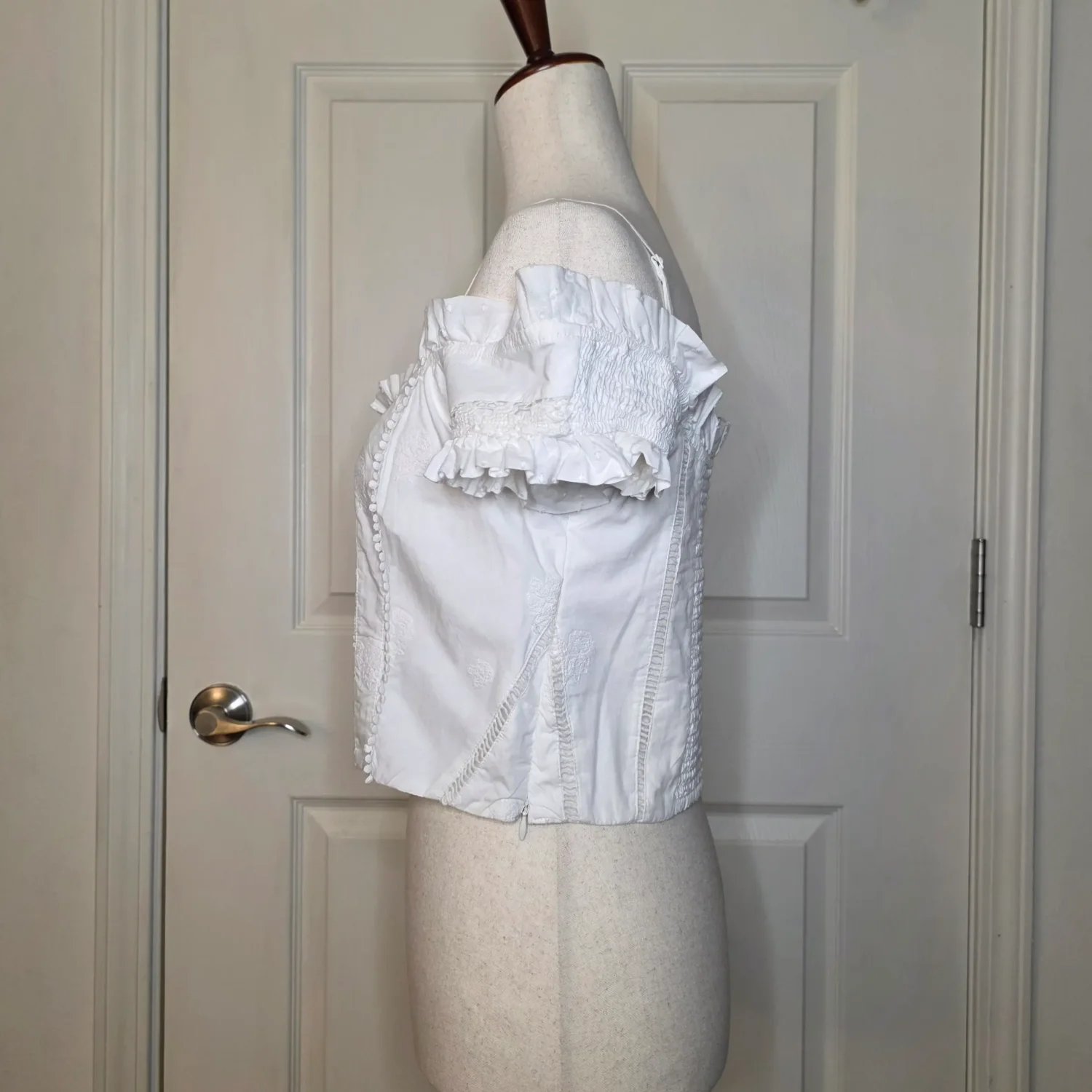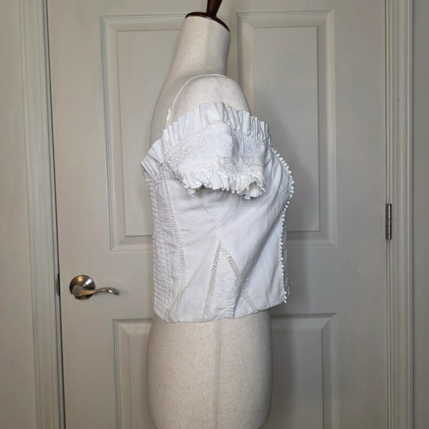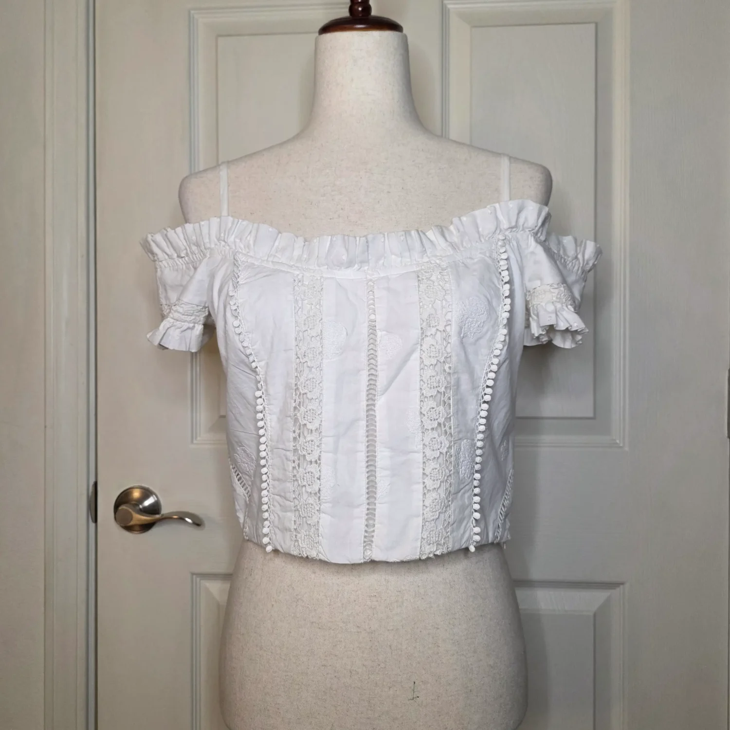 Anthropologie White Embroidered Lace Ruffle Trim Off The Shoulder Crop Top