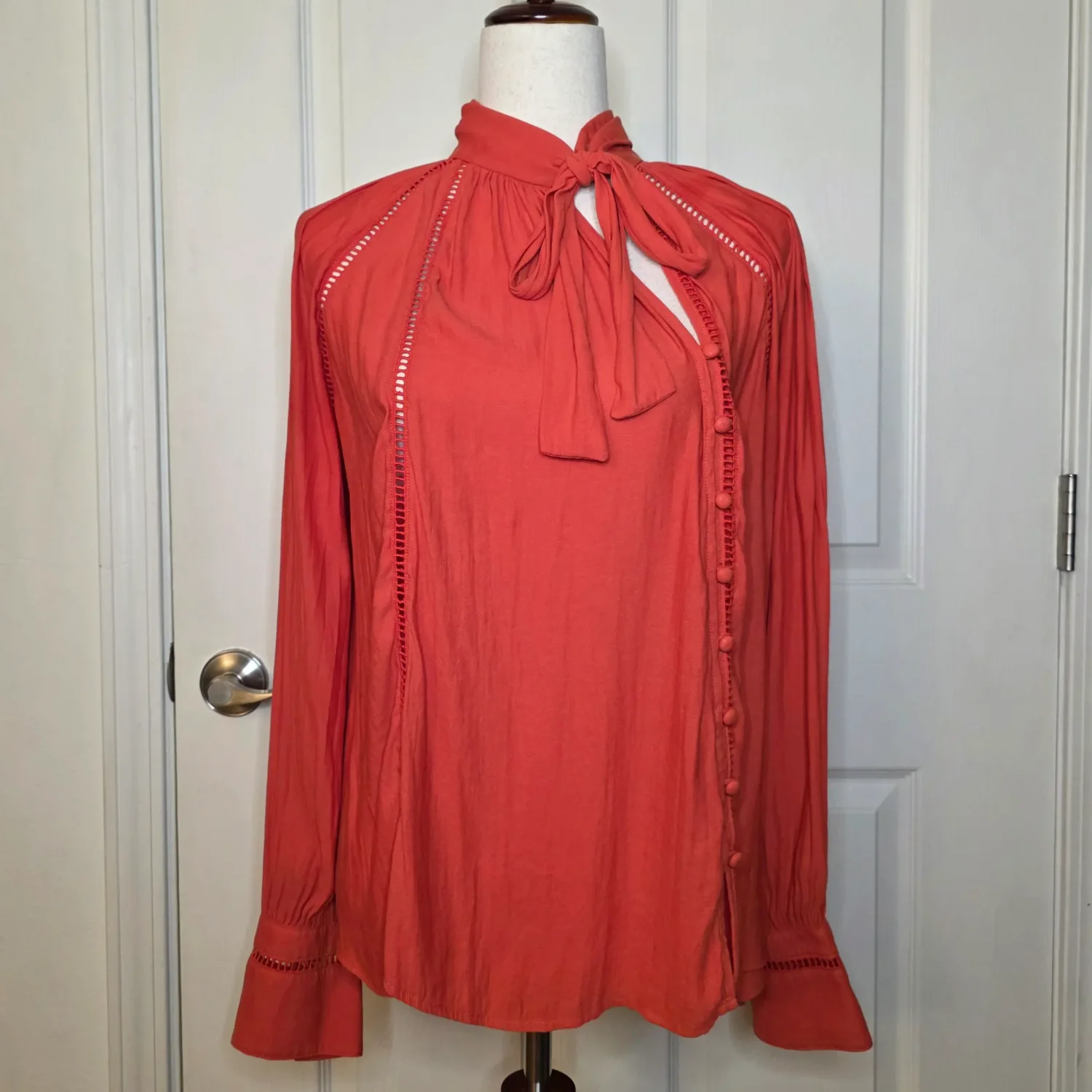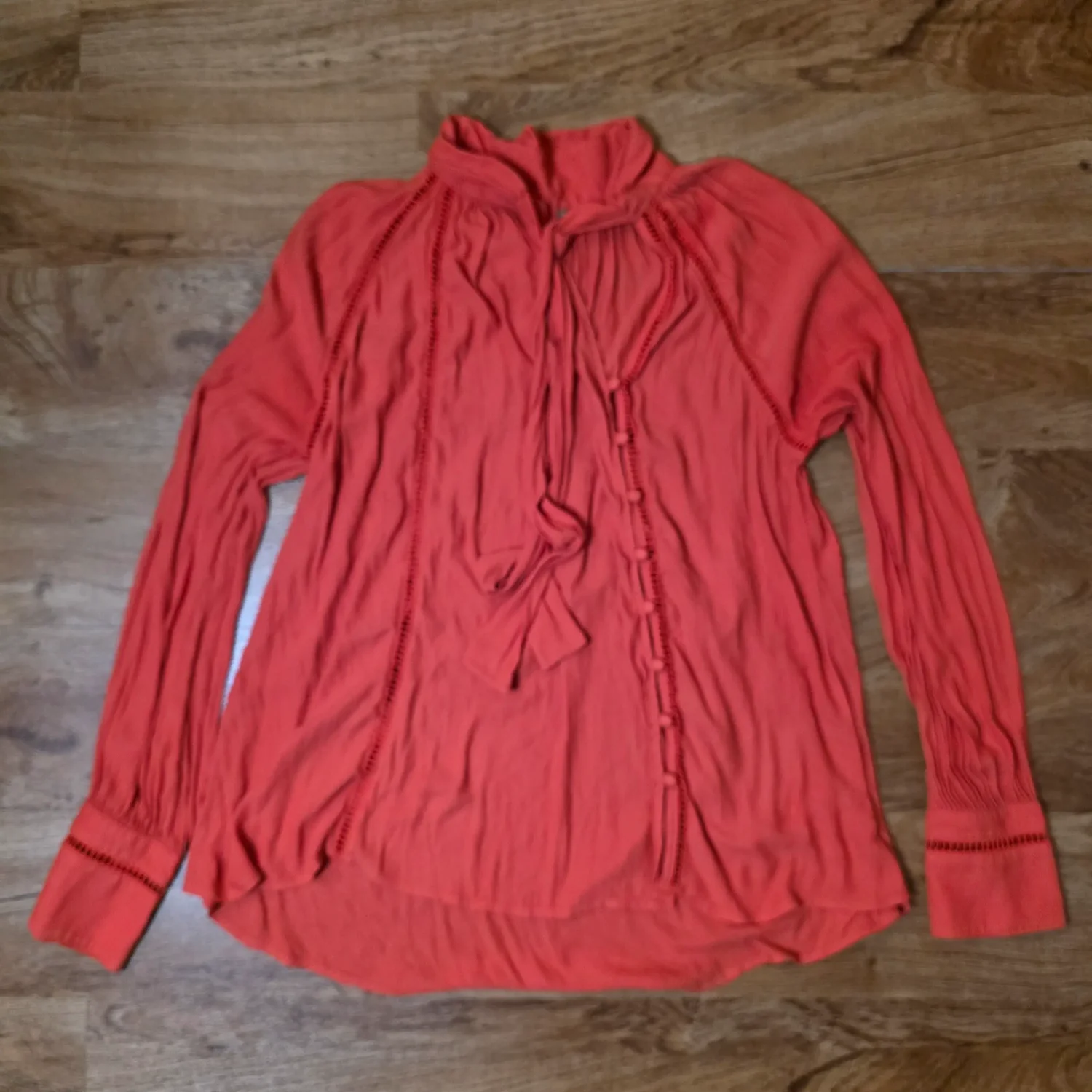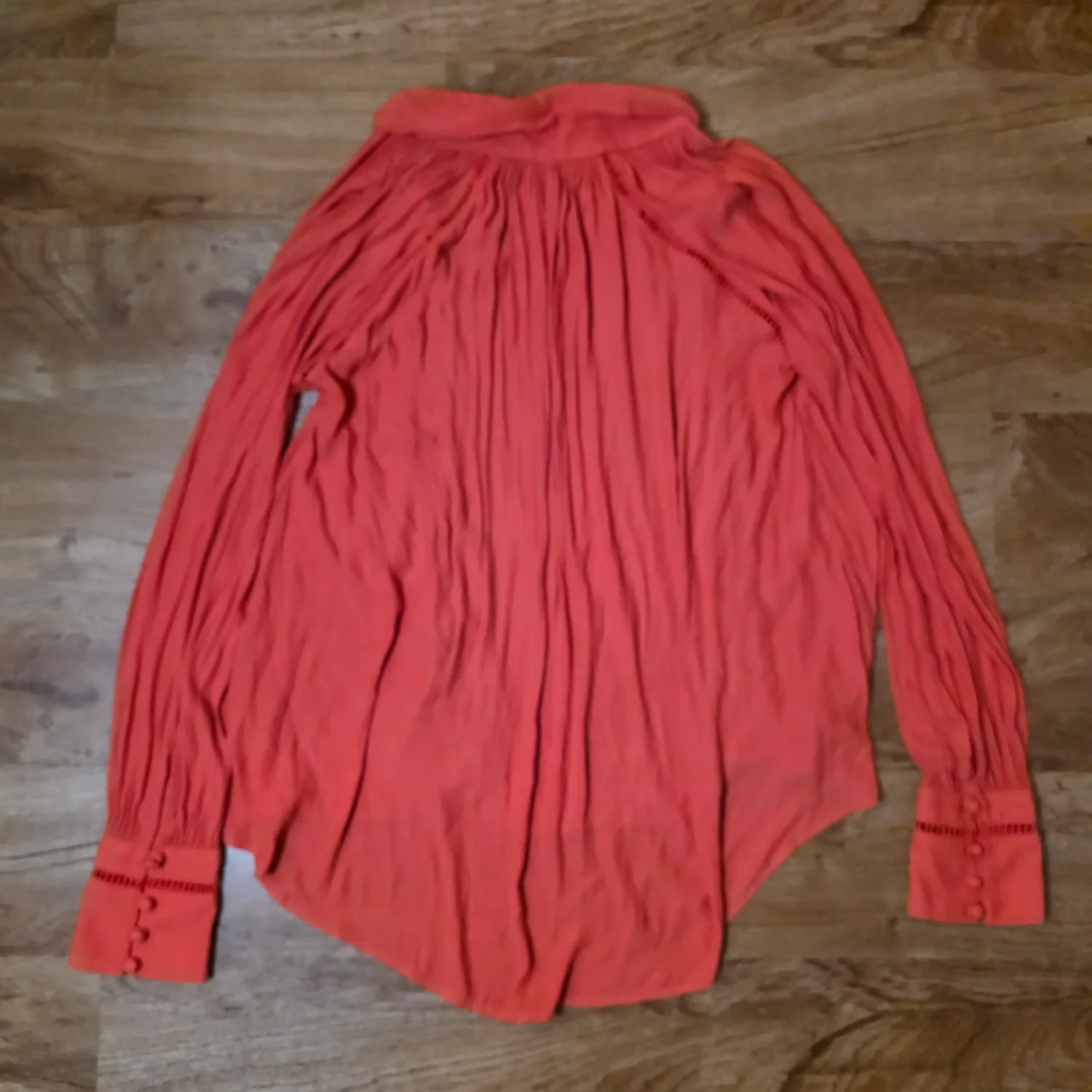 Free People Orange Button Up Tie Collar Long Sleeve Blouse