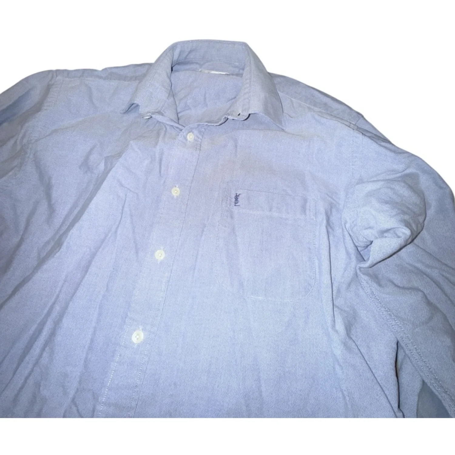 Elegant Yves Saint Laurent shirt in sky blue. Ideal for versatile styling. Neck about 16 inches Arm pit to arm pit about 21 inches Sleeve length about 30 inches Length neck down is about 31 inches