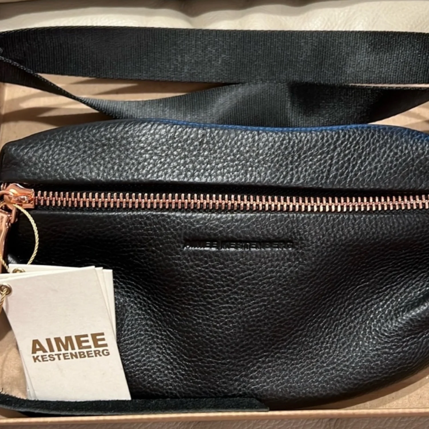 Elevate your everyday look with this sleek Aimee Kestenberg leather belt bag. Crafted from glove-tanned leather with rose gold hardware, this versatile bag can be worn as a fanny pack, crossbody, or waist bag. Perfect for hands-free style and convenience! ✨ Details: • Brand: Aimee Kestenberg • Color: Black with rose gold hardware • Material: Genuine glove-tanned leather • Size: 11”W x 6”H x 0.75”D • Adjustable belt strap: 25”–40” • Features: • Interior zip pocket • Back exterior slip pocket with magnetic snap closure • Secure top zipper closure • Condition: New without use (slight marks on buckle – see photos) • Weight: Approx. 0.75 lbs 🌟 Why You’ll Love It: • Stylish yet practical • Perfect for travel, concerts, shopping, or daily errands • Designer quality with signature hardware details Aimee Kestenberg Bag | Leather Belt Bag | Fanny Pack Crossbody | Designer Waist Bag | Rose Gold Hardware | Travel Bag | Hands-Free Bag | Concert Festival Bag | Black Leather Purse