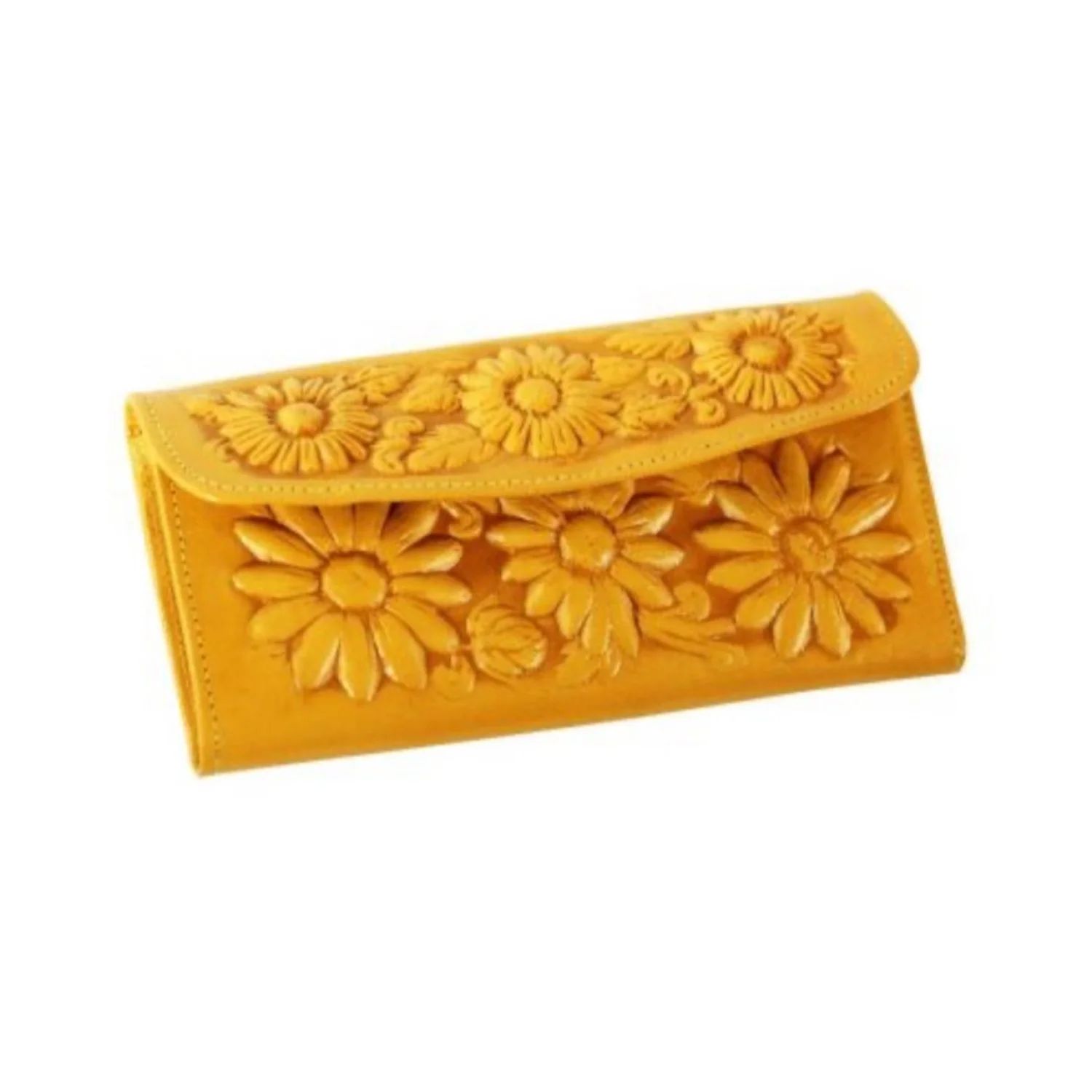 Vintage Tooled Leather Wallet Clutch Floral Embossed Yellow Mustard Boho