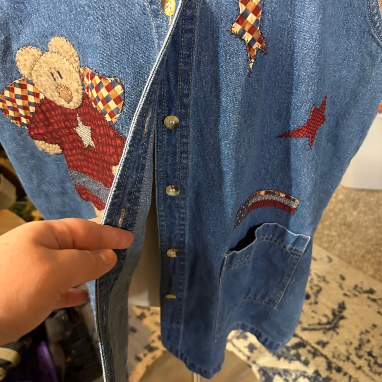 This women's denim vest by Haiks features charming patchwork appliqué designs, including a teddy bear and stars, adding a whimsical touch to your outfit. The vest provides two front pockets and has an easy snap button closure. Made of 100% cotton, it ensures comfortable wear and durability. Size 2X, perfect for layering over shirts or dresses. Ideal for casual outings or adding a unique style statement. #vintage #denim #patchwork #cottagecore #teacher