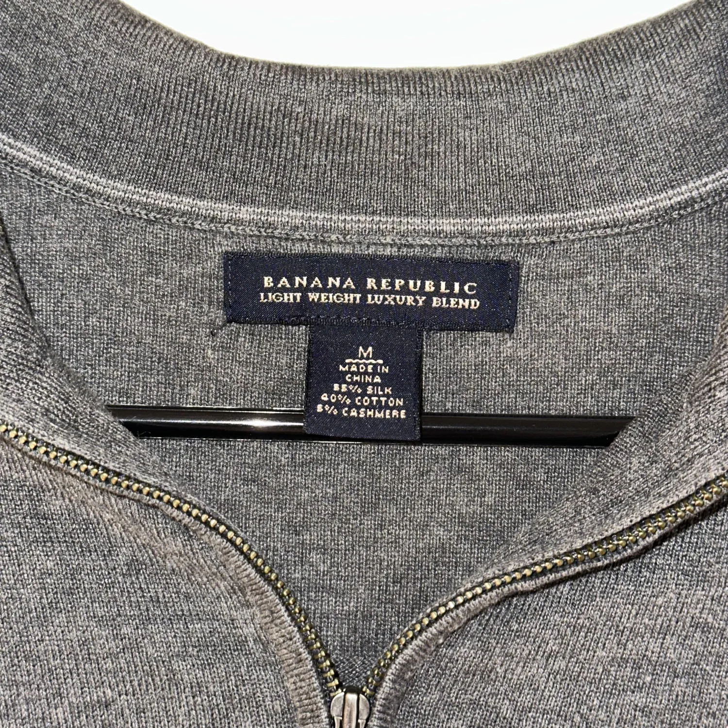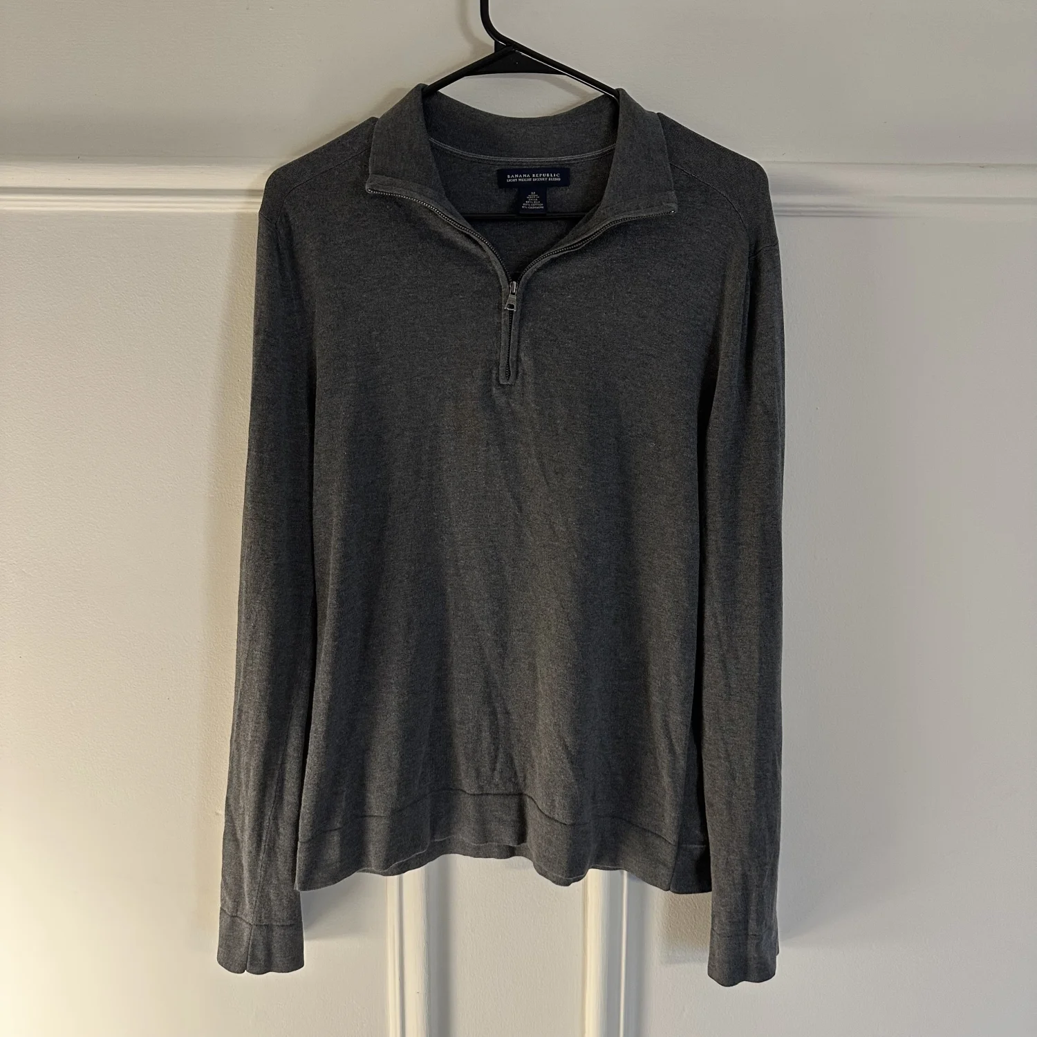This quarter zip is very lightly worn and is soft to the touch. Banana Republic light weight luxury blend (cotton, silk, and cashmere). Care: hand wash cold