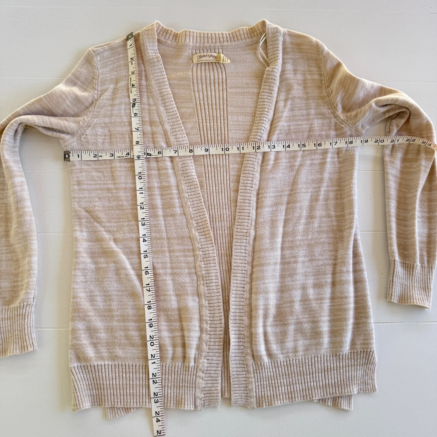 Preowned and in good condition with normal wear. No major flaws noticed. Please see all pictures for full details. Details: • Brand: Faded Glory • Size: Women’s Small (4–6) • Color: Bare Beige (Cream / Ivory) • Style: Open Front Cardigan • Sleeves: Long sleeve • Pockets: Yes • Style Number: HFGL14354 • UPC: 080859443401 • Made in China Material: • 58% Cotton • 42% Acrylic Care Instructions: • Machine wash warm with light colors • Gentle cycle • Use only non-chlorine bleach if needed • Tumble dry medium • Do not iron Stored in a smoke-free, pet-free home. Ships same day if purchased before 12 PM EST.