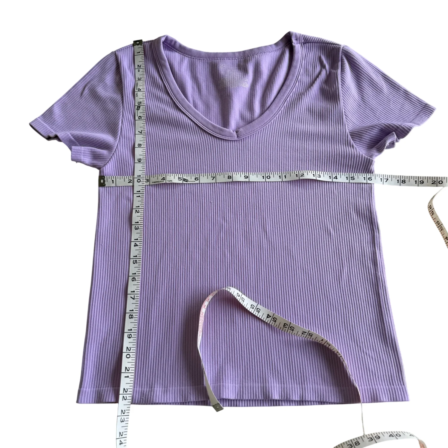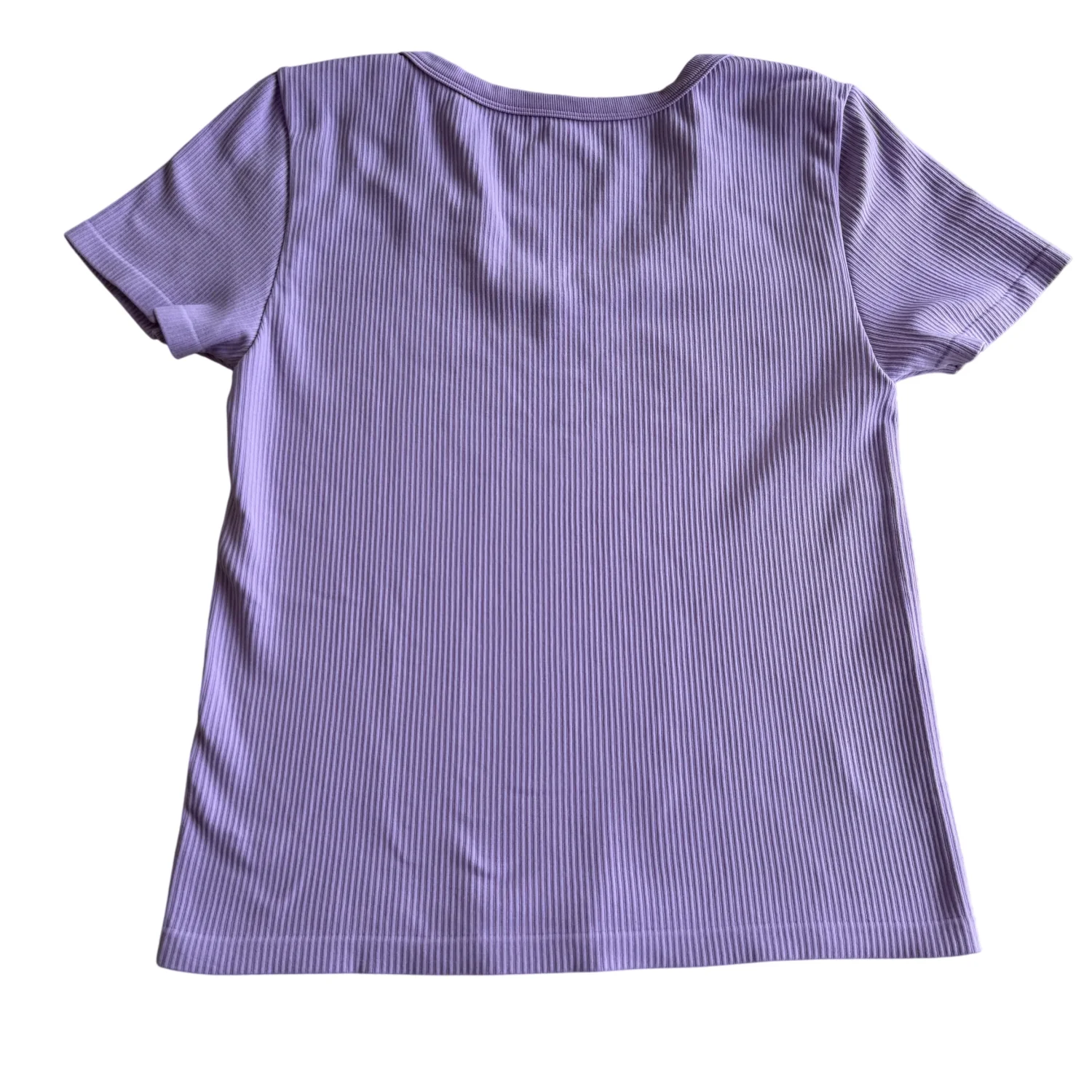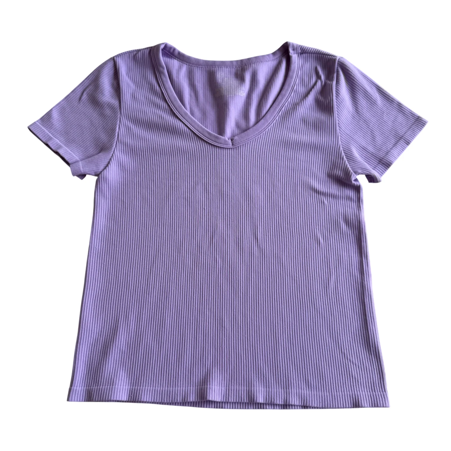 This ribbed lilac V-neck T-shirt is made from a soft and stretchy fabric, featuring short sleeves and a classic fit. Perfect for casual wear, this top adds a pop of color to any outfit. Ideal for layering, it's comfortable and stylish. Machine washable. Condition: Preowned, Gently used with light pilling as show in picture, please see all pictures for full details. #casual #lilac #ribbed