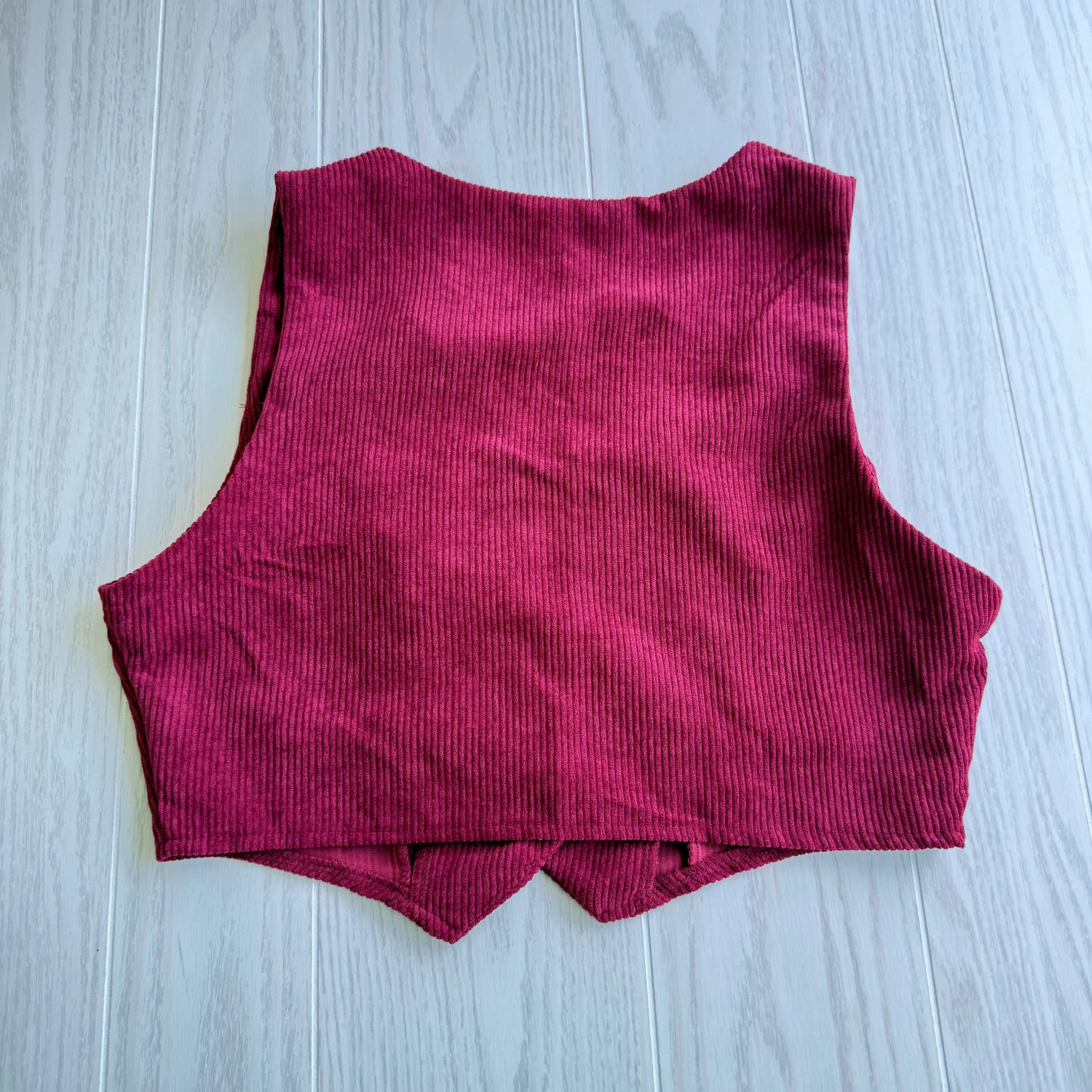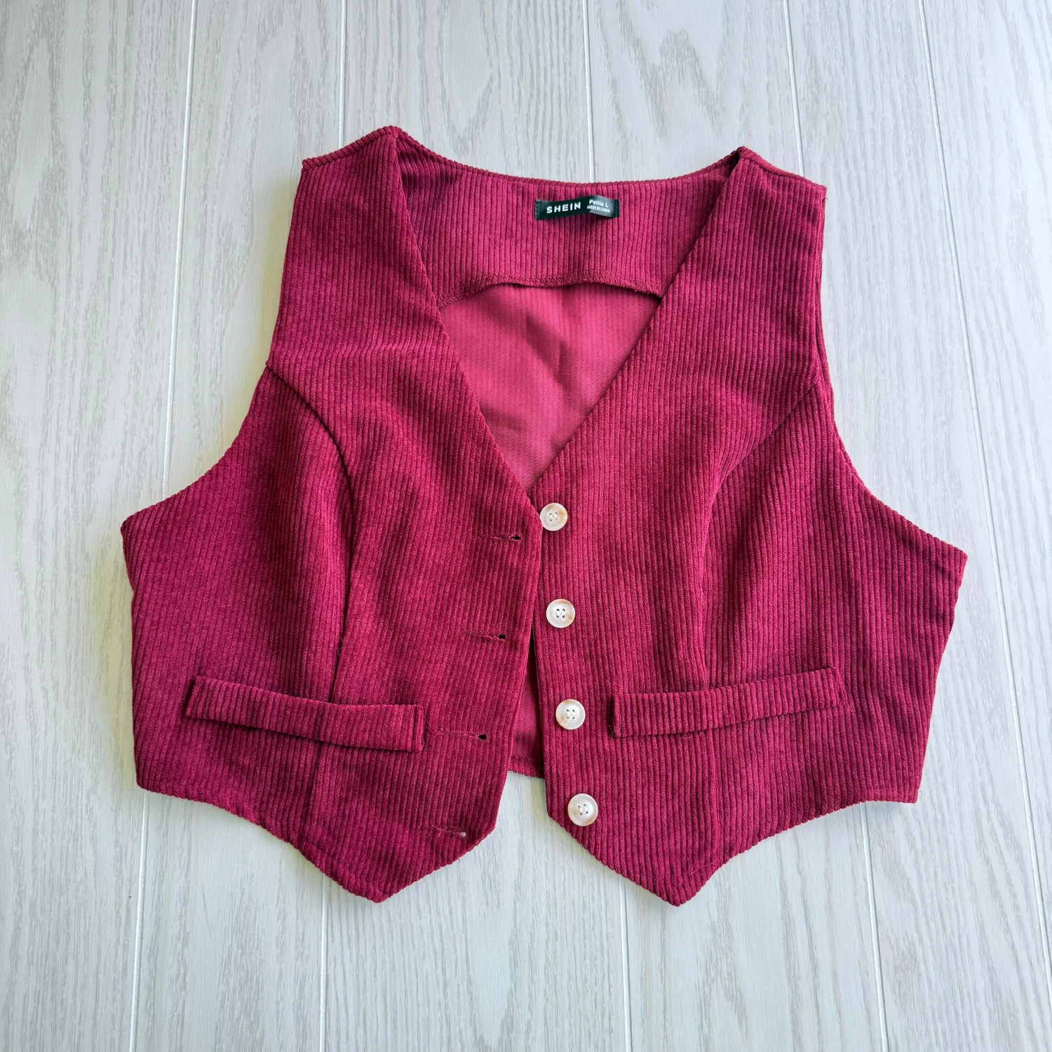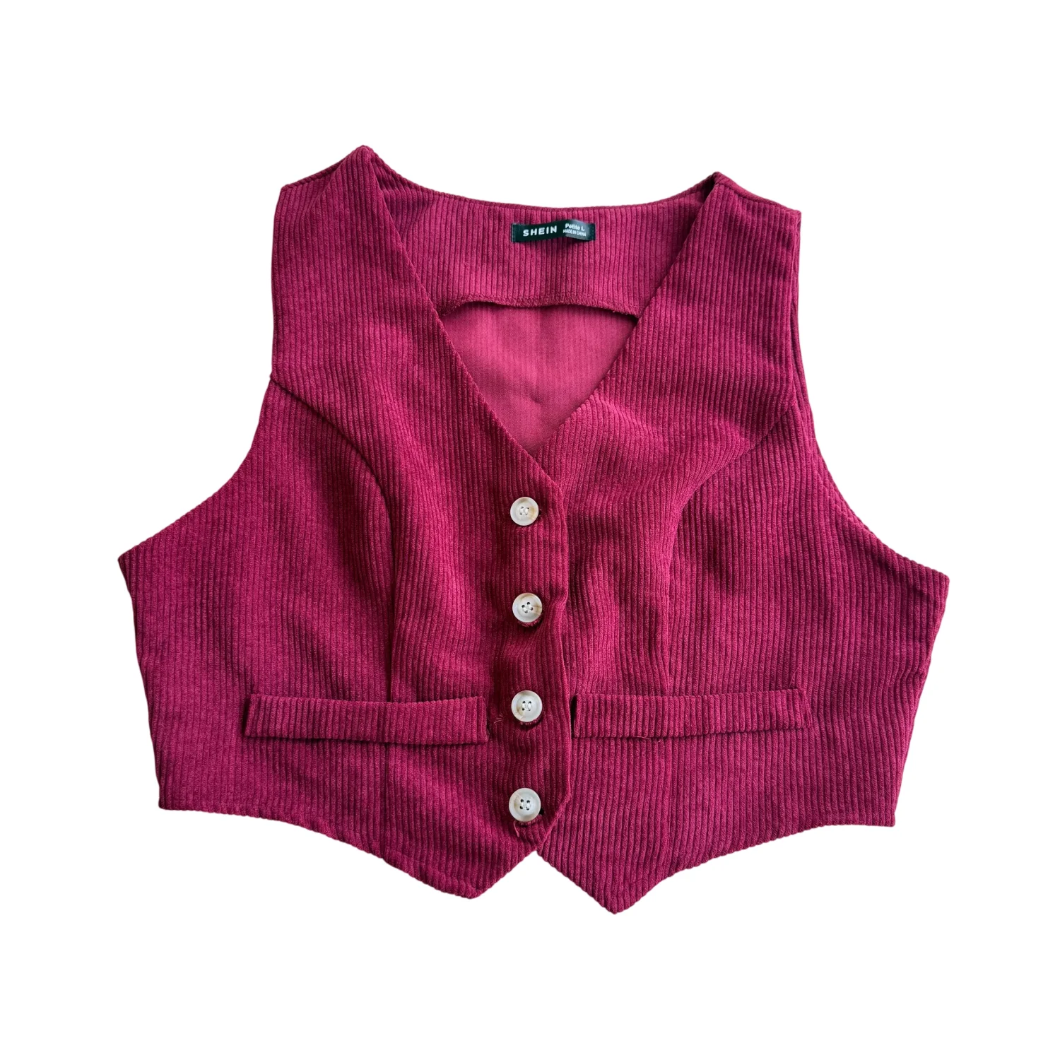This red corduroy vest features a classic button-up design with four contrasting buttons and two faux pockets for added style. Made by Shein, the vest is crafted from a textured fabric that gives it a trendy vintage look. Perfect for layering over blouses or shirts for a chic outfit. Size L as per the tag, ensuring a comfortable fit. Ideal for casual to semi-formal occasions. #vintage #corduroy #vest