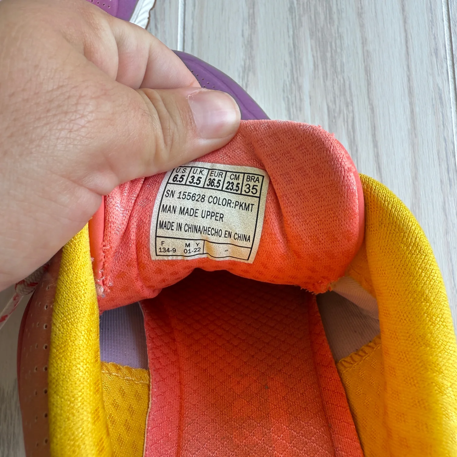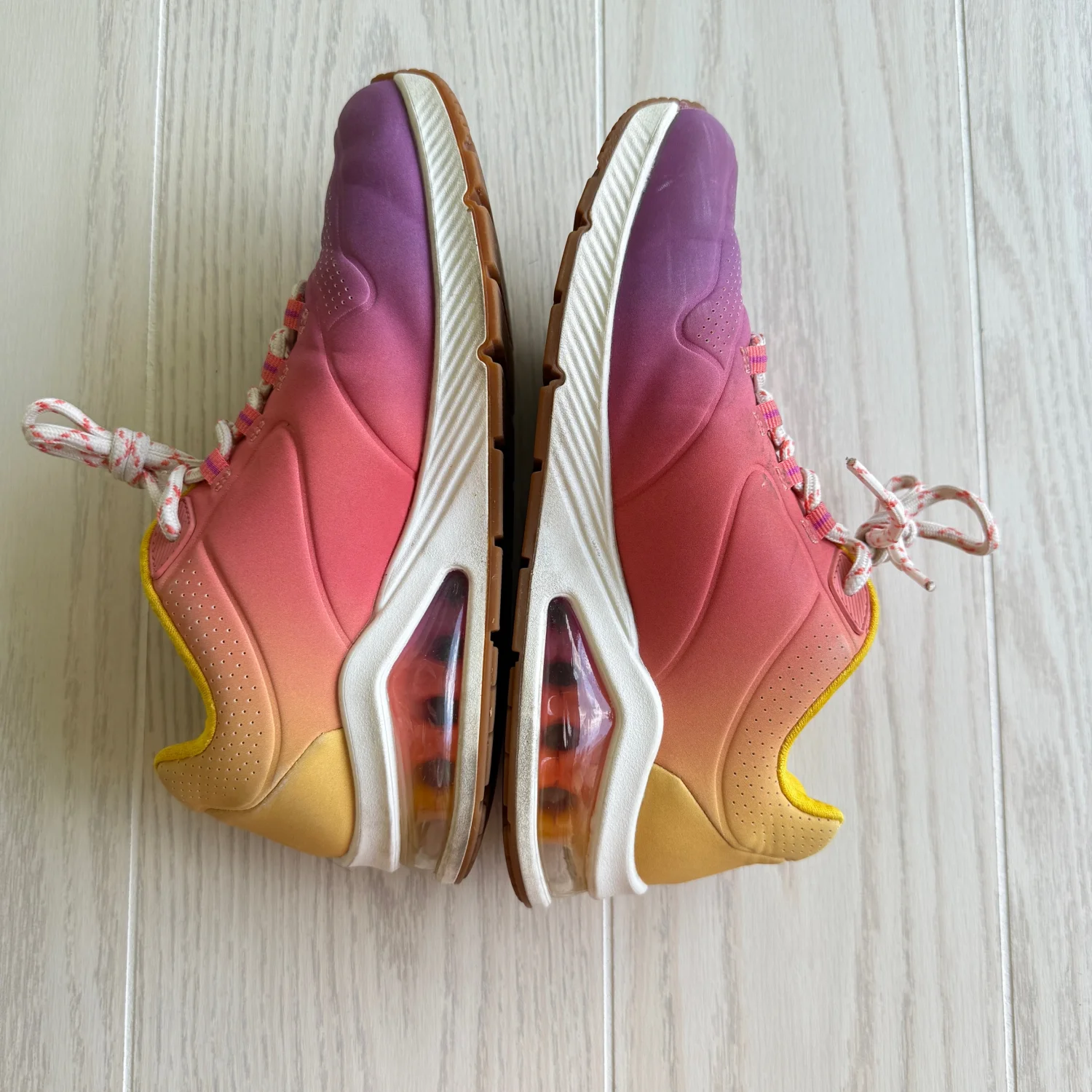 These vibrant sneakers feature a striking gradient design in purple, pink, and yellow. They have a man-made upper and are equipped with a cushioning sole for comfort. The shoes are in good condition with minor signs of wear on the soles. Perfect for adding a pop of color to any casual outfit. Size US 6.5, these sneakers have both style and functionality. Item Number: 155628.PKMT Box: No Condition: Pre-owned shoes with a worn-in look. They have visible signs of wear, but are still functional and ready for daily use. Please see all pictures for full details. #sneakers #colorful #casualwear