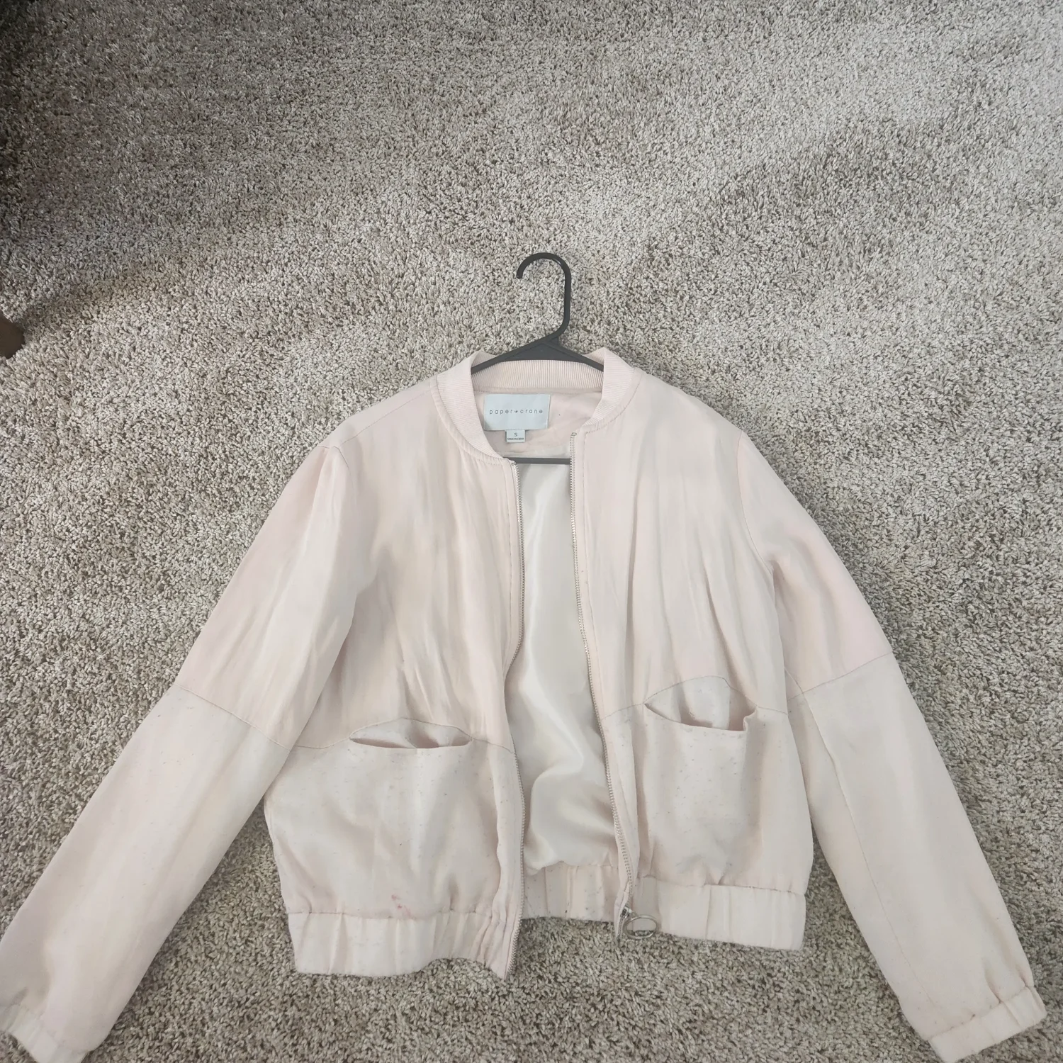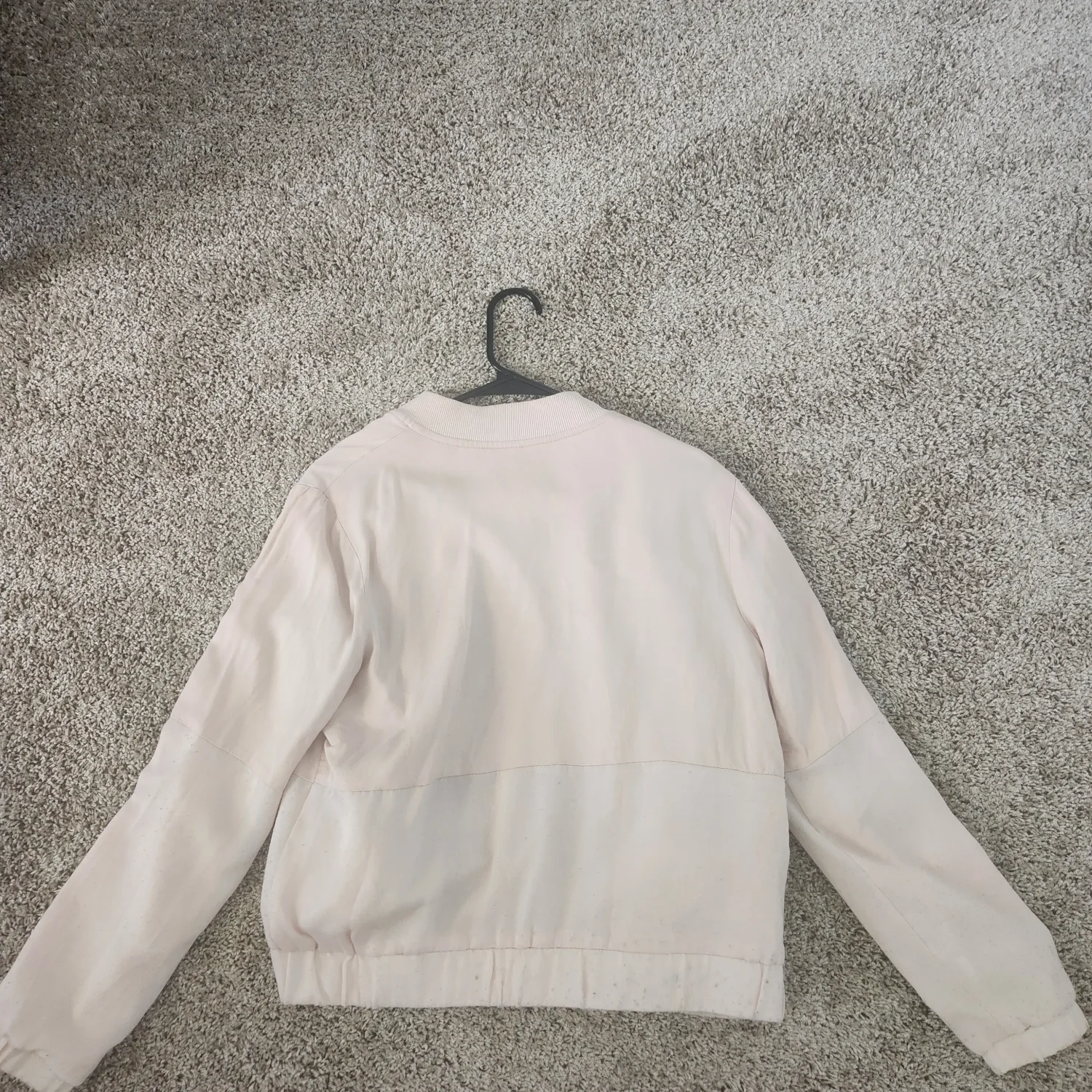 Add a soft, feminine touch to your wardrobe with this chic blush pink lightweight jacket. Designed with a modern, minimalist silhouette, this piece features a full front zipper, ribbed collar, and elasticized hem and cuffs for a comfortable, flattering fit. The jacket includes stylish front pockets and subtle panel detailing that gives it a contemporary, elevated look. Its lightweight material makes it perfect for layering during Spring and Fall or for cool Summer evenings. Condition: Gently worn with light signs of wear. DISCLAIMER: There is a red mark near the bottom of the rim, originally present from initial purchase (see photos for details). Still plenty of life left and perfect for everyday casual outfits. Pair it with jeans and sneakers for a relaxed look or throw it over a dress for effortless style.