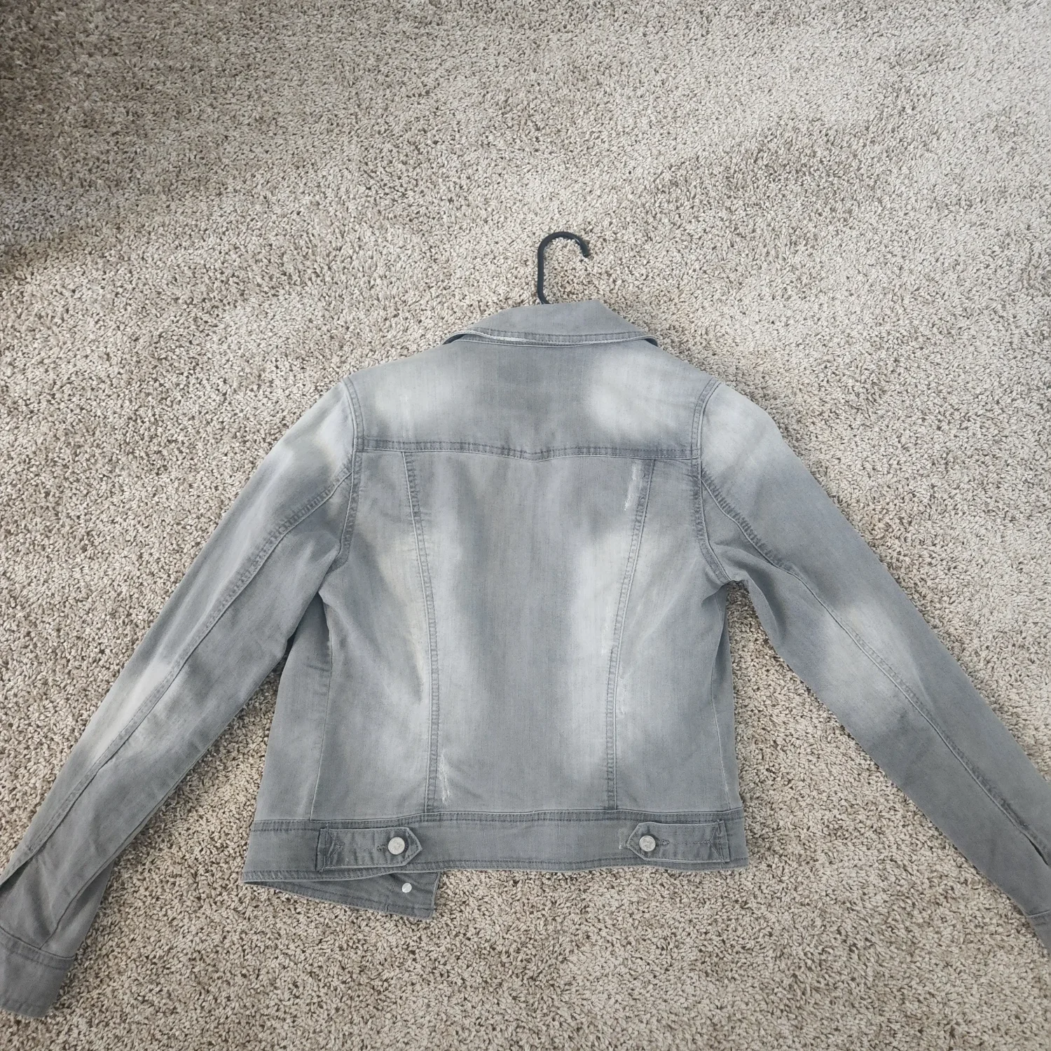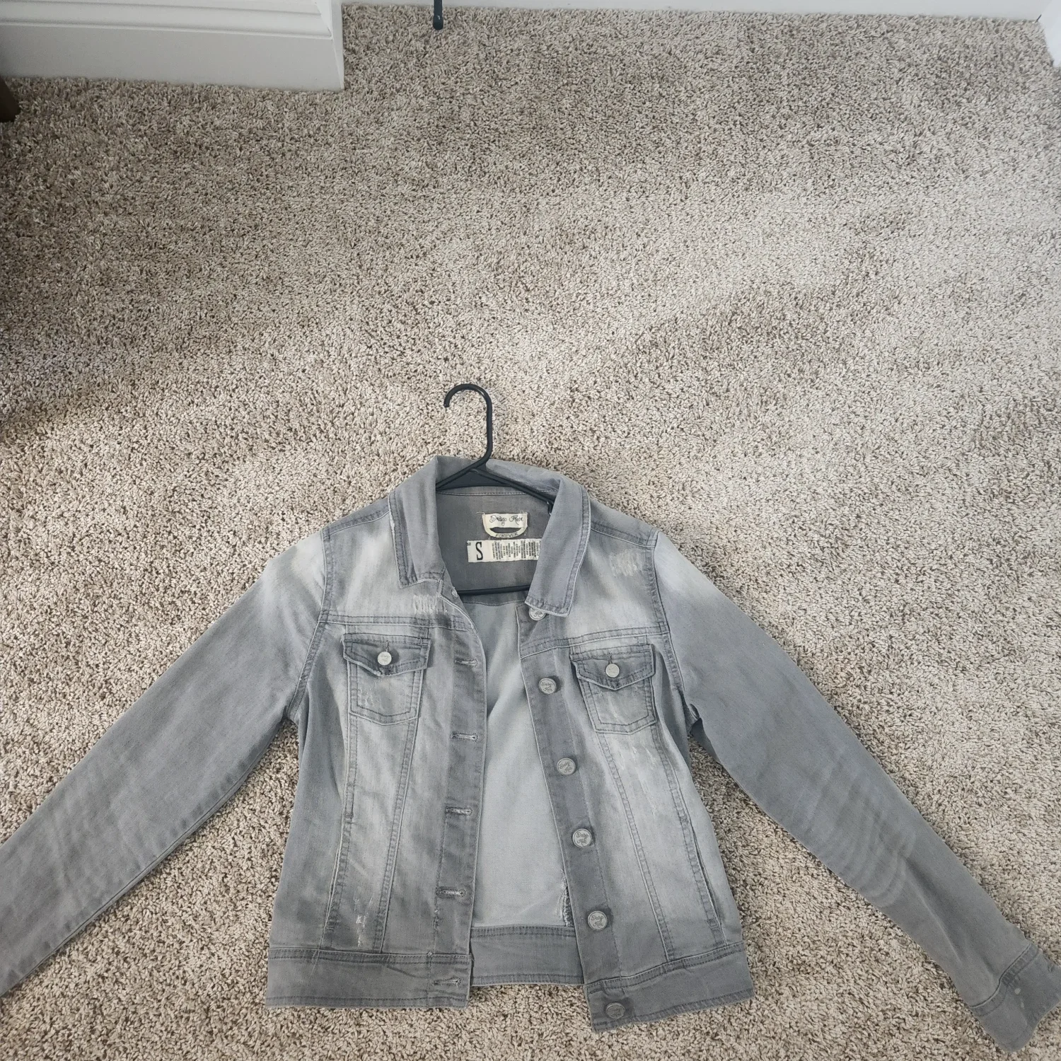 Add an effortlessly cool layer to your wardrobe with this grey distressed denim jacket in size Small. Featuring a classic button-front design, chest flap pockets, and a flattering fitted silhouette, this jacket blends timeless style with a modern, worn-in wash. The soft grey denim is accented with subtle fading and light distressing details for a laid-back, lived-in look. Perfect for pairing with leggings, dresses, or your favorite jeans, this versatile piece transitions easily from season to season.