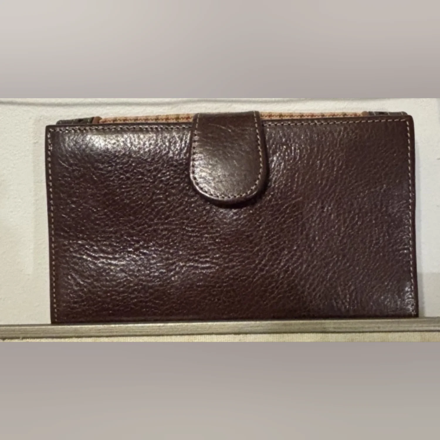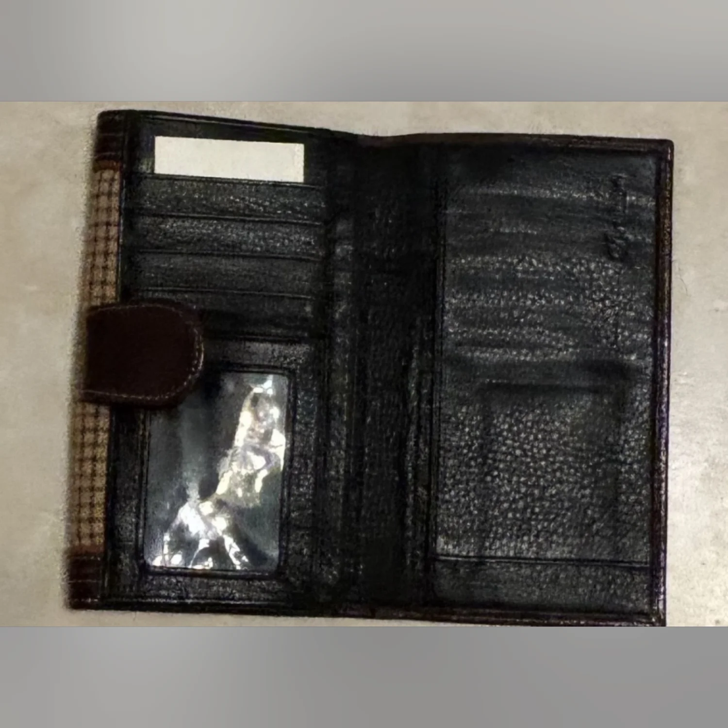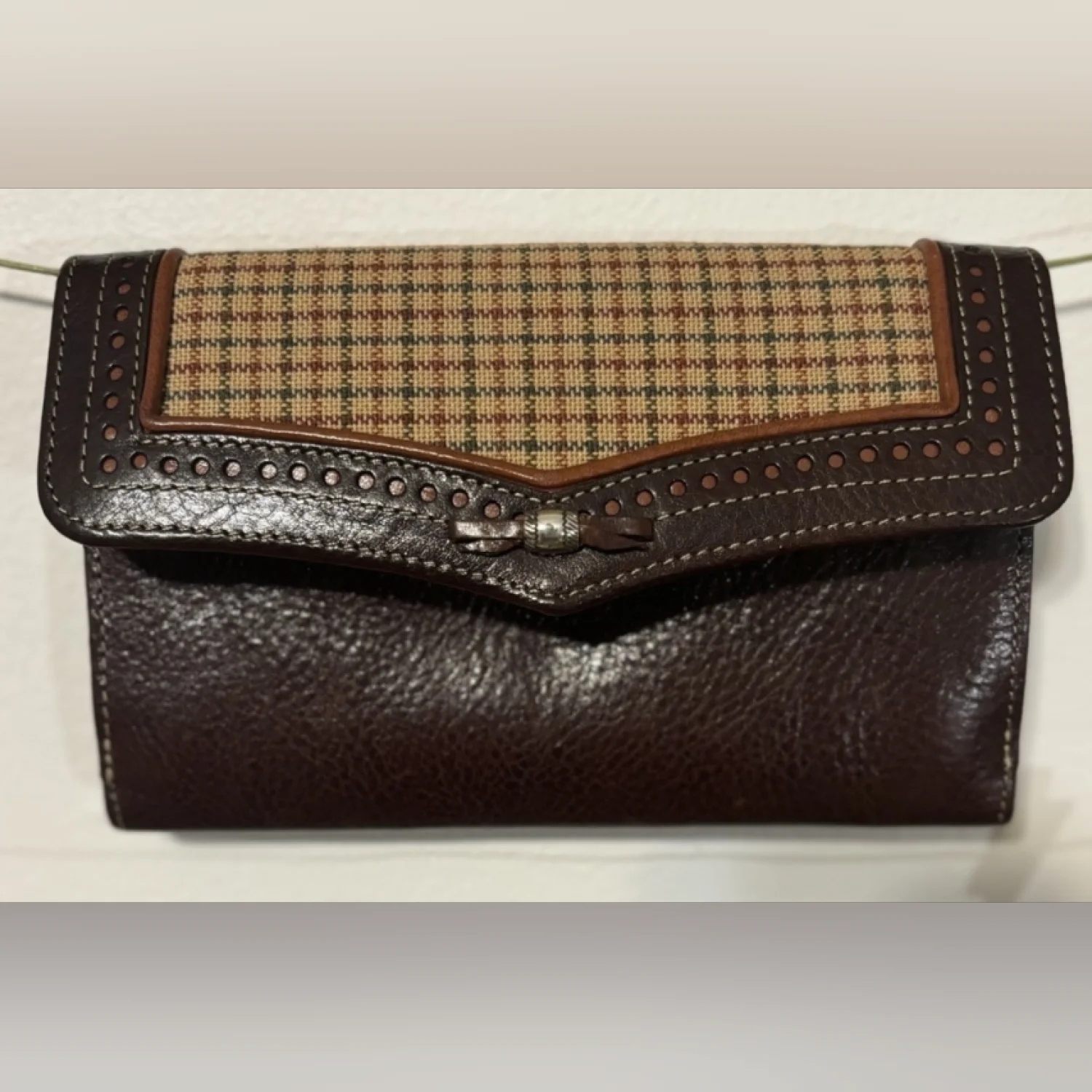 Vintage Brighton Brown Leather Clutch Wallet Bag with a plaid type front. Missing the strap to style as a shoulder bag or wear cross-body, an outside pocket, a wallet side with card slots. Approximate measurements: 7’’ long, 4’’ high, strap 65’’.Good used condition.