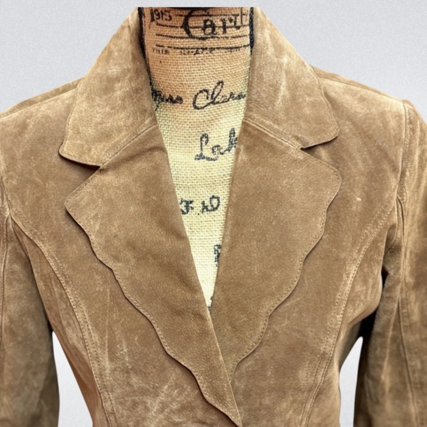 Vintage blazer that is very Chic and can be dressed up or worn with your favorite pair of jeans. two pockets and buttons and long sleeves. Fully lined Light tan color 100% Soft Sueded Leather Gently pre-owned in great condition. No stains or damage.