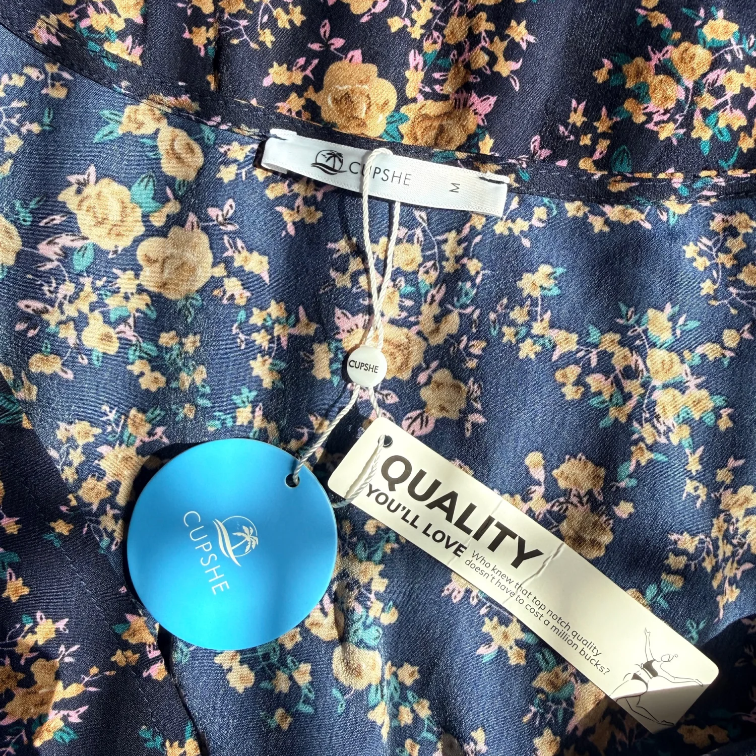 Brand: Cupshe Size: Medium Condition: New with tags Color: Navy with yellow/pink floral print Style: Long sleeve, V-neck, elastic waist, mini dress Material: 100% Polyester Description: Cupshe floral mini dress with long sleeves and elastic waist. Lightweight fabric. New with tags attached.