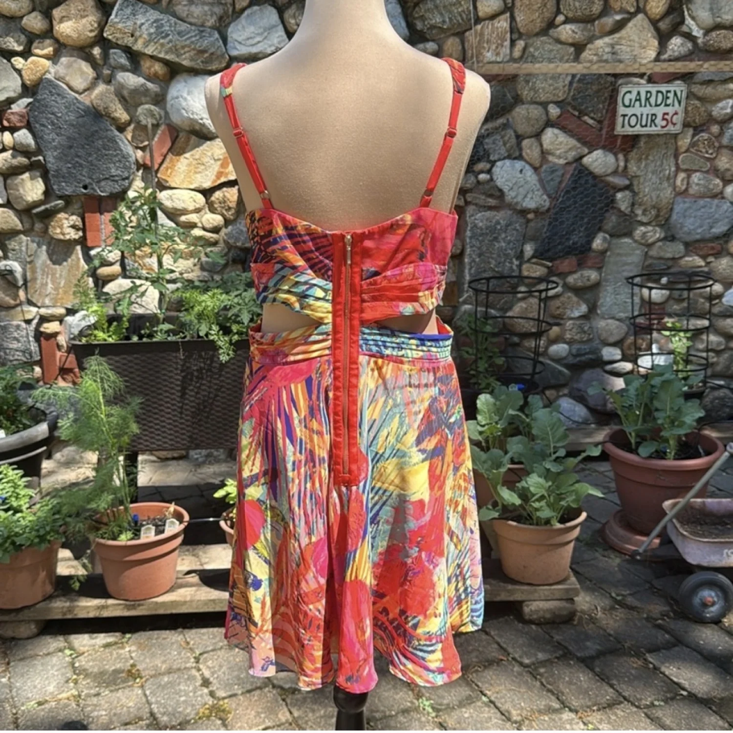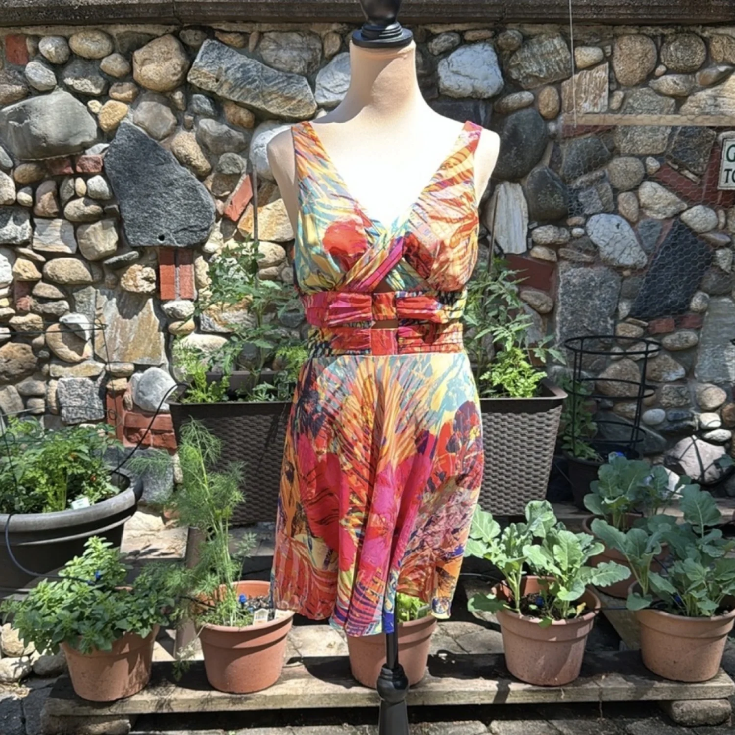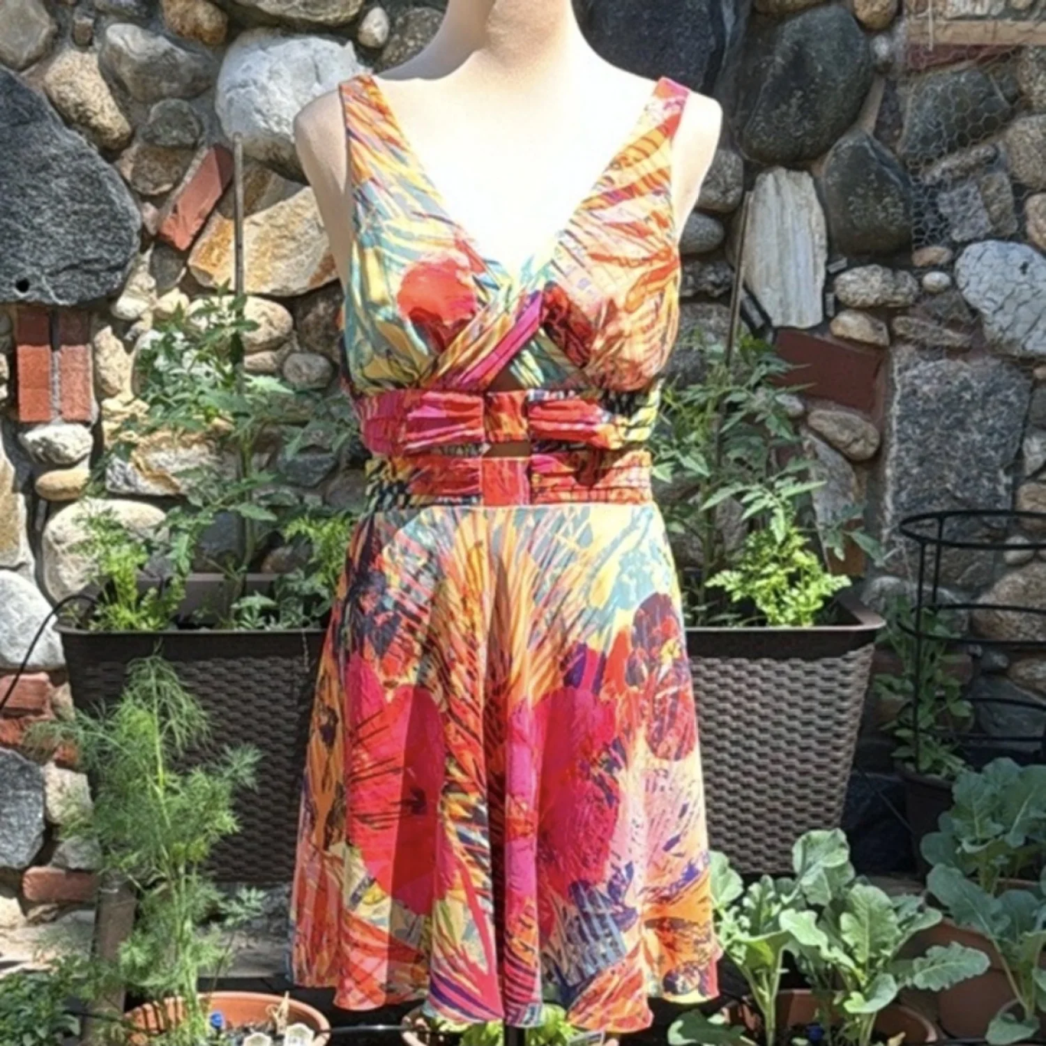 Tropical watercolor floral blooms and palms in rich orange, yellow, pinks, purple and greens chiffon dress. This fully lined, gold tone back zipped, sleeveless, v-neck dress has revealing flirty cutouts at the waist with a breezy figure flattering silhouette. Size 10 35" from shoulder to hem Shell and lining: 100% Polyester Hand wash Great for a summer event, resort wear, tropical vacation, wedding guest, formal, bridal shower, girl’s night out. #summer, #cocktail, #tropical
