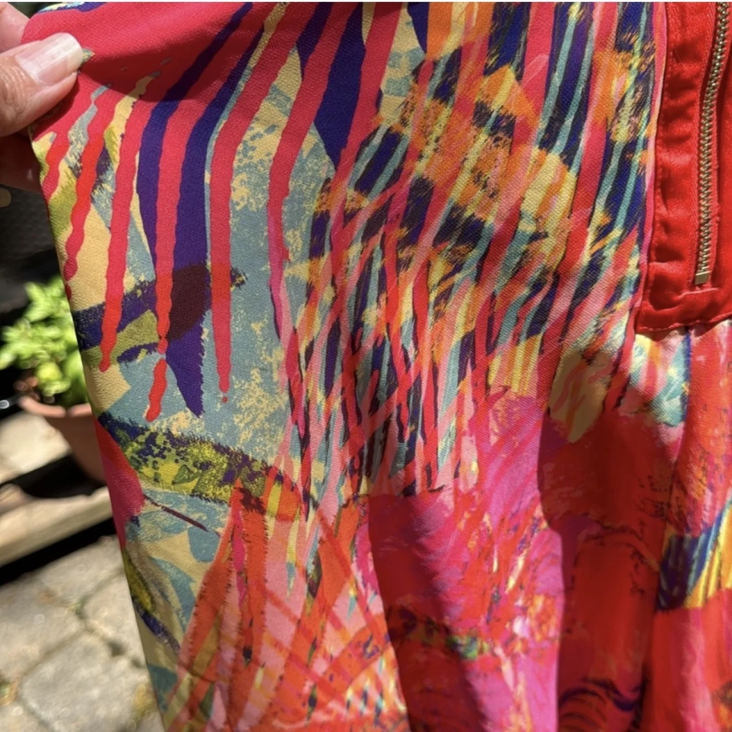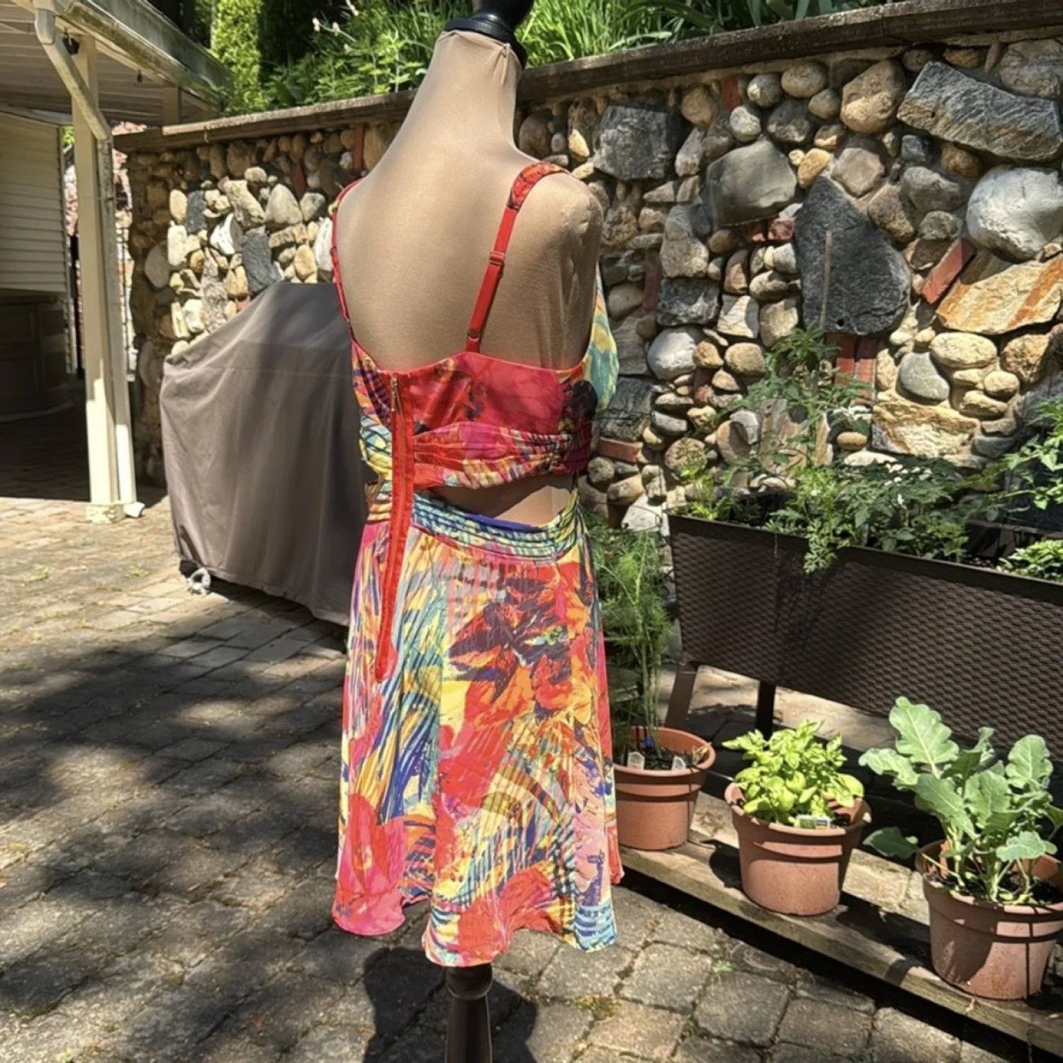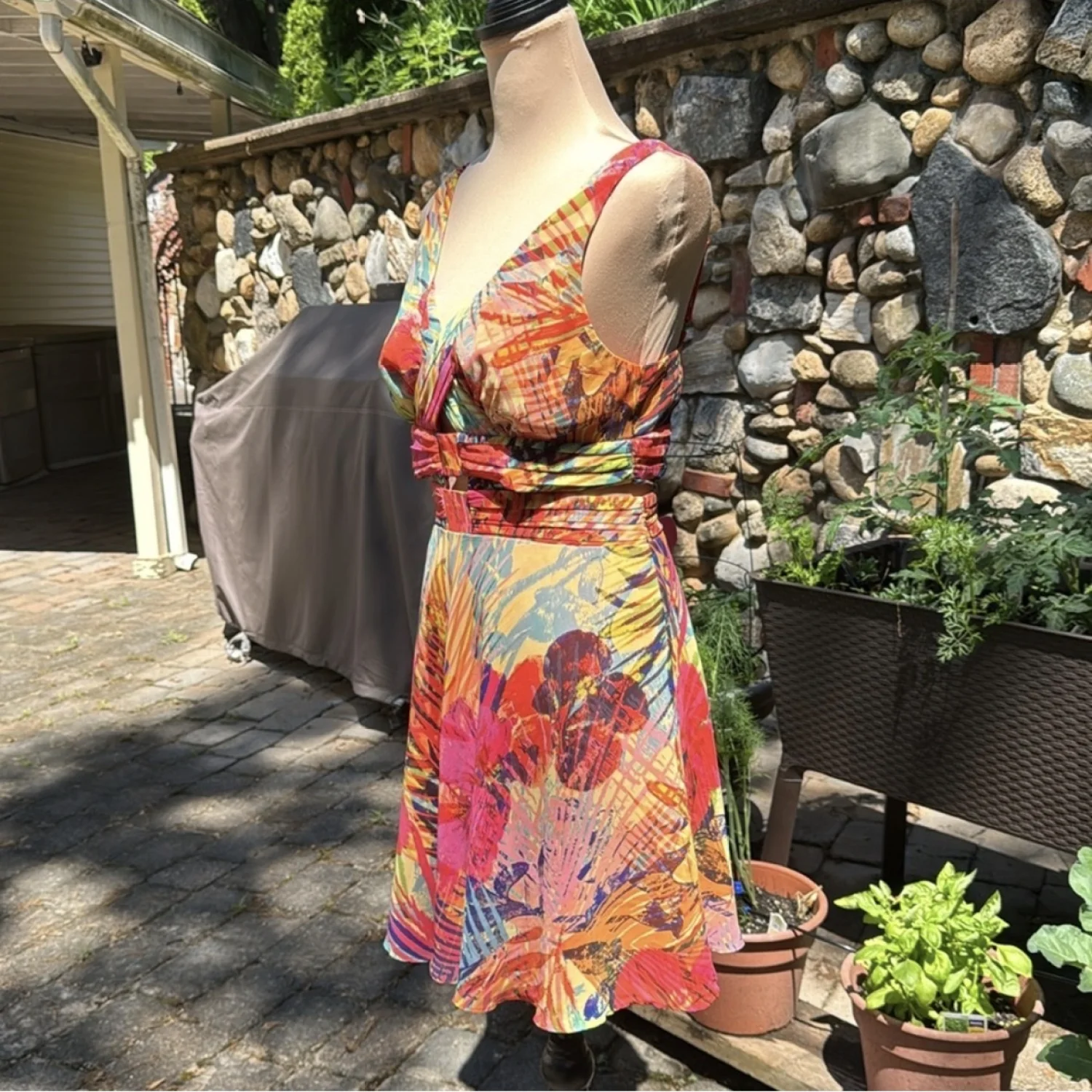 Tropical watercolor floral blooms and palms in rich orange, yellow, pinks, purple and greens chiffon dress. This fully lined, gold tone back zipped, sleeveless, v-neck dress has revealing flirty cutouts at the waist with a breezy figure flattering silhouette. Size 10 35" from shoulder to hem Shell and lining: 100% Polyester Hand wash Great for a summer event, resort wear, tropical vacation, wedding guest, formal, bridal shower, girl’s night out. #summer, #cocktail, #tropical