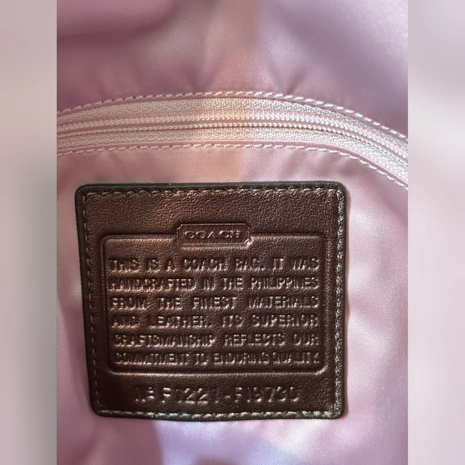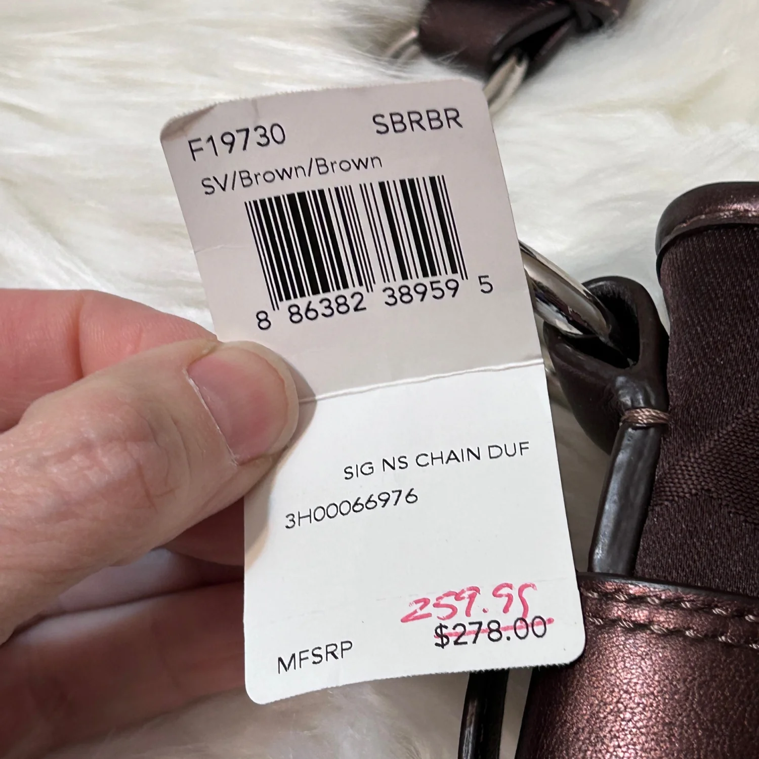 This is a NWT Coach Signature Optic Chain Convertible Shoulder Bag, style F19730 Description: Color/Material: Features a dark brown sateen signature exterior with shimmery bronze leather trim, bottom, and straps. Hardware: Silver-tone hardware accents, including a chain detail across the front. Closure: Top zip closure. Strap: A convertible strap system allows for use as a double-strap shoulder bag (approx. 9.5" drop) or a single long strap for crossbody wear (approx. 21" drop). Interior: Pink fabric lining with one interior zip pocket and two slip pockets. Size: Medium size